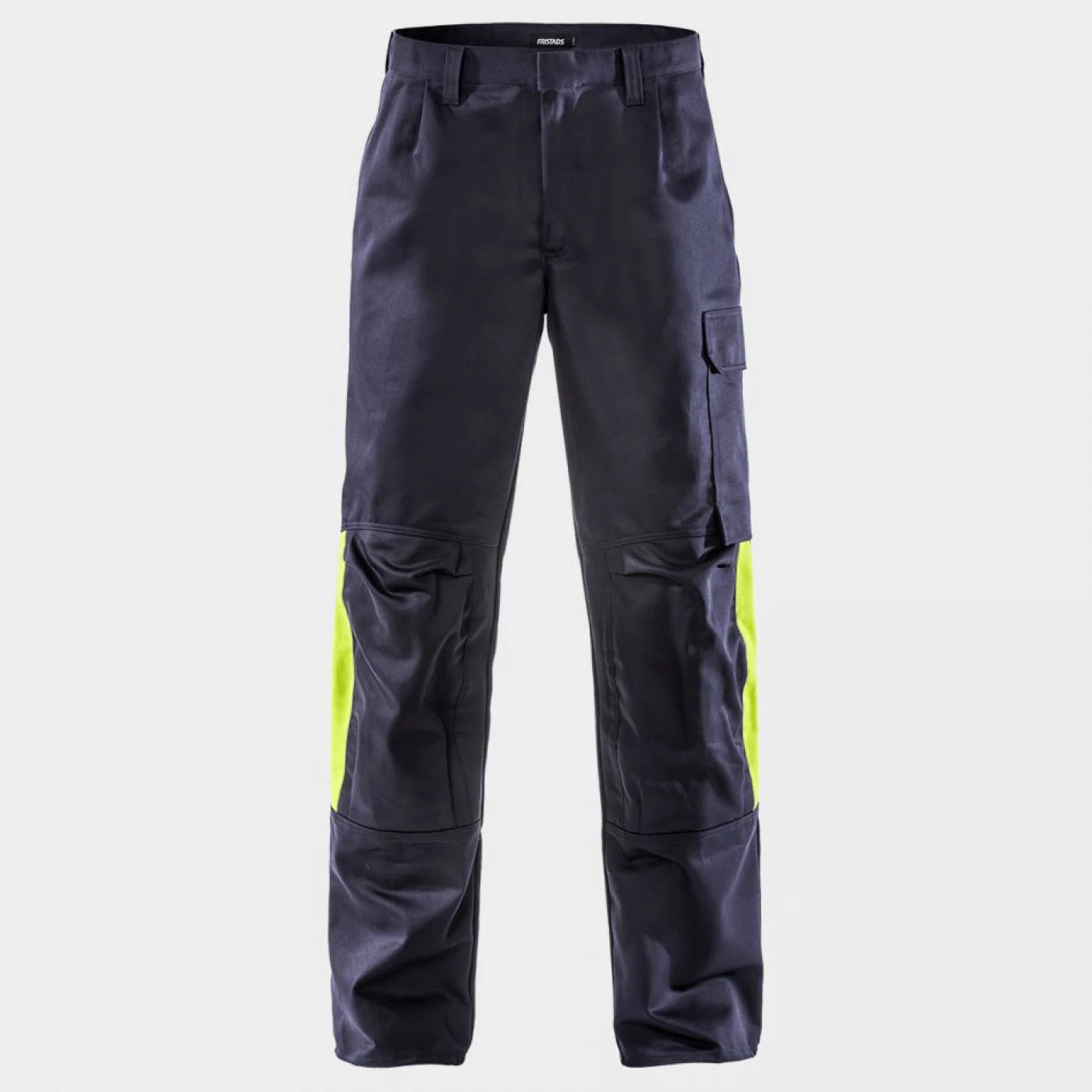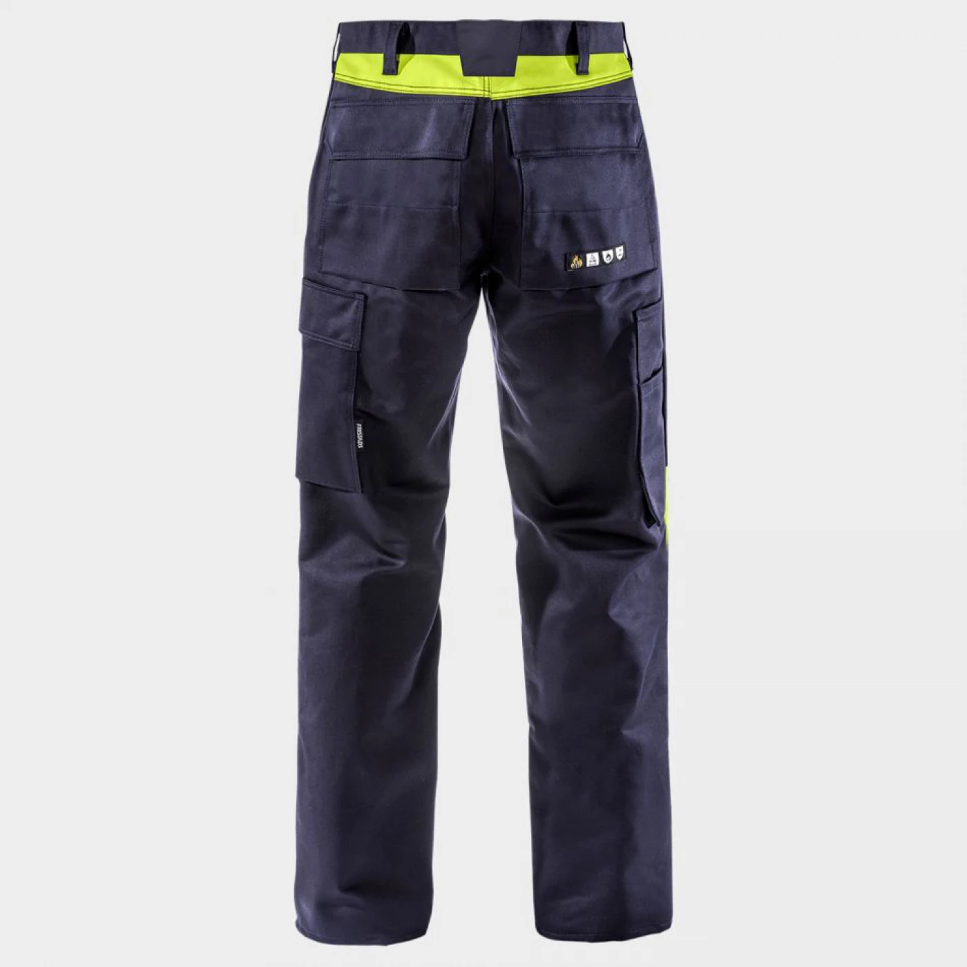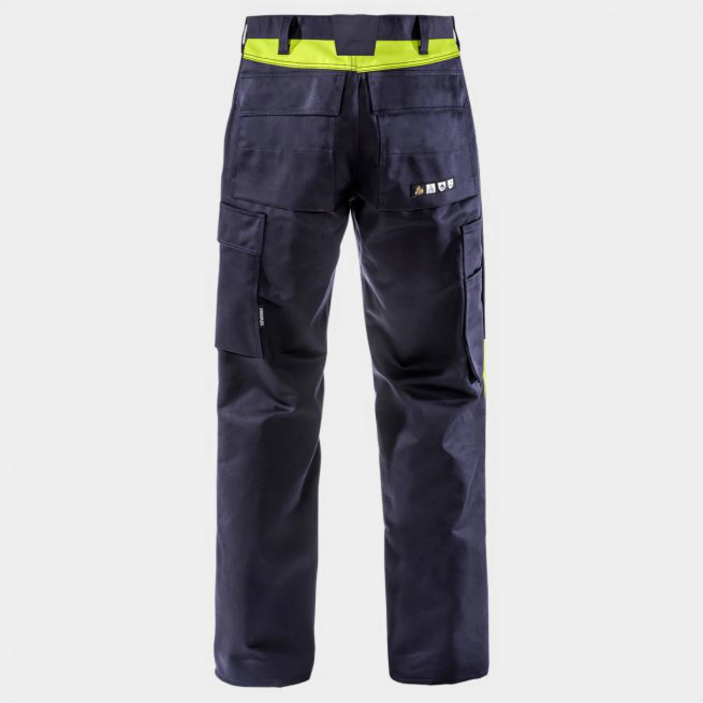 Pantaloni ignifugi pentru sudură, cu protecție ridicată împotriva metalului topit și confort excelent datorită conținutului de bumbac, certificați pentru spălare industrială până la 50 de cicluri.