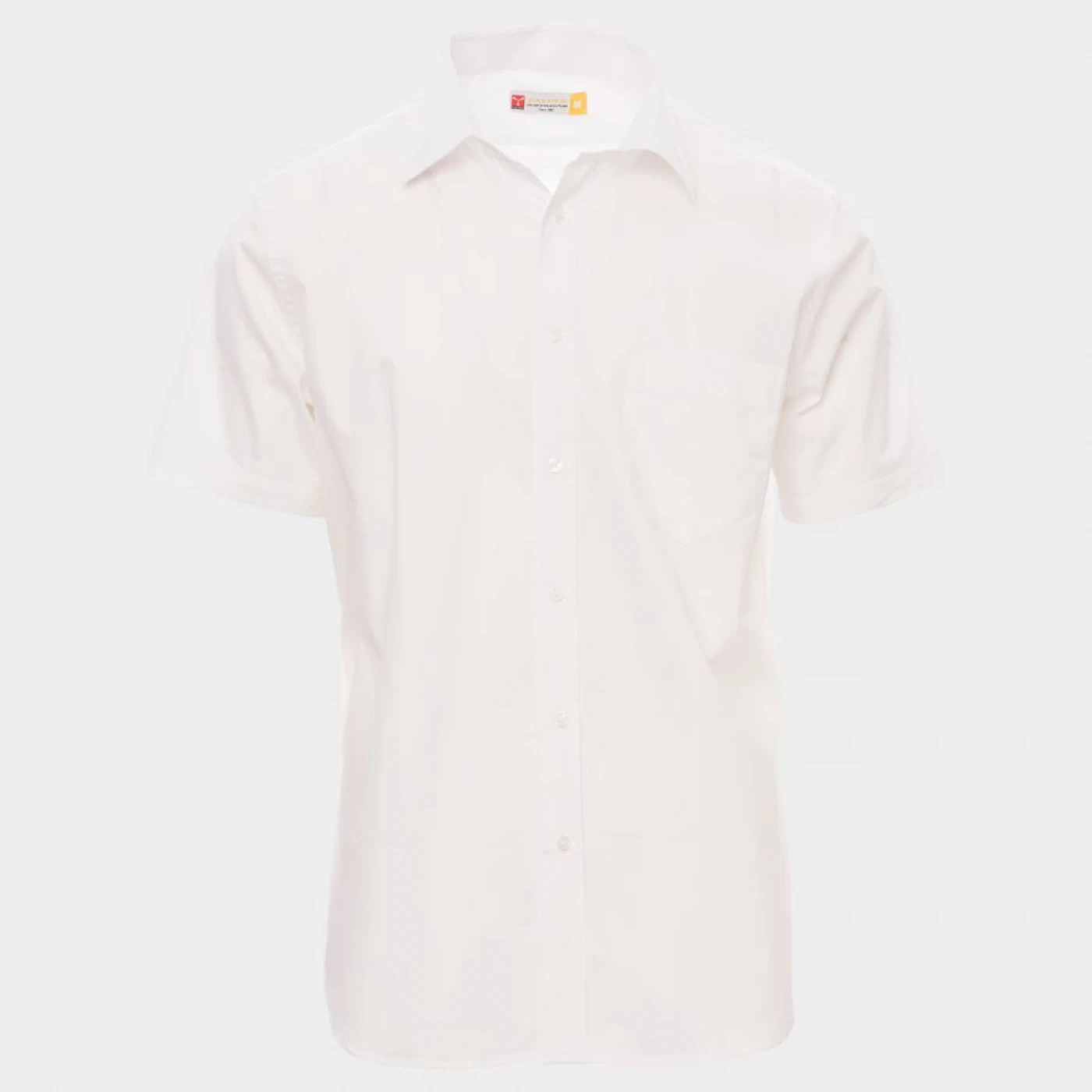 Cămașă pentru bărbați cu mânecă scurtă din bumbac fin, cu o siluetă ușor mulata, guler în stil italian și nasturi în ton. Un buzunar la piept, placă pe spate și pliuri.