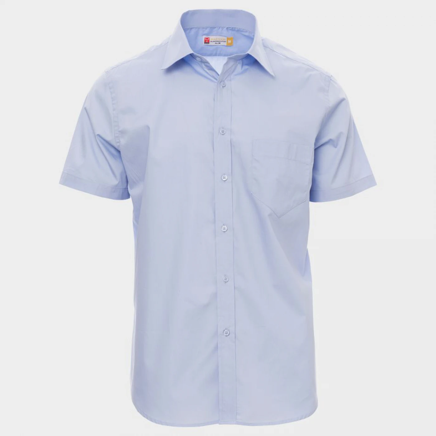 Cămașă pentru bărbați cu mânecă scurtă din bumbac fin, cu o siluetă ușor mulata, guler în stil italian și nasturi în ton. Un buzunar la piept, placă pe spate și pliuri.