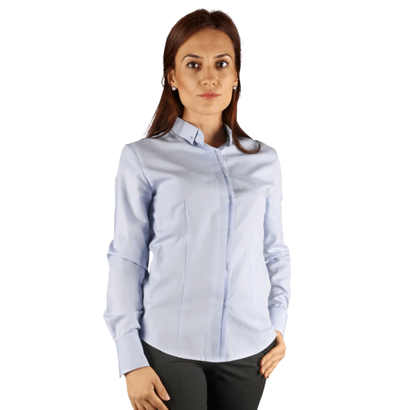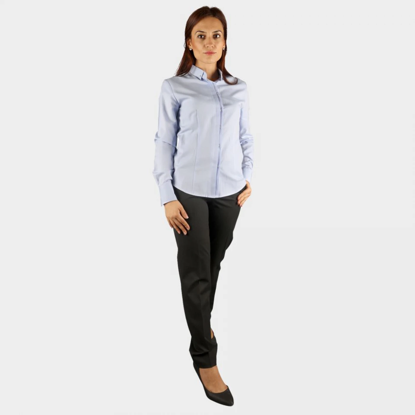 Cămașă de damă, mulată, cu mâneci lungi și guler mic în stil italian. Închidere ascunsă, manșetă cu doi nasturi.