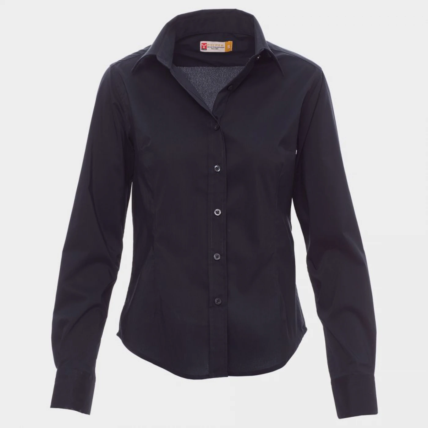 Cămașă de damă, silueta mulată cu pliuri la față și la spate, placă pe spate. Guler în stil italian, manșete cu doi nasturi.