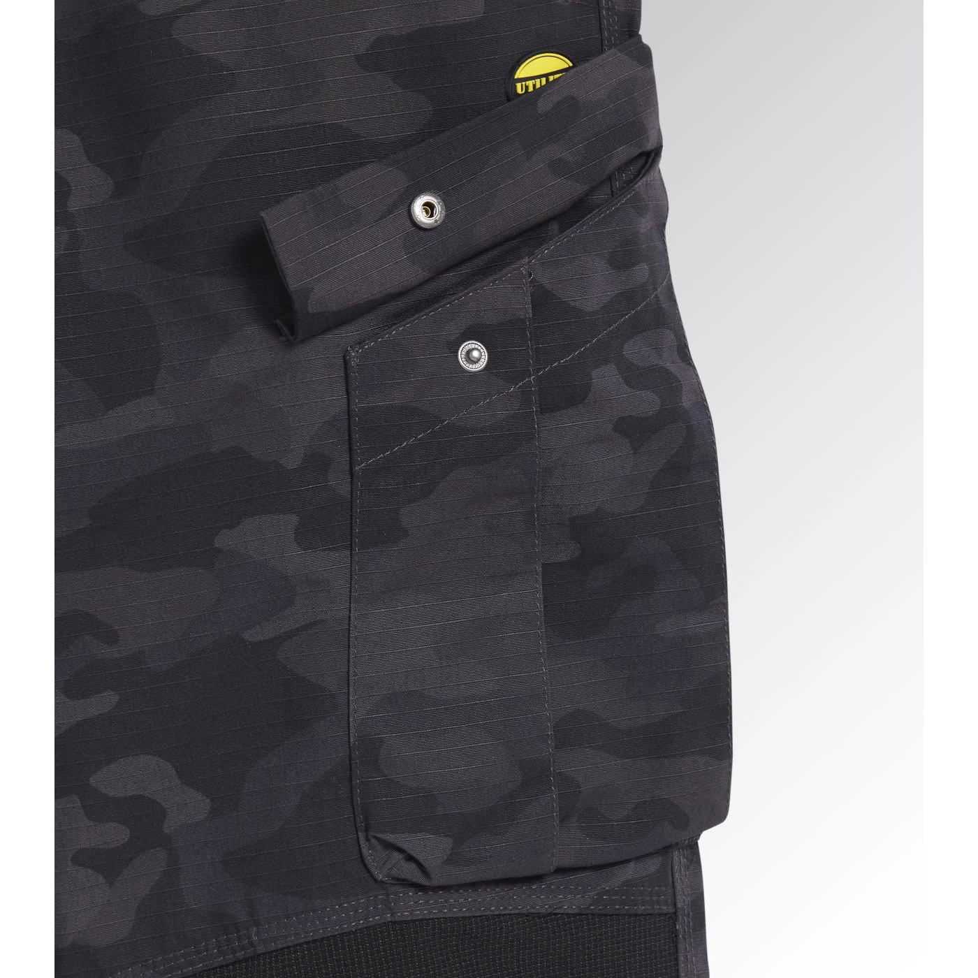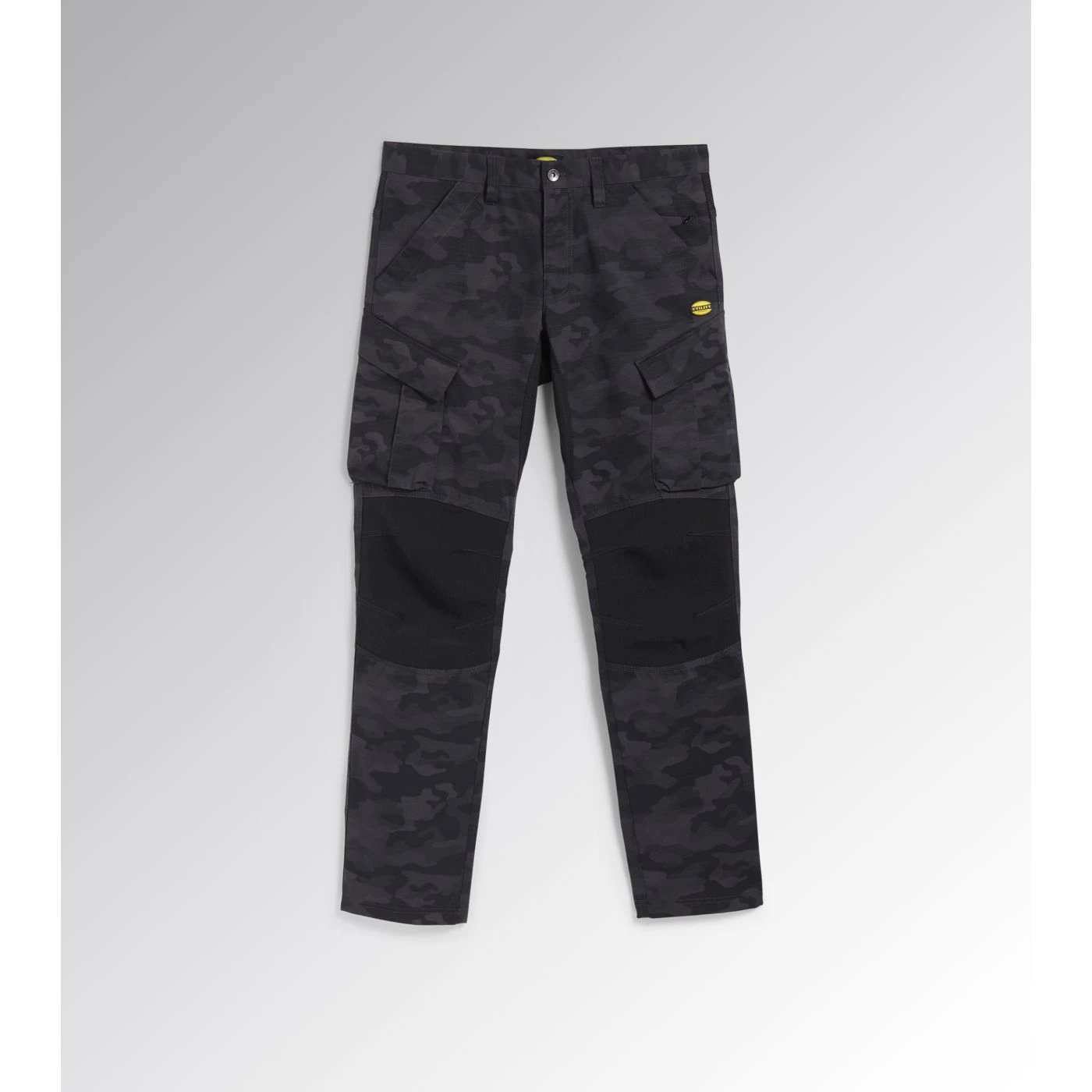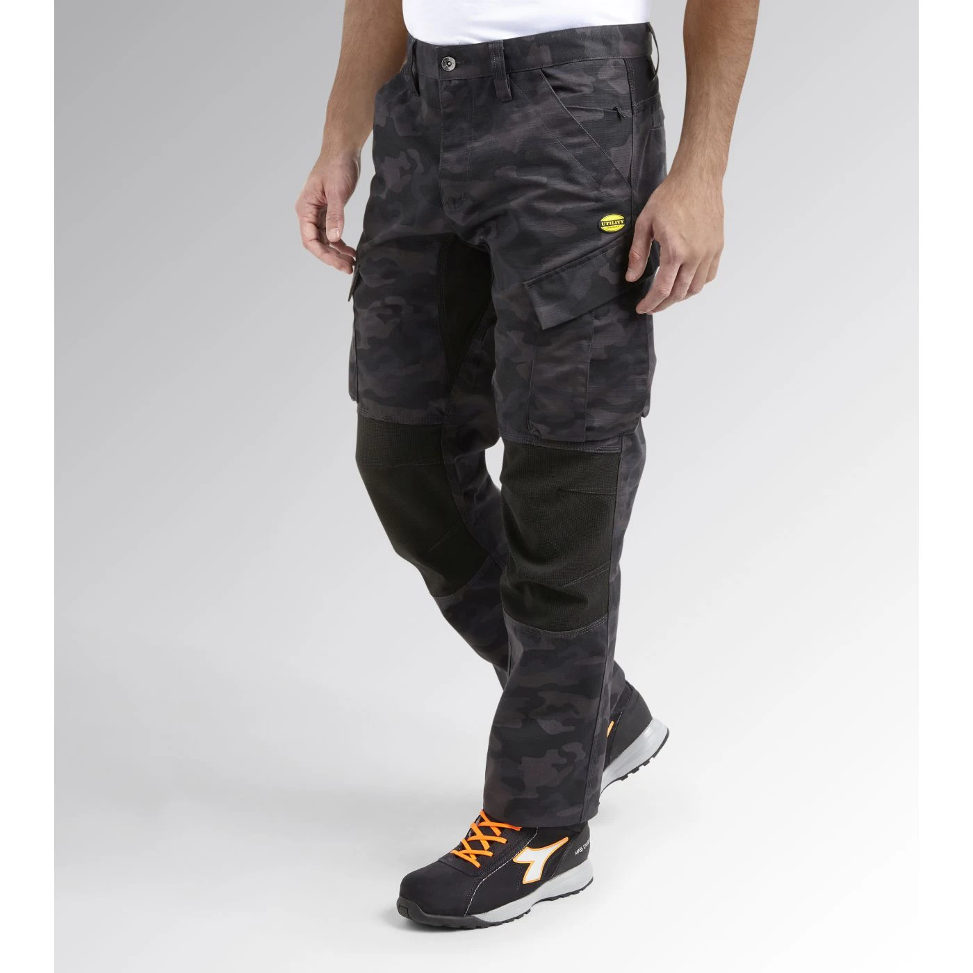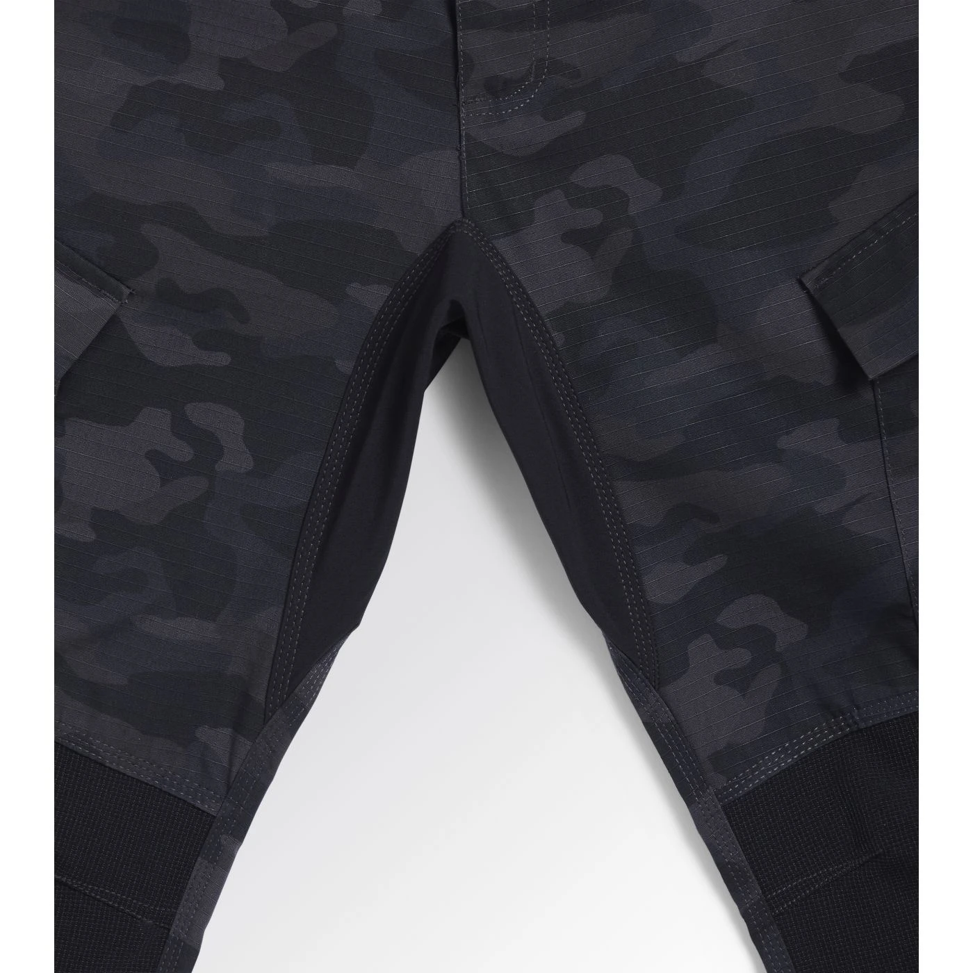Cargo trousers made of durable ripstop fabric with camouflage pattern. Two large side pockets, insert in strong stretch fabric, insert in stretch fabric on crotch and rear yoke for greater freedom of movement. Triple stitching.