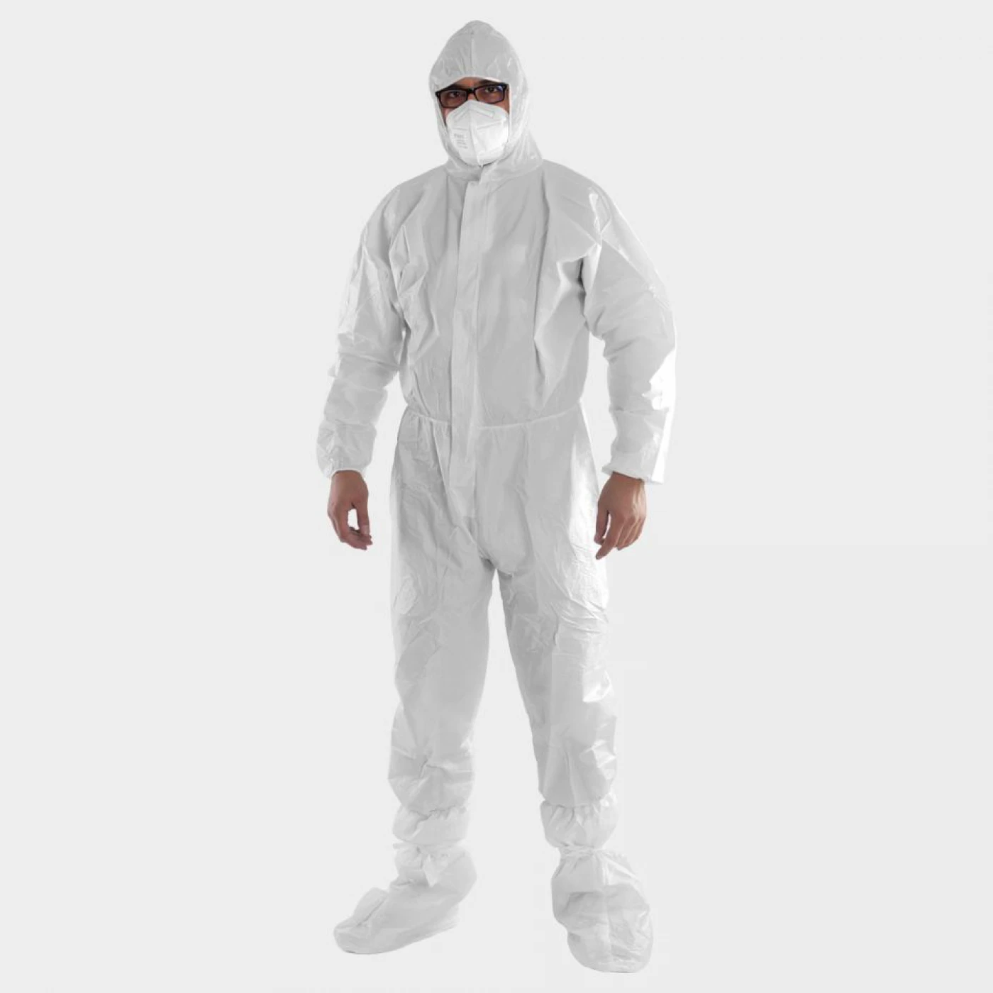 Combinezon antipraf cu glugă de unică folosință, laminat cu film microporos, antistatic. Protejează împotriva substanțelor chimice, a particulelor radioactive și infecțioase. Categorie CE III, tip 5, 6.