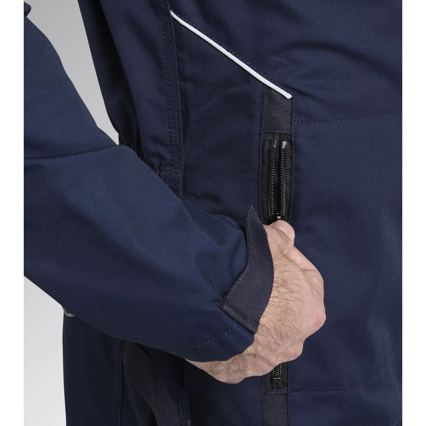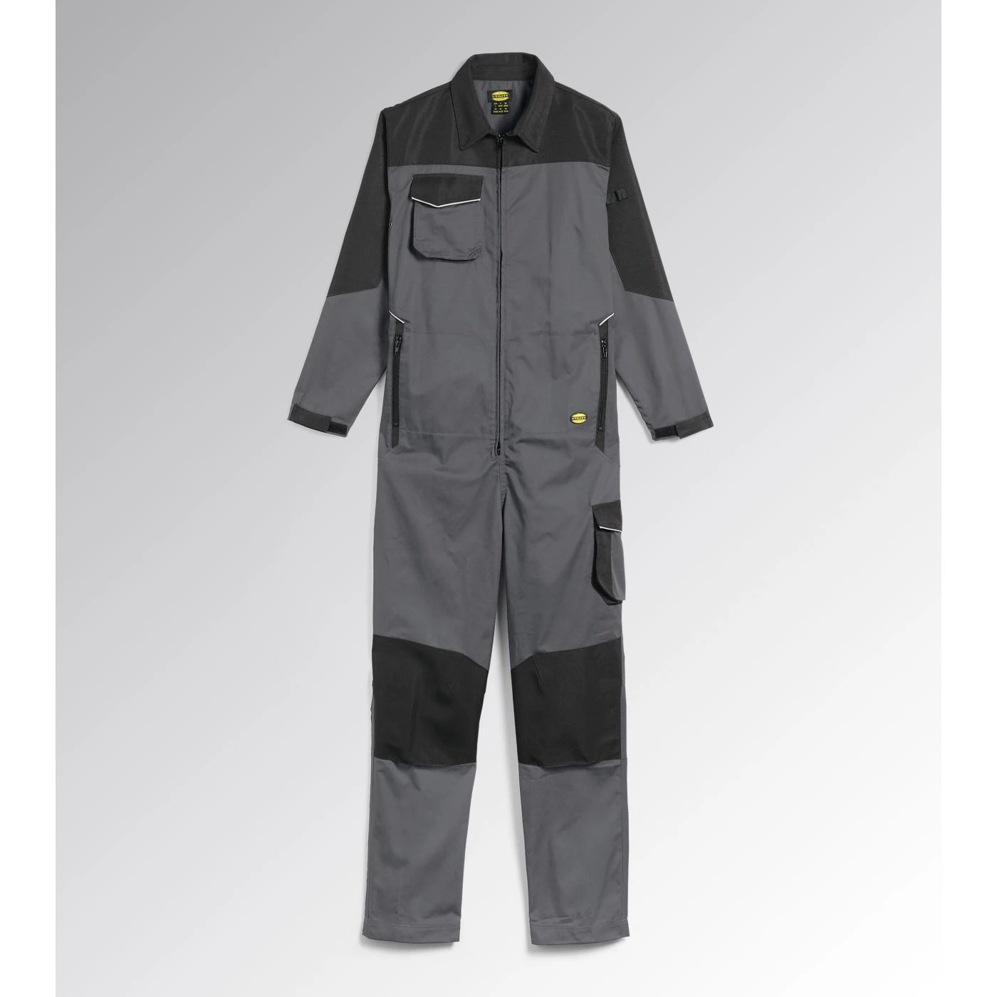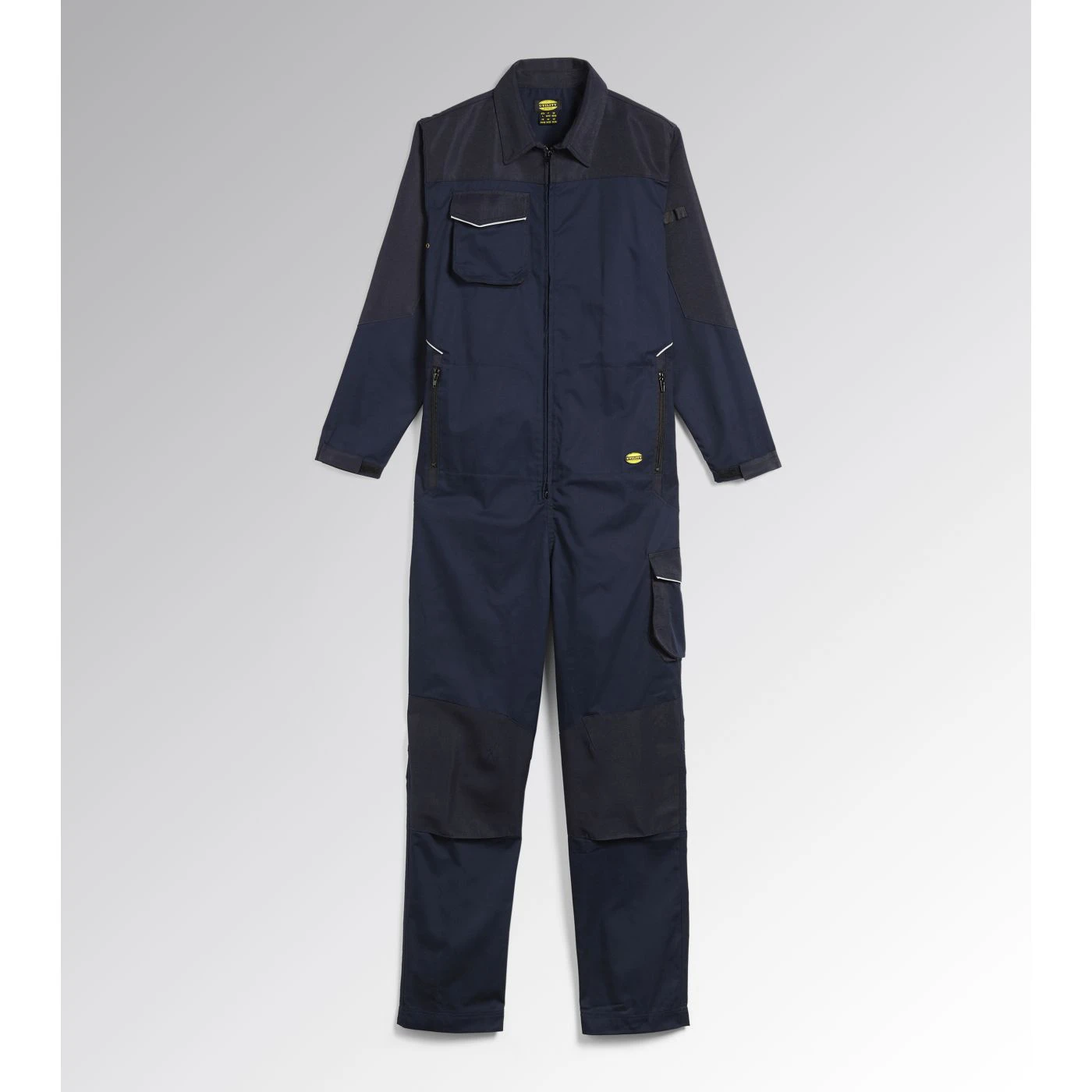 Overalls with contrast canvas details in abrasion-resistant polyester on shoulders, elbows and knees, two-way zip. Hammer holder and ruler pocket, side pockets, elasticated detail on back to facilitate movement, elasticated waist, reflective details, badge holder, triple stitching.