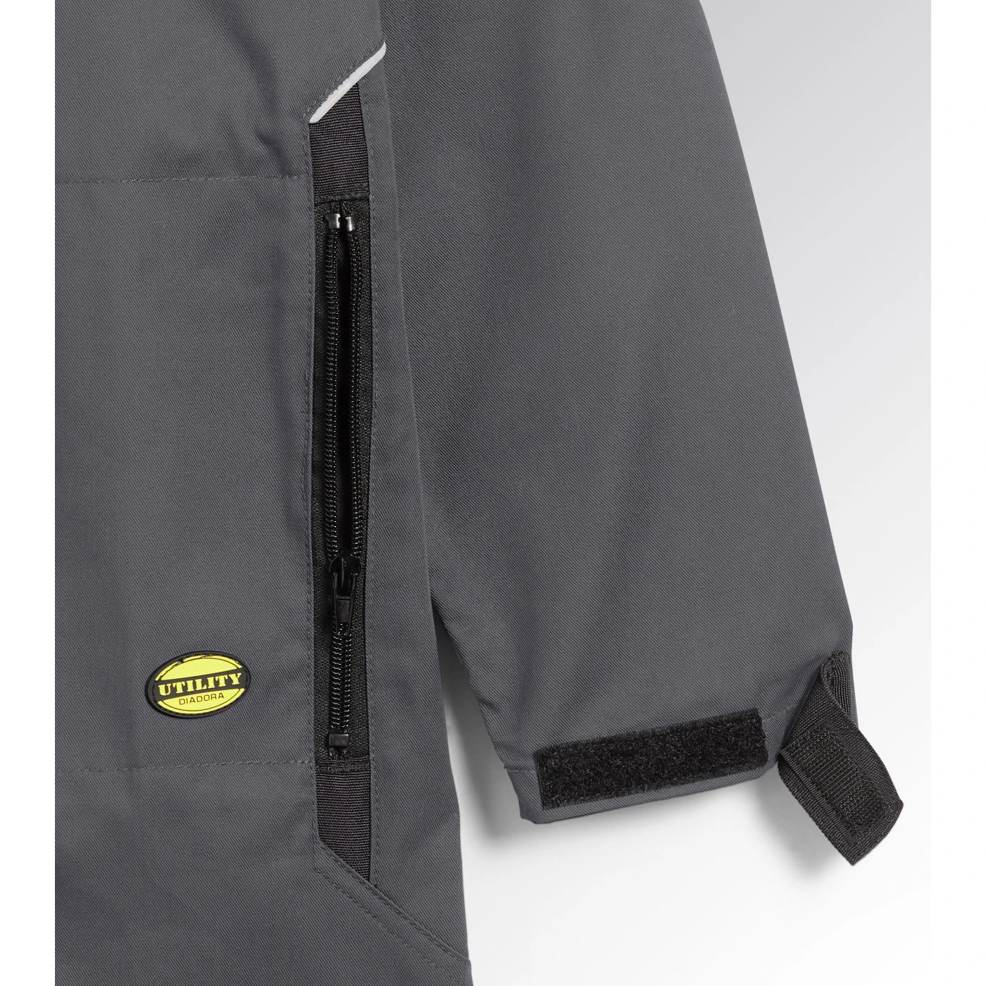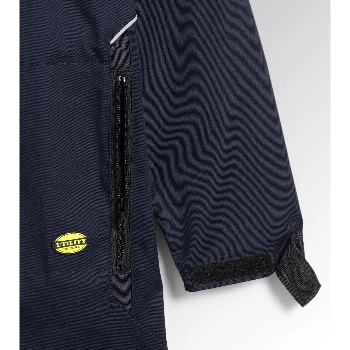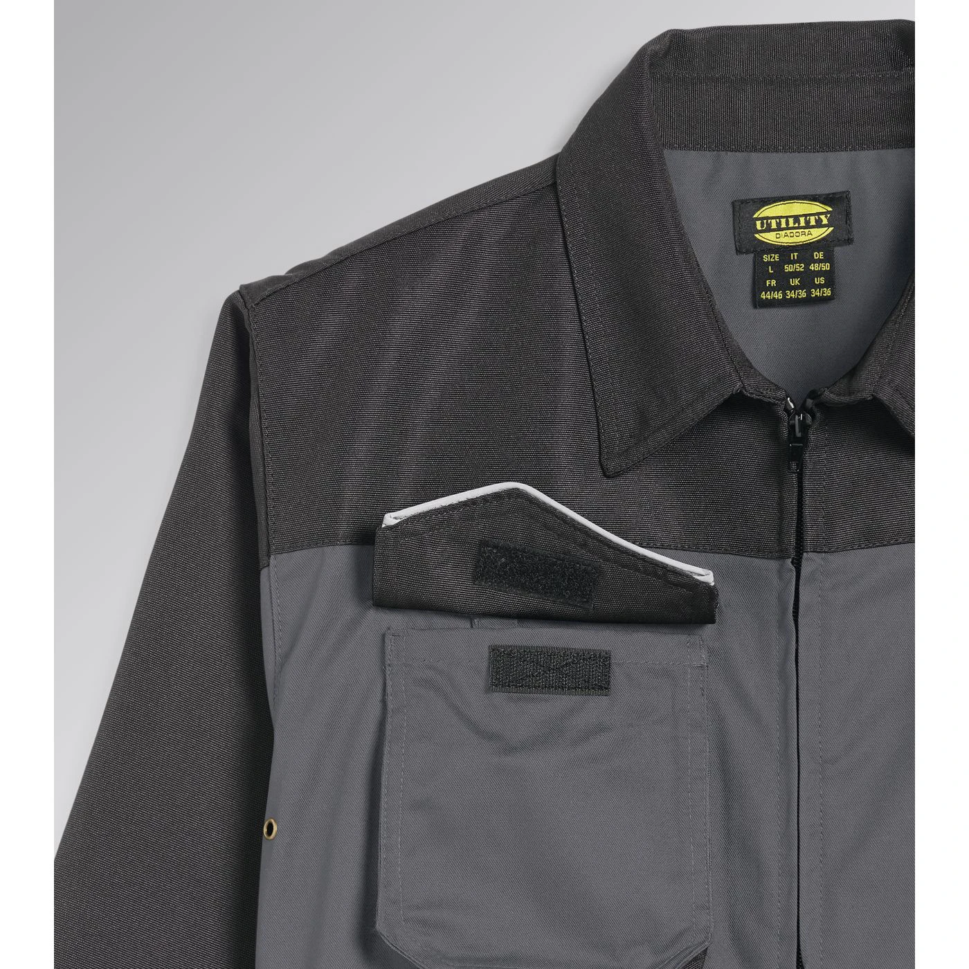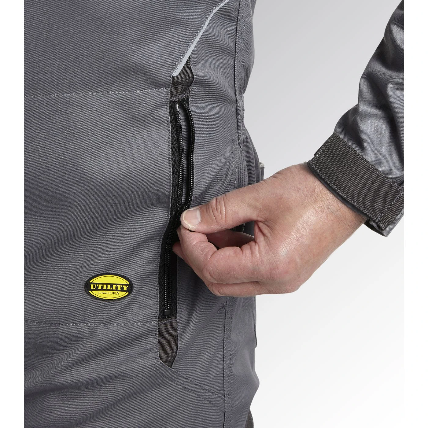 Overalls with contrast canvas details in abrasion-resistant polyester on shoulders, elbows and knees, two-way zip. Hammer holder and ruler pocket, side pockets, elasticated detail on back to facilitate movement, elasticated waist, reflective details, badge holder, triple stitching.