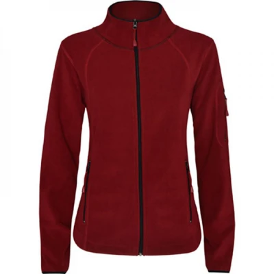 Fleeced jacket for outdoor sports, with high neck and long sleeve ribbed to contrast