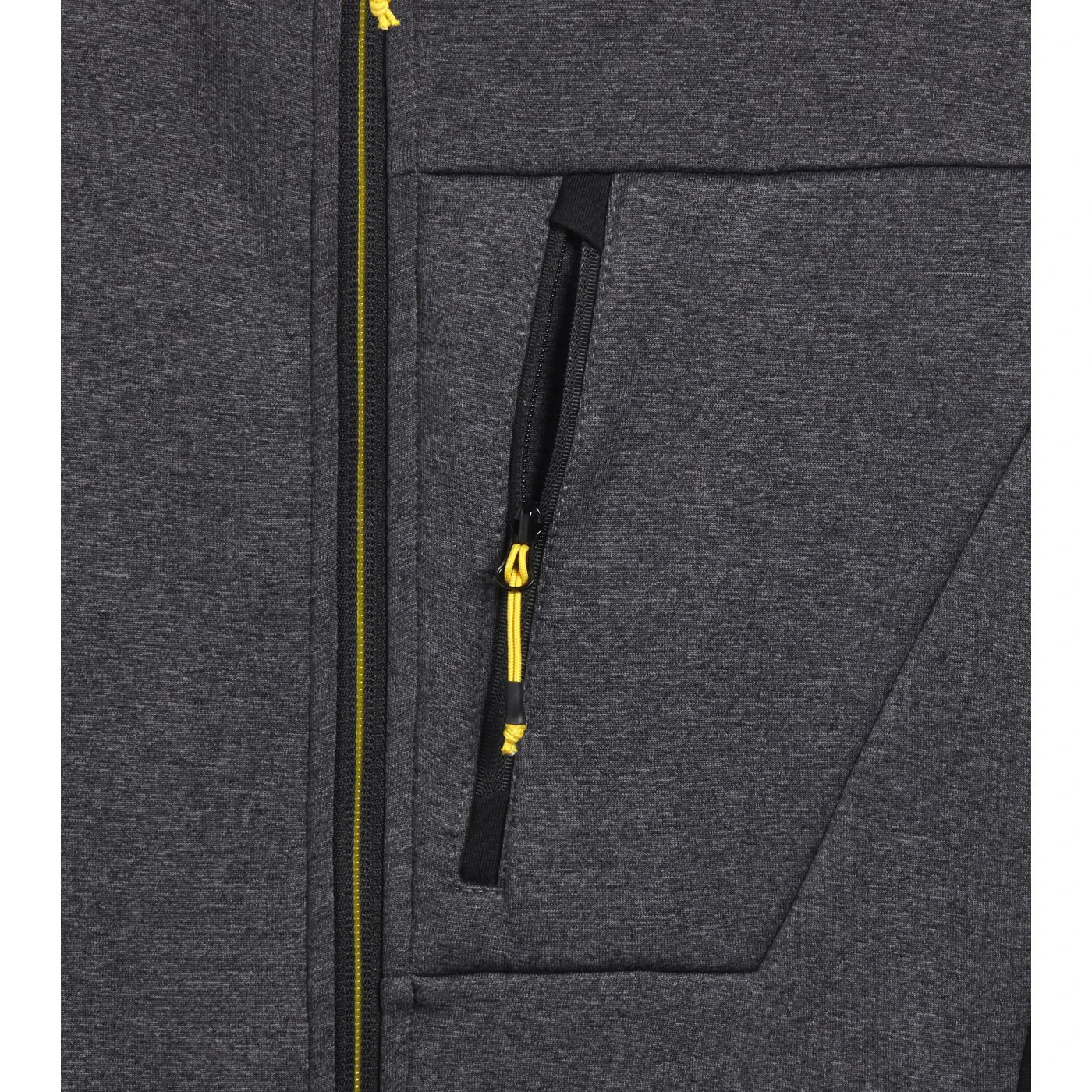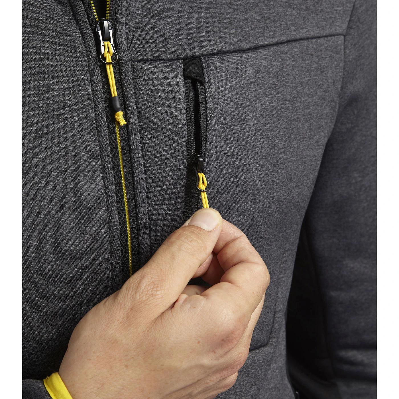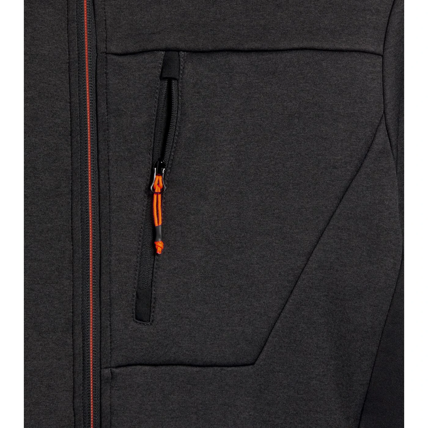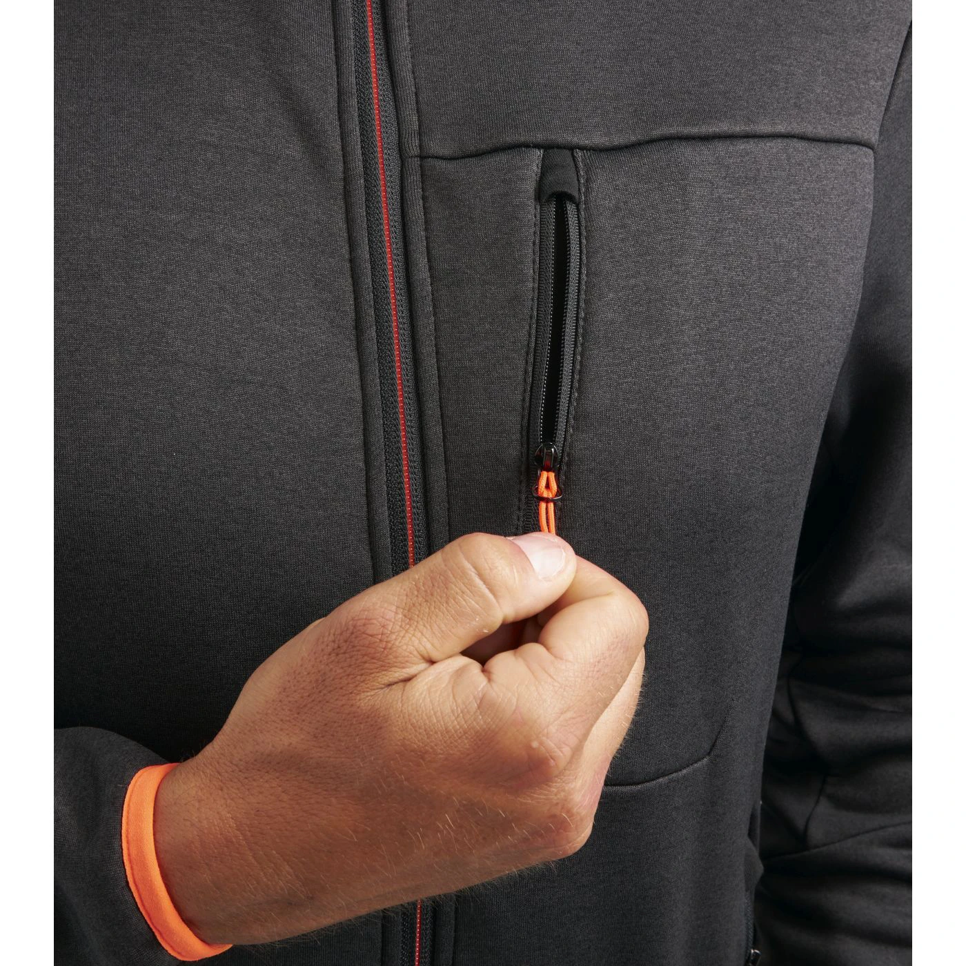 Super-stretchy technical fleece with plain exterior and brushed interior. Ergonomic cut and modern look. Two side pockets and a front pocket with zip. Contrasting-coloured details.