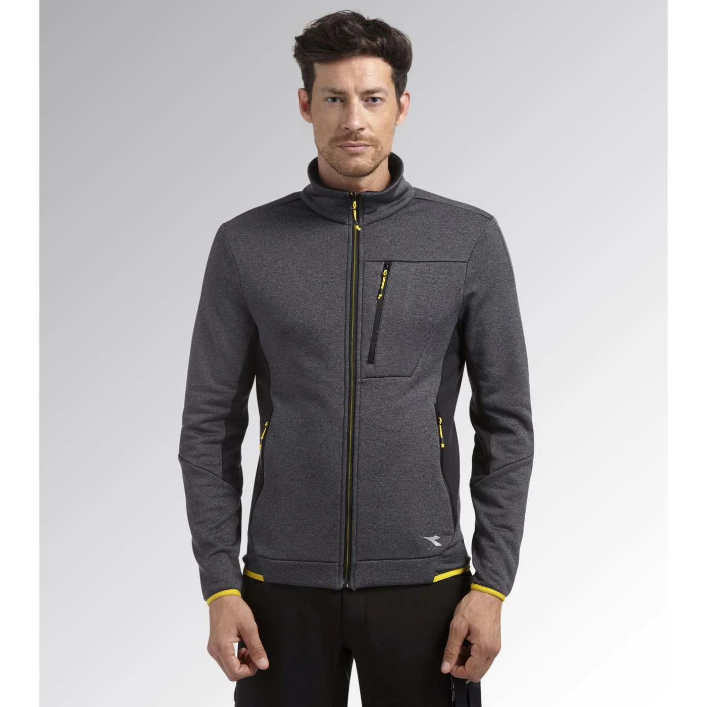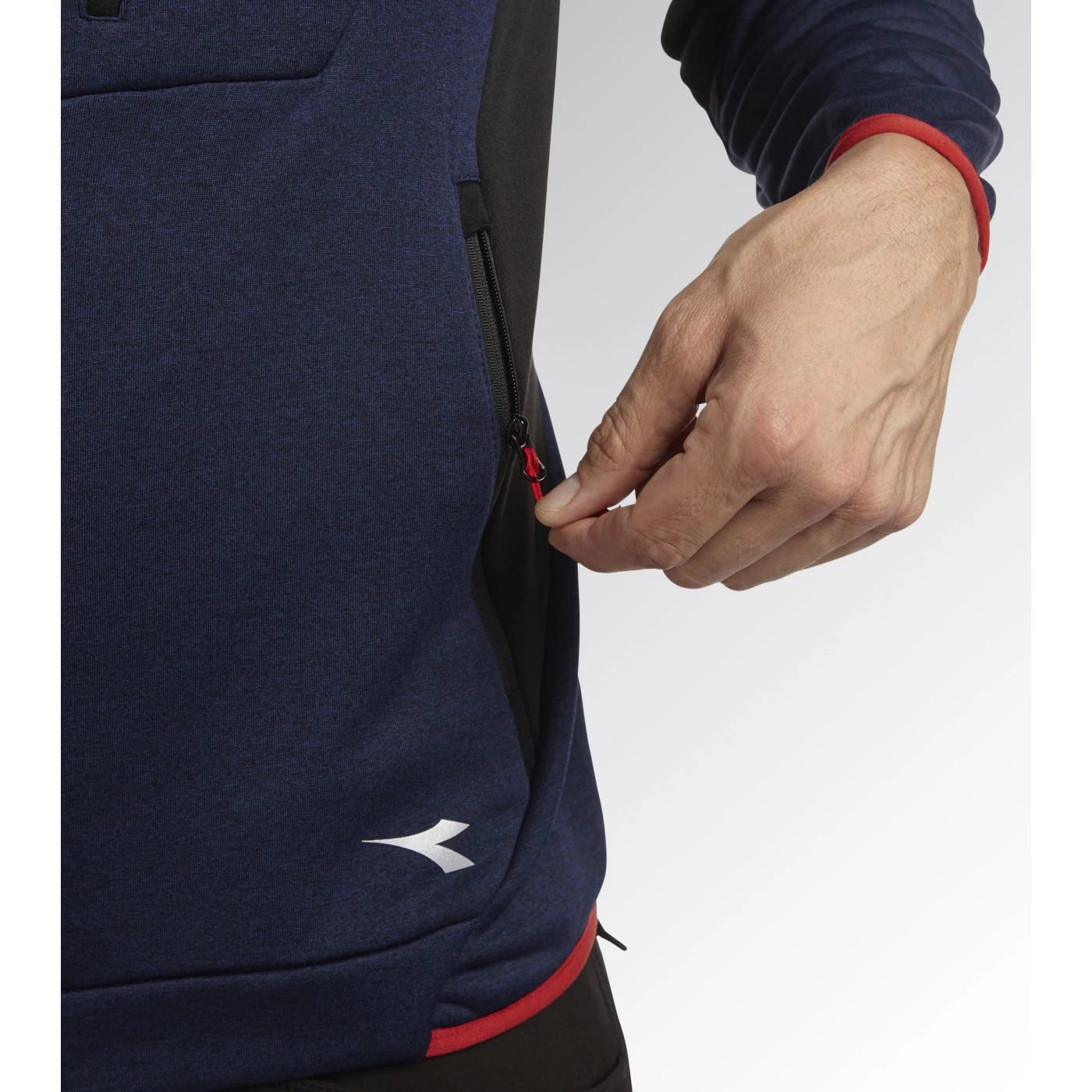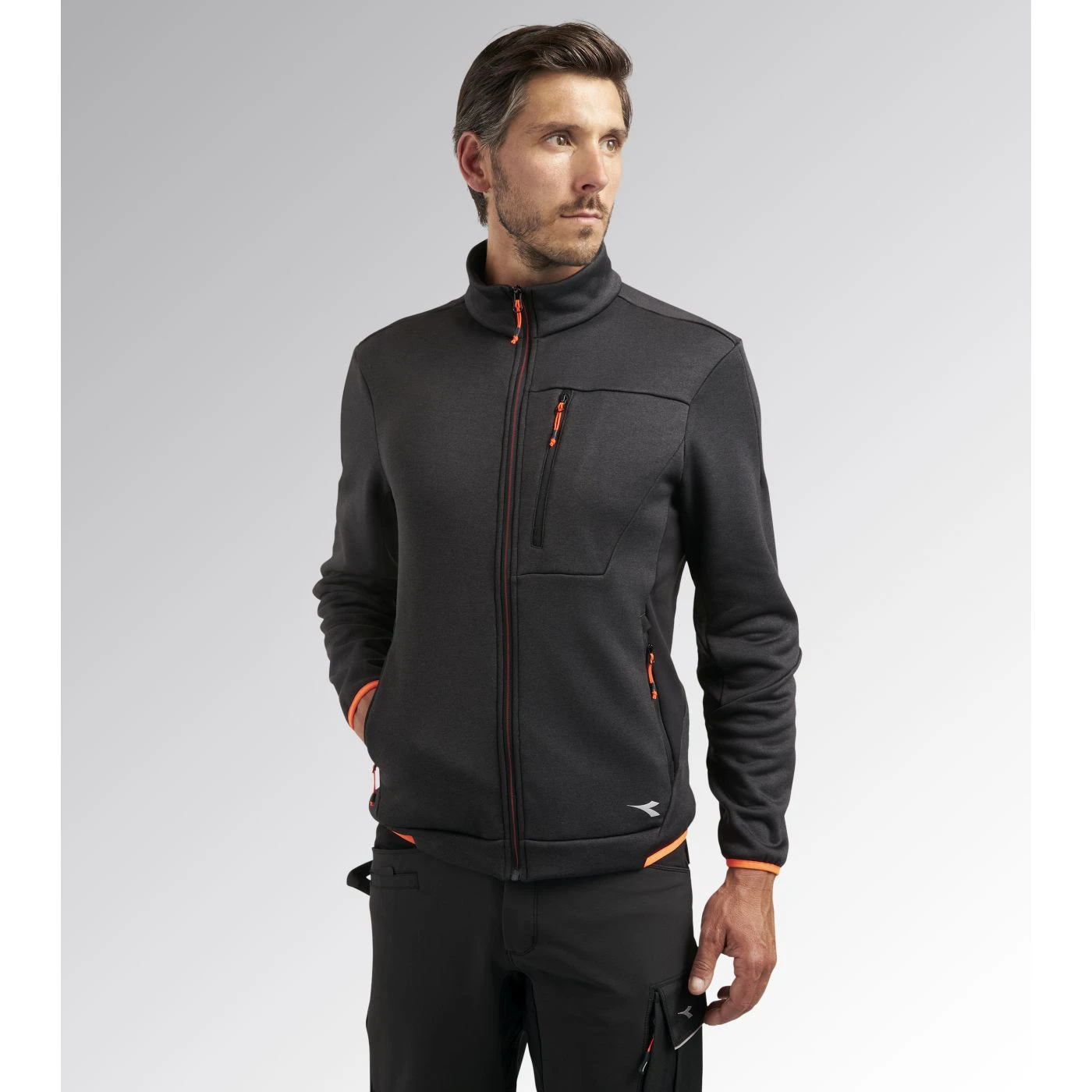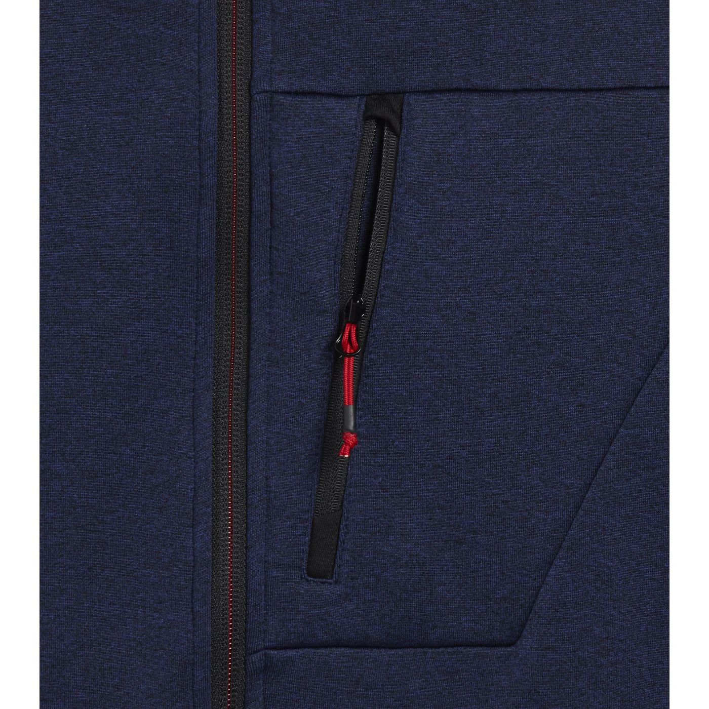 Super-stretchy technical fleece with plain exterior and brushed interior. Ergonomic cut and modern look. Two side pockets and a front pocket with zip. Contrasting-coloured details.