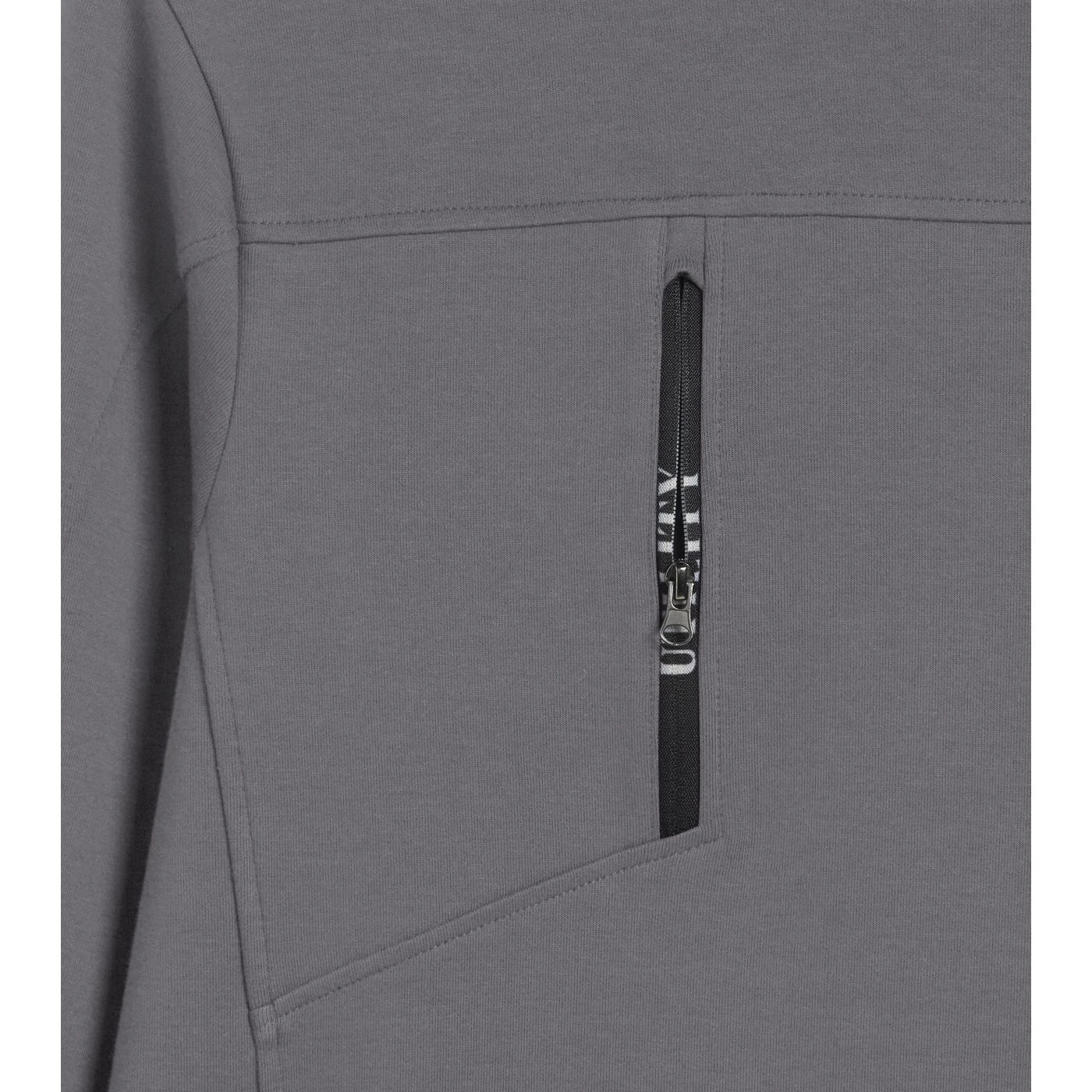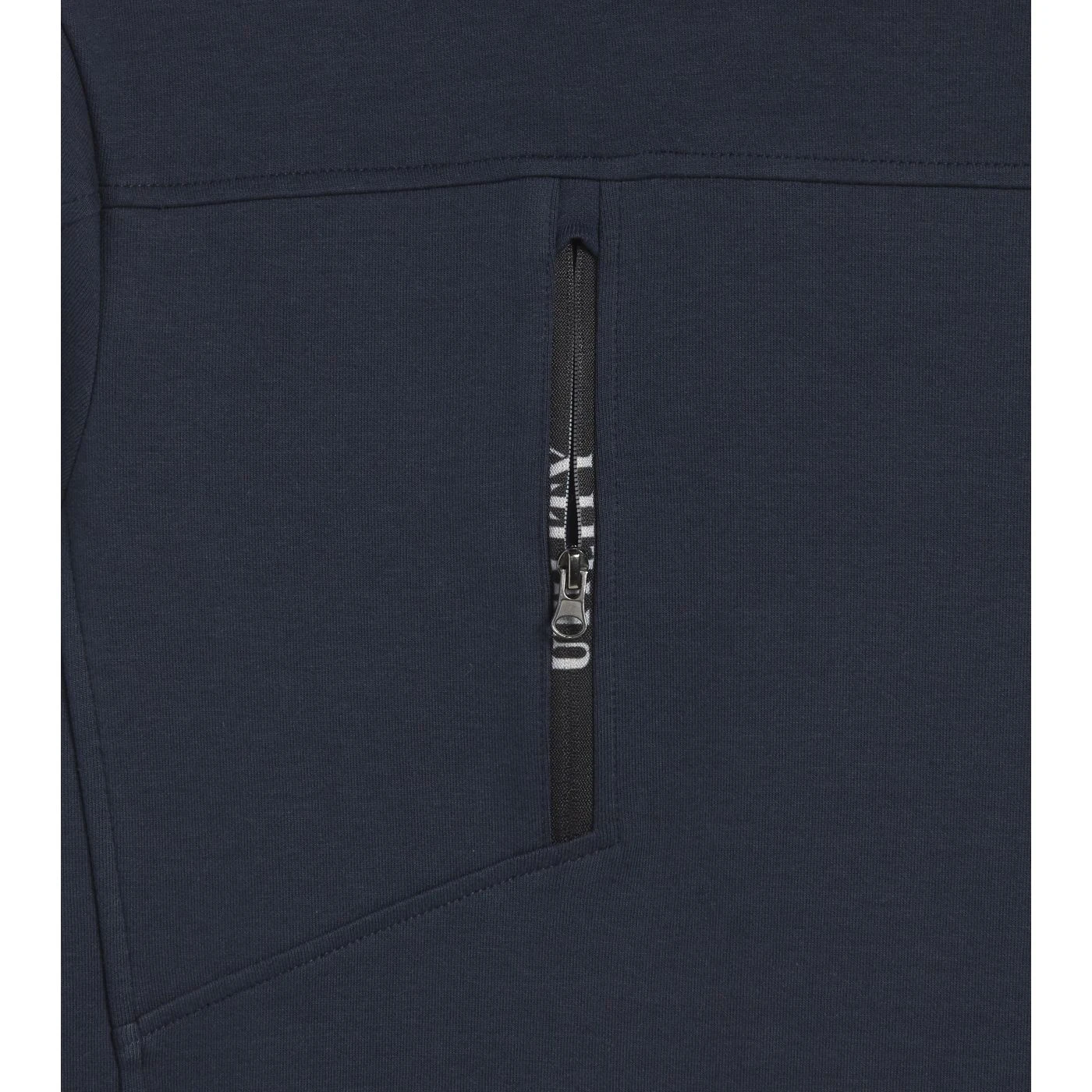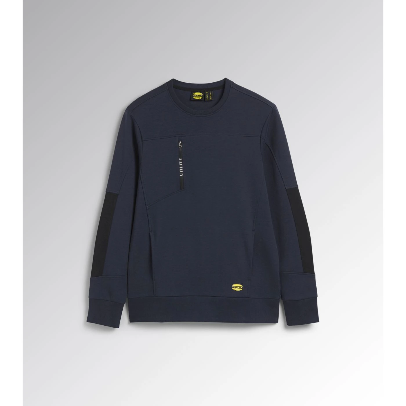 Light interlock crew-neck sweatshirt with black side inserts on the sleeves. Ergonomic sleeves. Two open side pockets and a front pocket with zip. Stretch rib-knit neck, cuffs and hem.