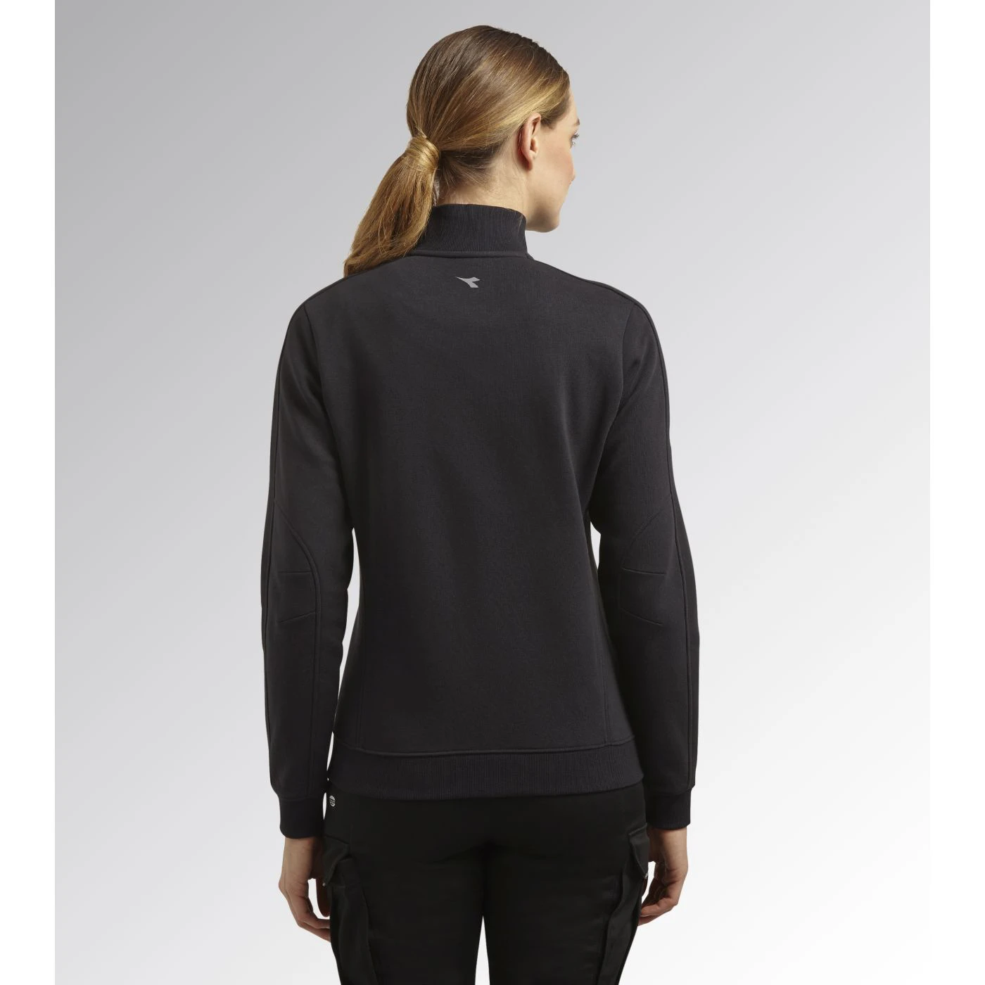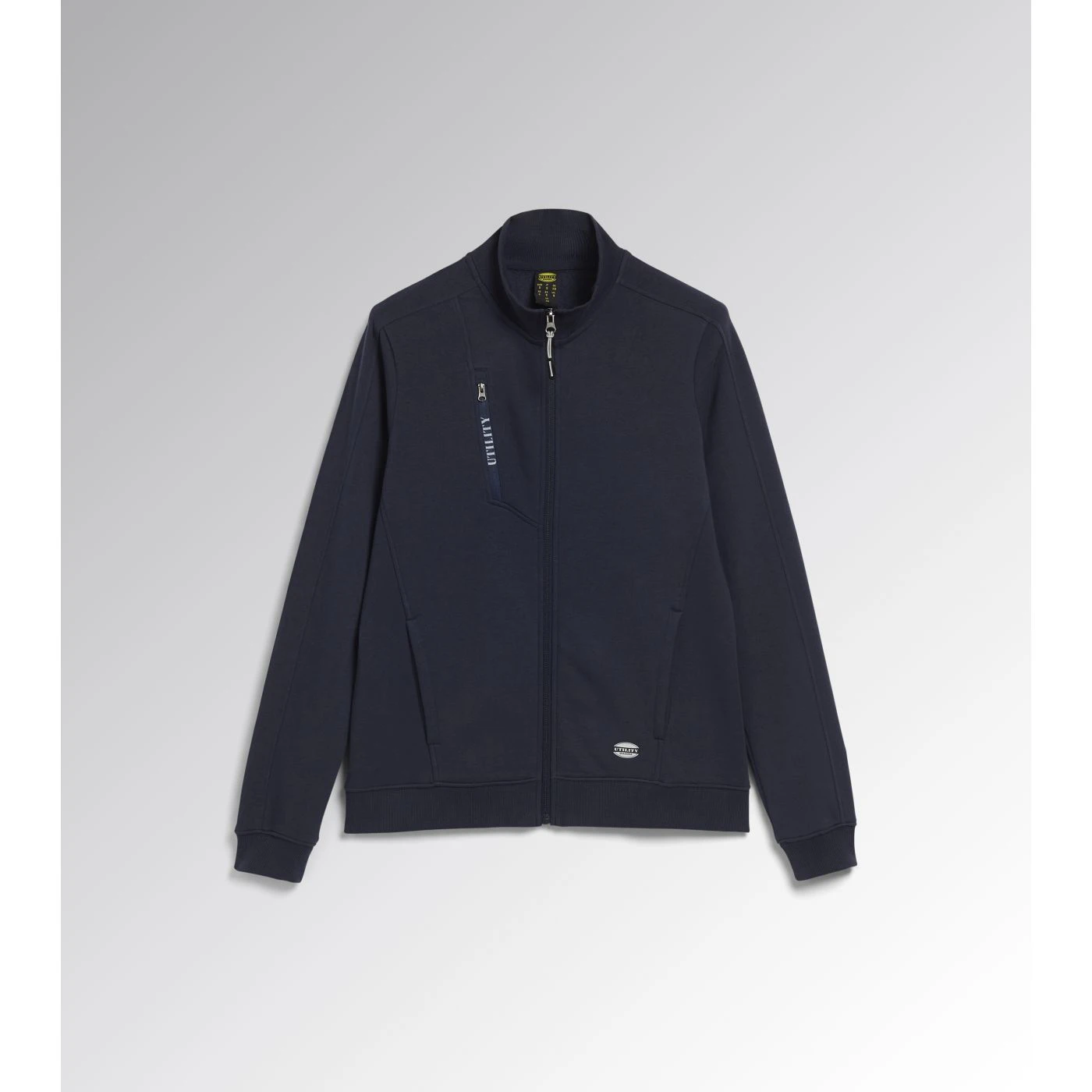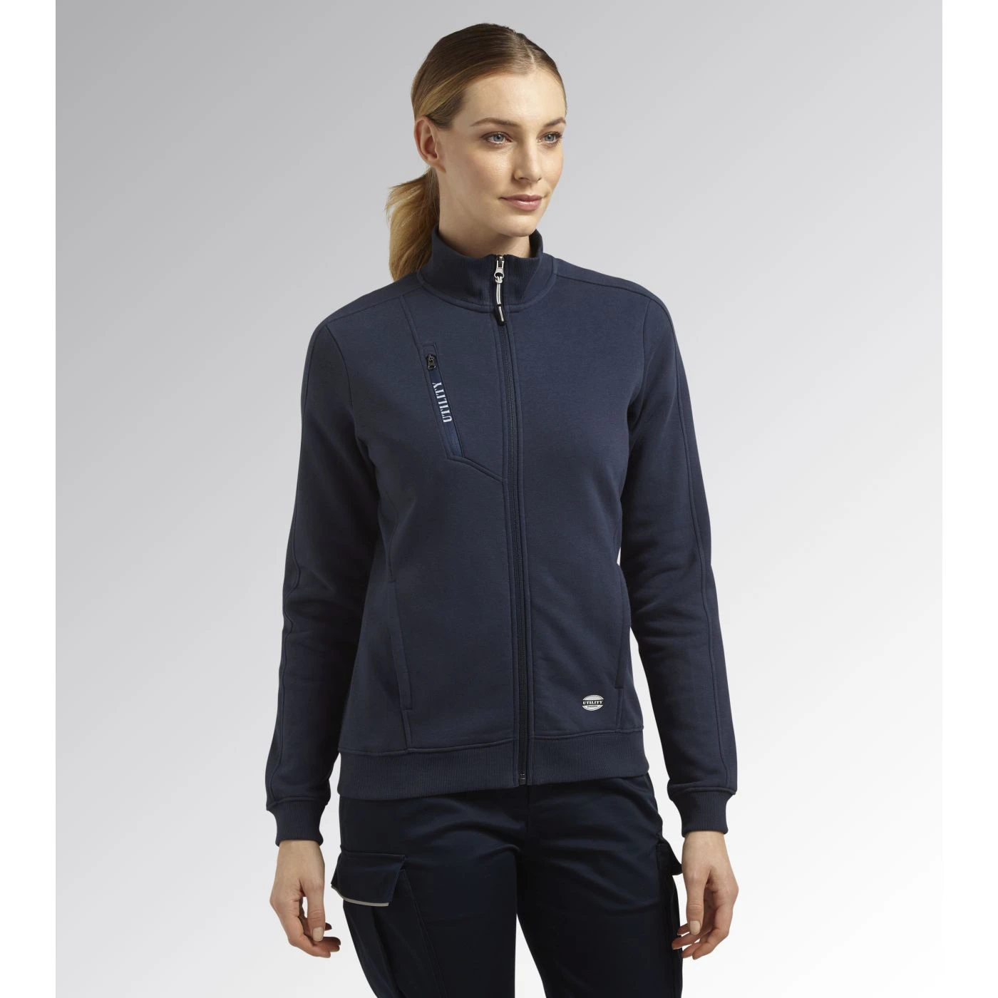 Women’s comfortable slim-fit work sweatshirt in brushed fabric with a full zip. Two open side pockets and a front pocket with zip. Stretch rib-knit neck, cuffs and hem.