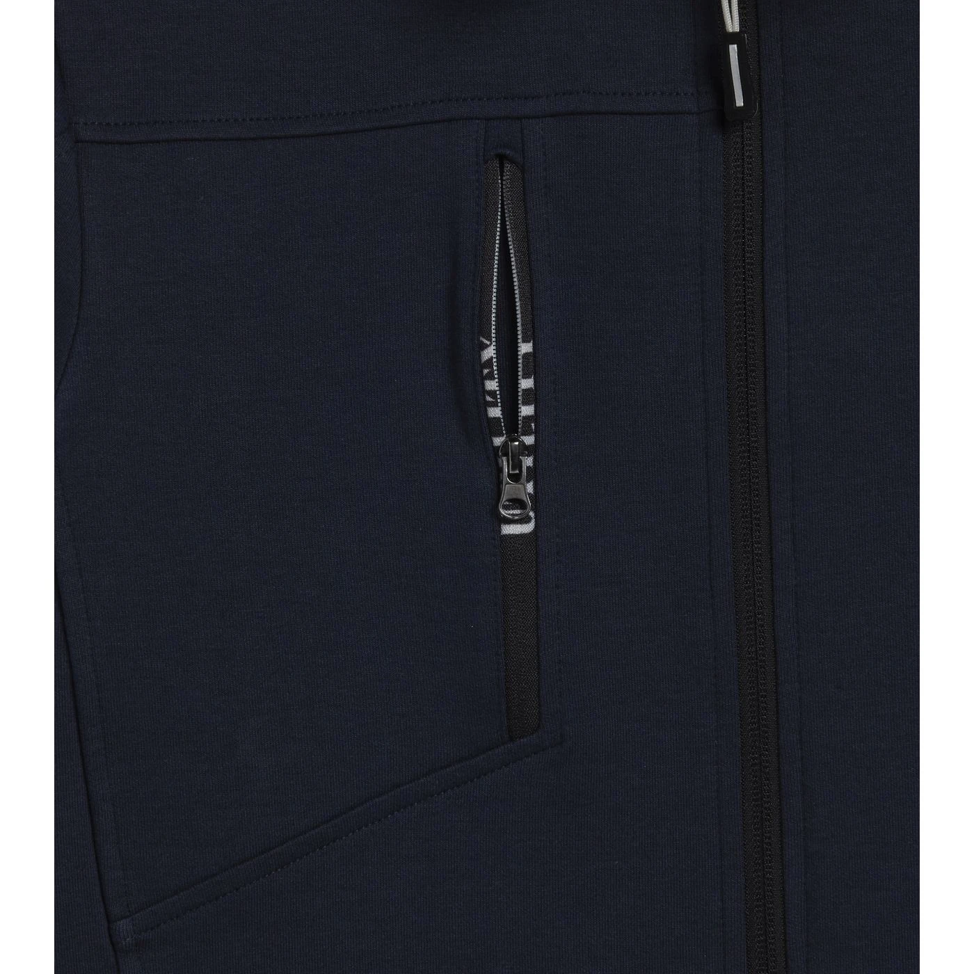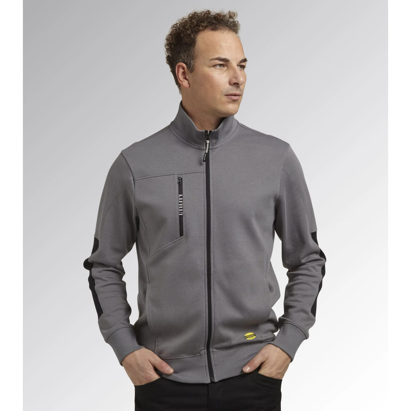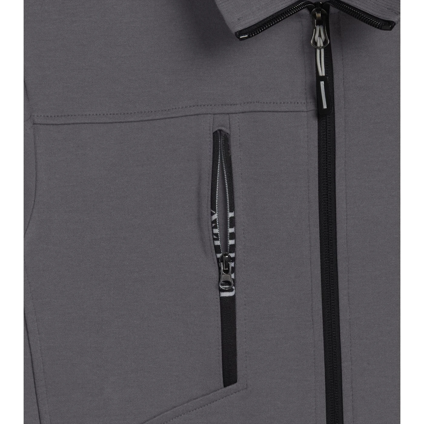 Light interlock full-zip sweatshirt with black side inserts on the sleeves. Ergonomic sleeves. Two open side pockets and a front pocket with zip. Stretch rib-knit neck, cuffs and hem.
