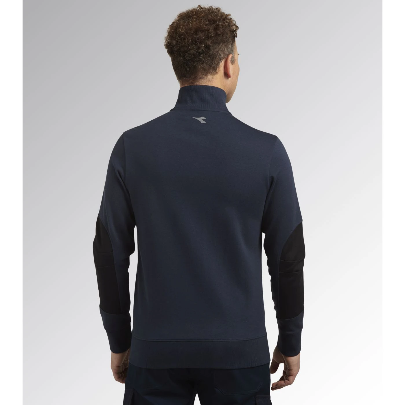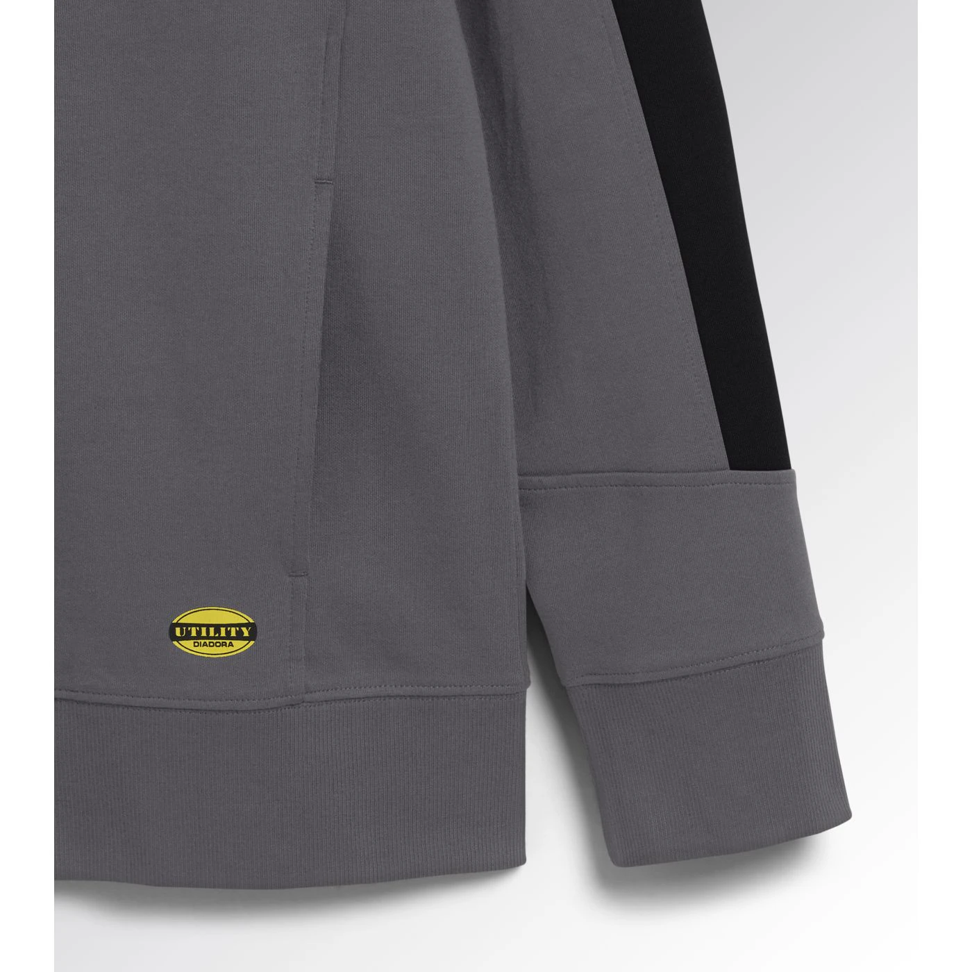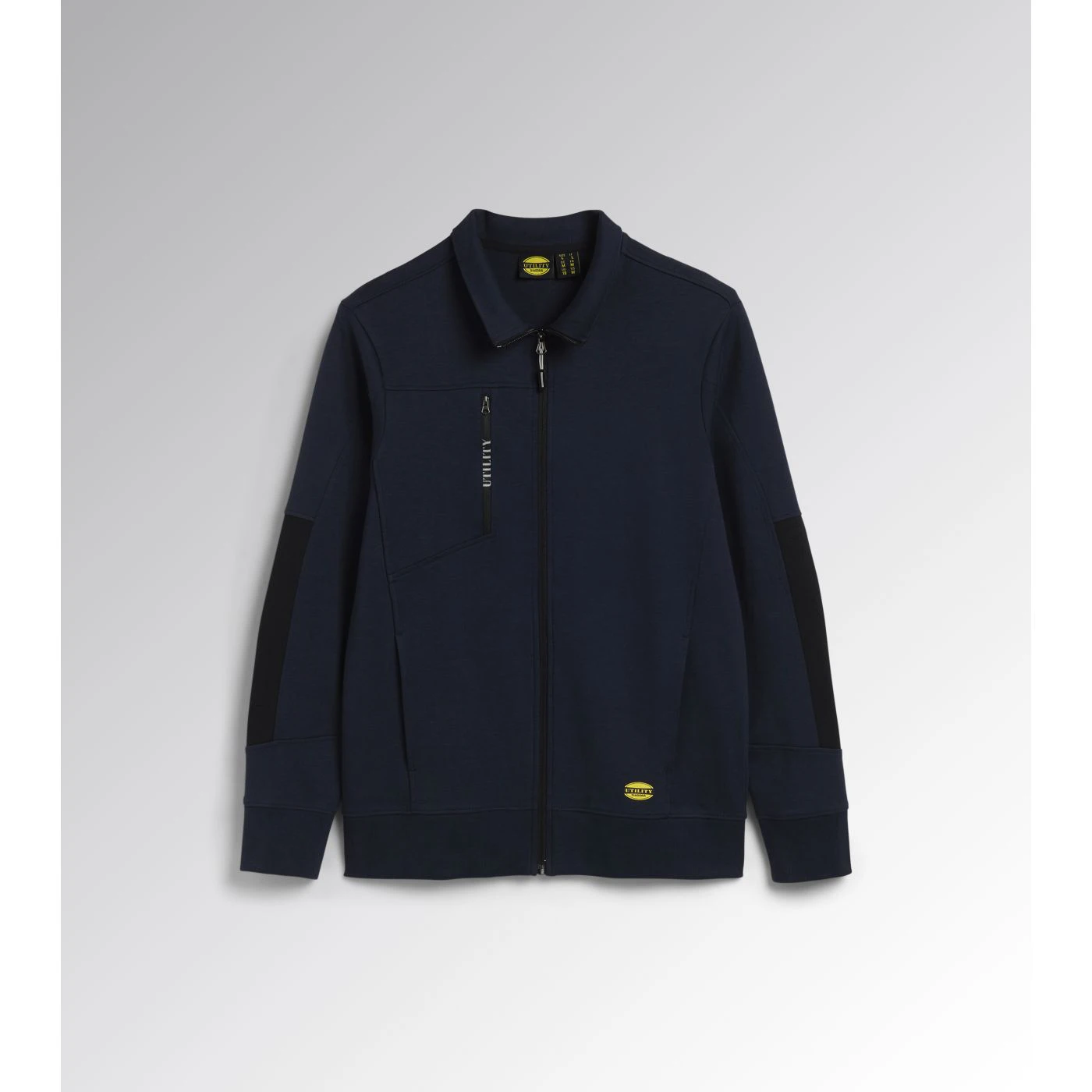 Light interlock full-zip sweatshirt with black side inserts on the sleeves. Ergonomic sleeves. Two open side pockets and a front pocket with zip. Stretch rib-knit neck, cuffs and hem.