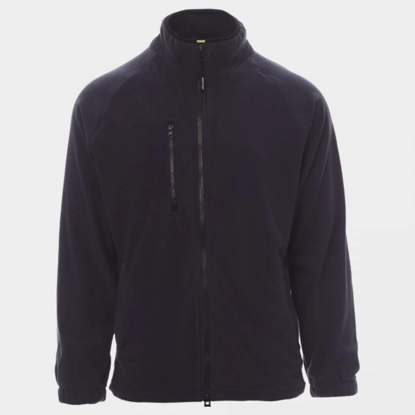 Bluză pentru bărbați, cu fermoar integral de 8 mm, din plastic negru, mânecă raglan, șnur reglabil în talie, benzi elastice pe manșetă, două buzunare cu fermoar acoperit, un buzunar frontal cu fermoar, guler cu margine întărită în nuanță contrastantă, cusături întărite.