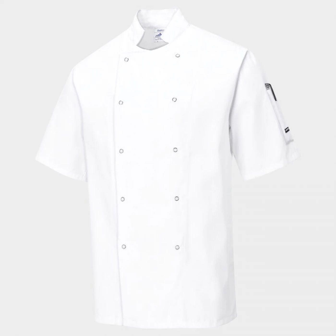 Tunică pentru bucătar cu mâneci scurte și închidere cu nasture tip capse.