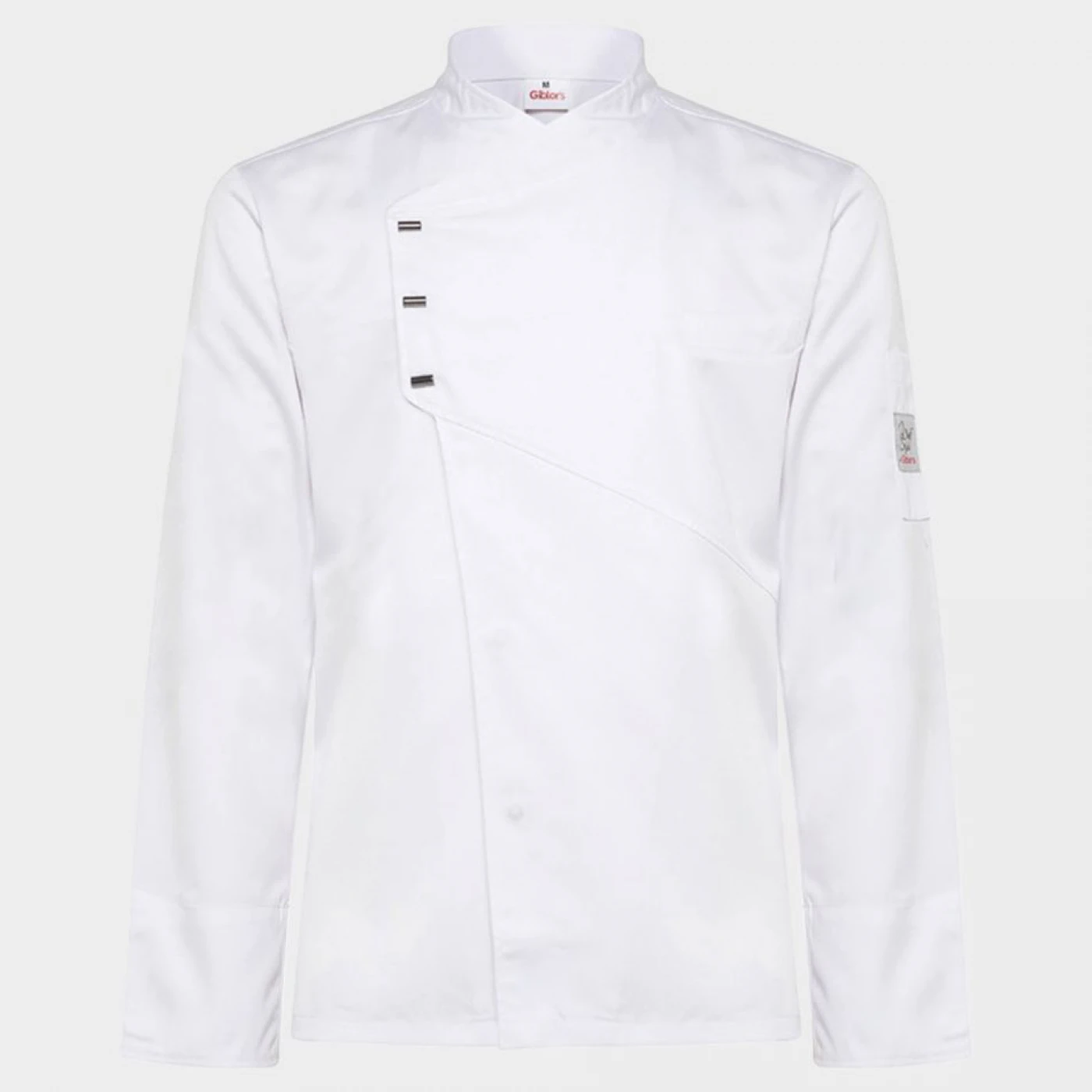 Tunica pentru bucătar cu mâneci lungi, închidere cu nasturi, buzunar superior ascuns la piept și plasă la spate.