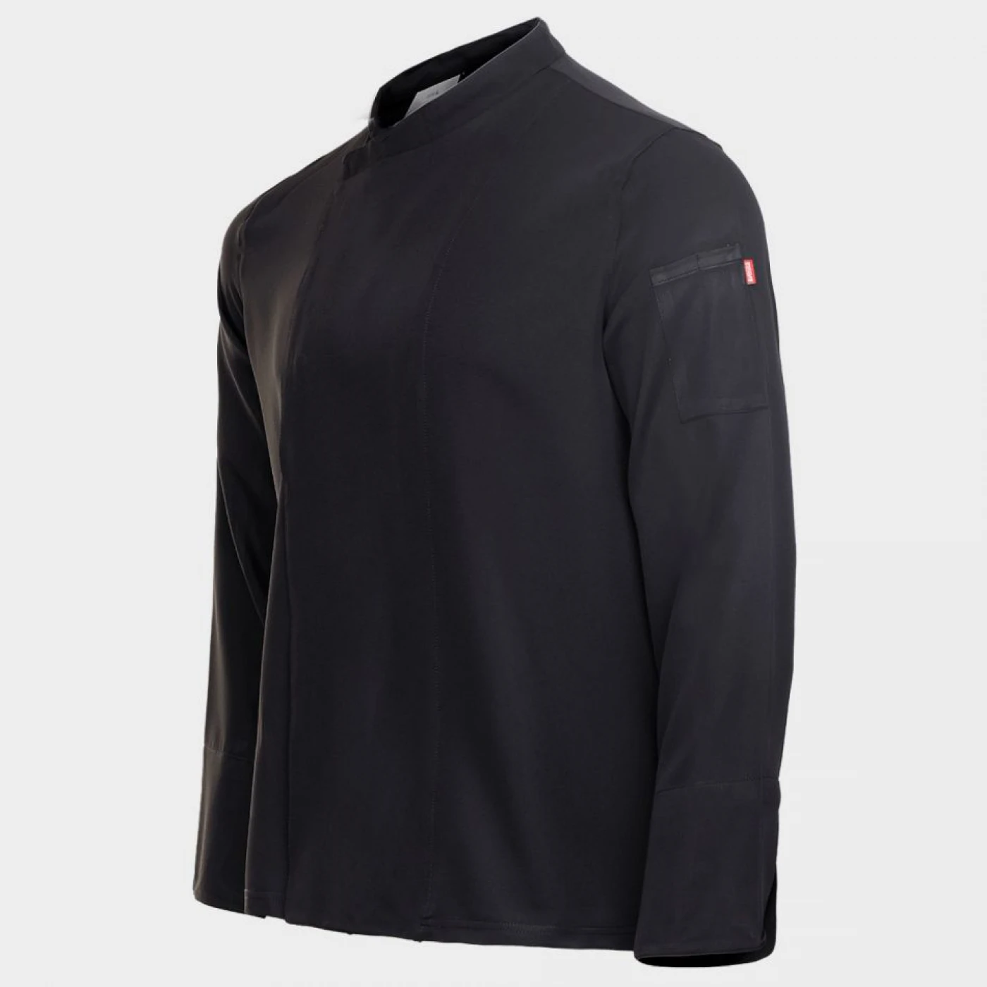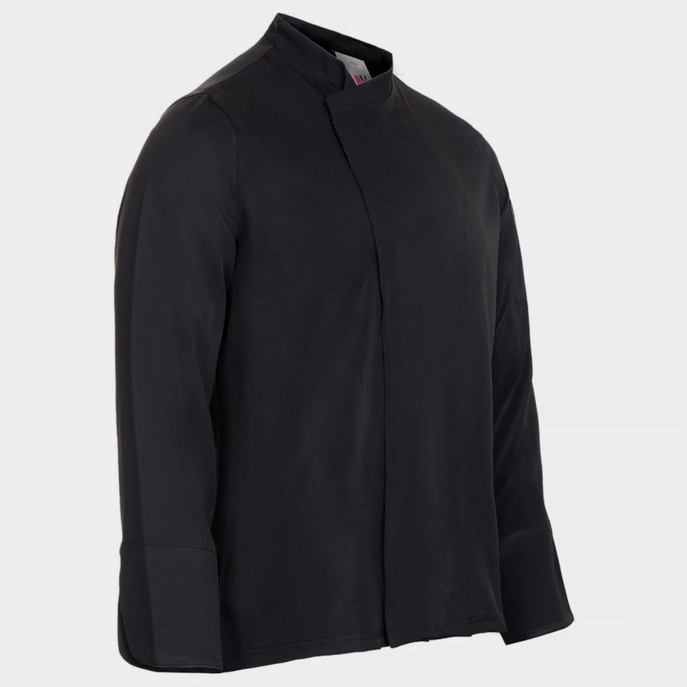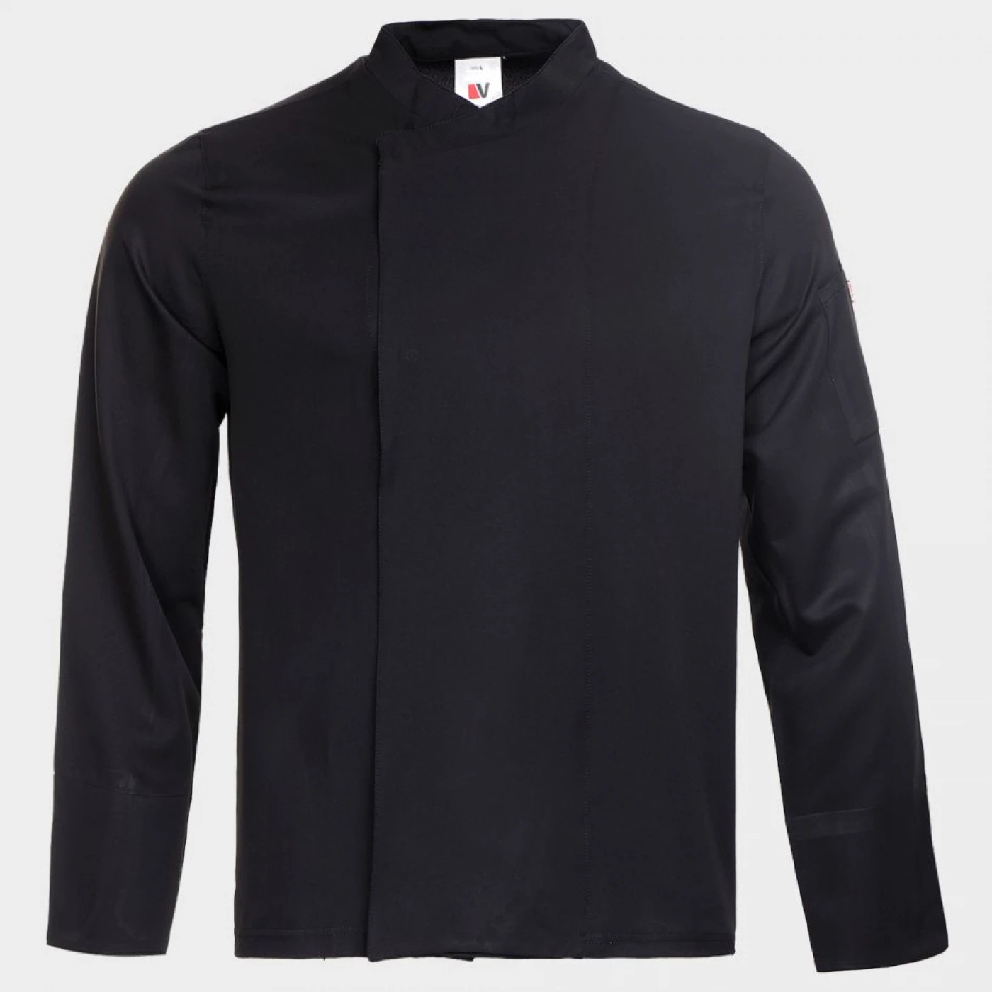 Tunică de bucătar cu mâneci lungi, închidere asimetrică cu nasturi tip capse, spate din material respirabil Coolmax. Buzunar cu două compartimente pe mâneca stângă.