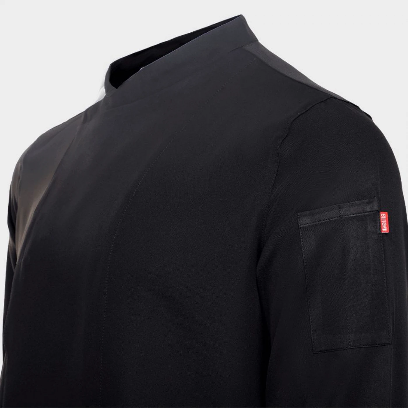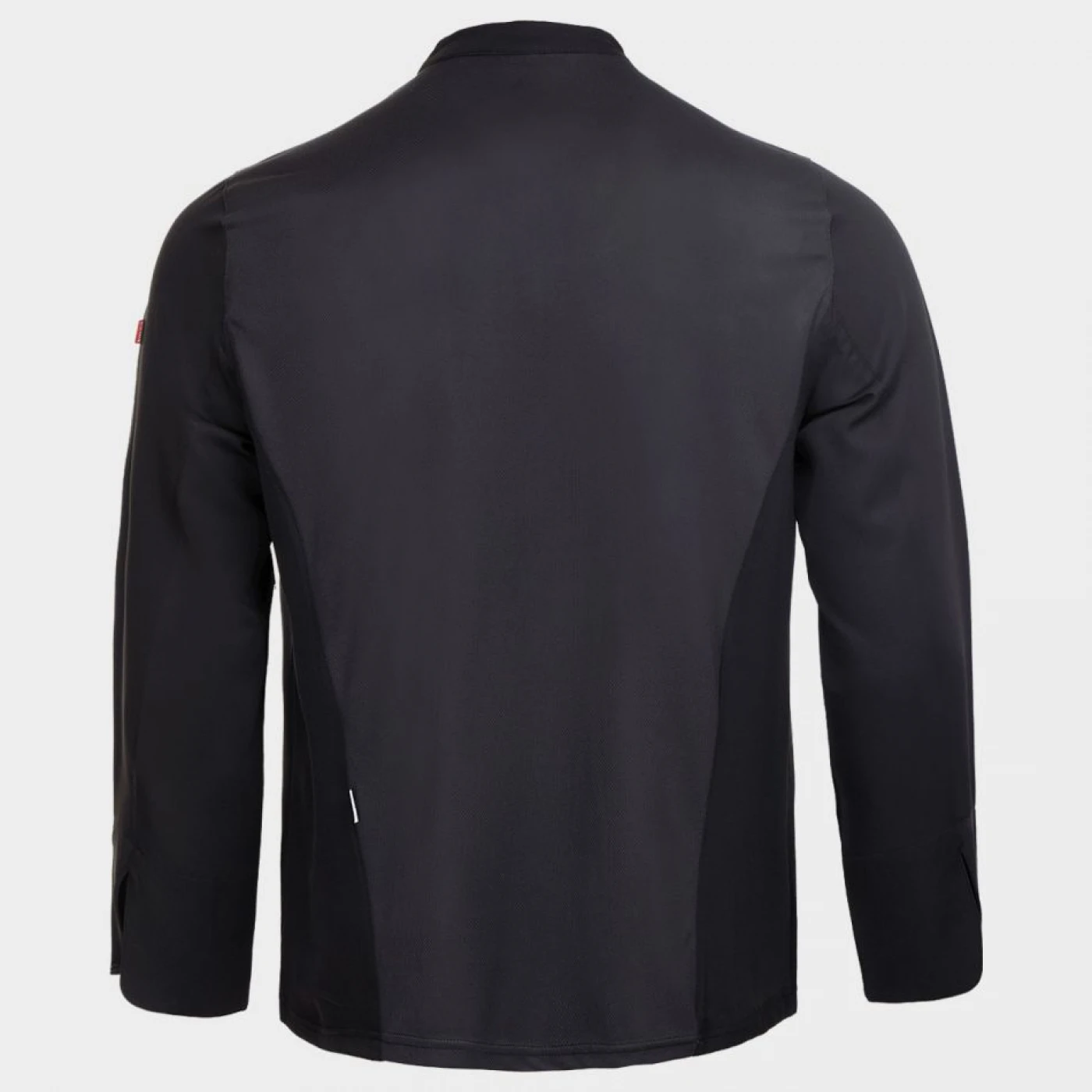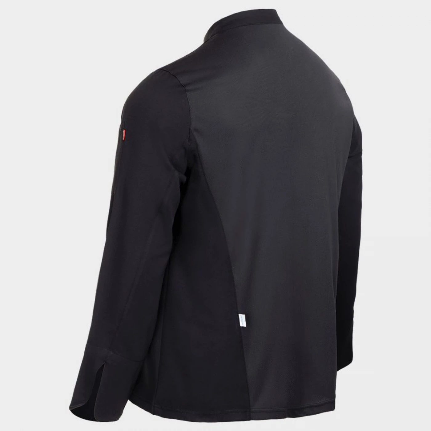 Tunică de bucătar cu mâneci lungi, închidere asimetrică cu nasturi tip capse, spate din material respirabil Coolmax. Buzunar cu două compartimente pe mâneca stângă.
