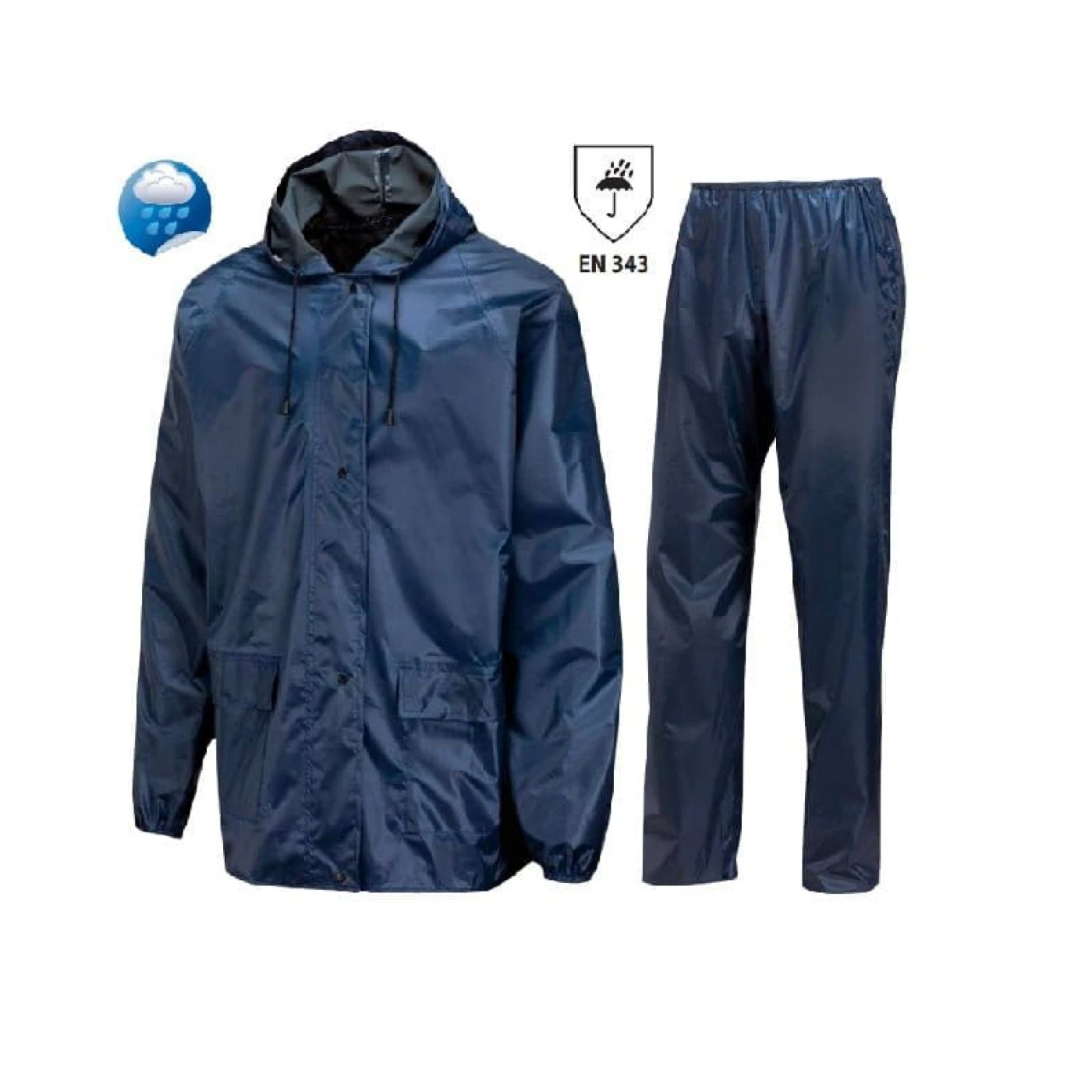 Costum impermeabil din poliester/pvc alcatuit din jacheta si pantaloni. Jacheta este cu gluga pliabila, inchidere frontala cu fermoar si mansete elastice. Pantalonii au elastic in talie si inchidere cu capse la glezne.