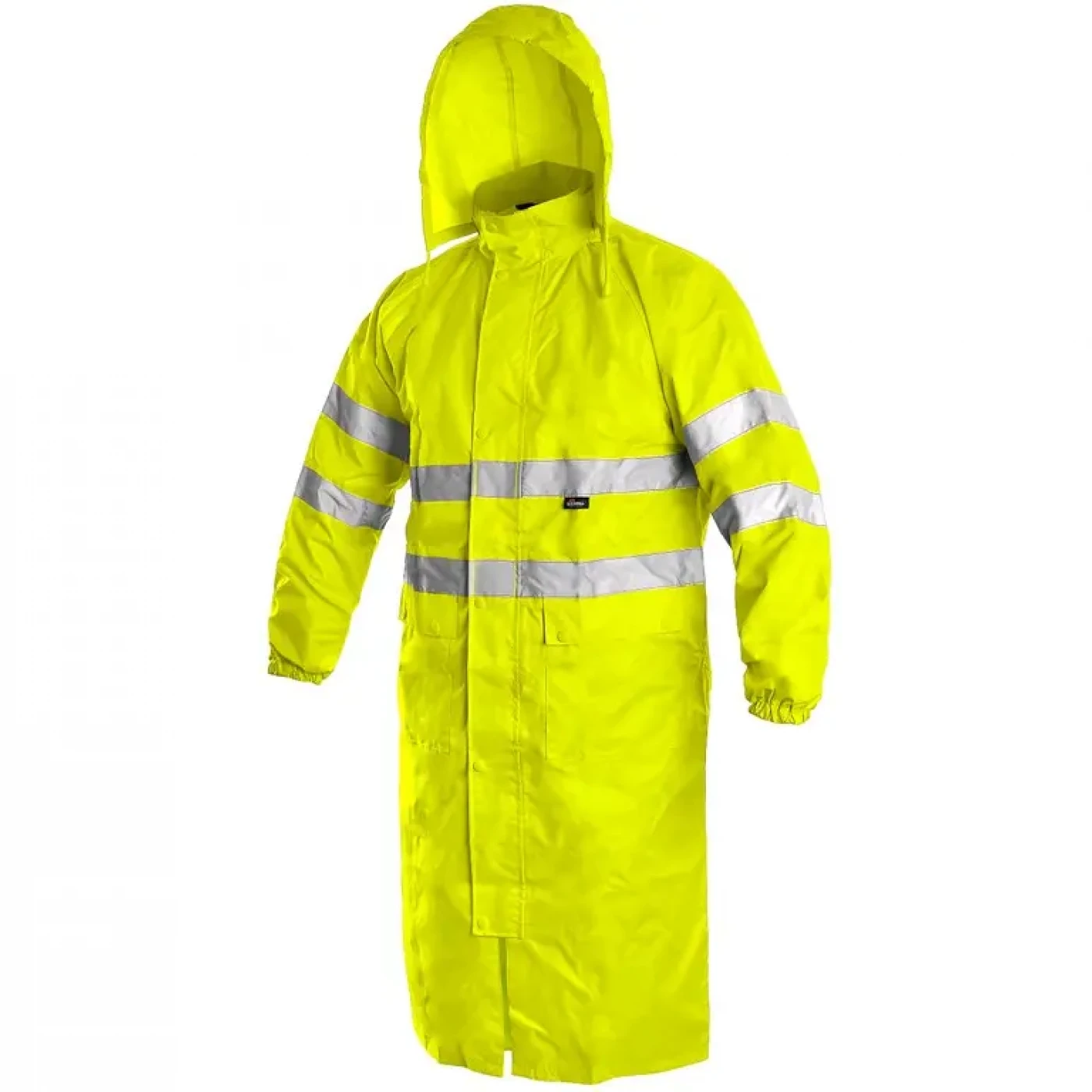 Pelerina impermeabila de inalta vizibilitate confectionata dintr-un material tip Oxford 100% poliester. Echipata cu benzi reflectorizante orizontale, gluga detasabila si ventilatie in spate si partea inferioara.