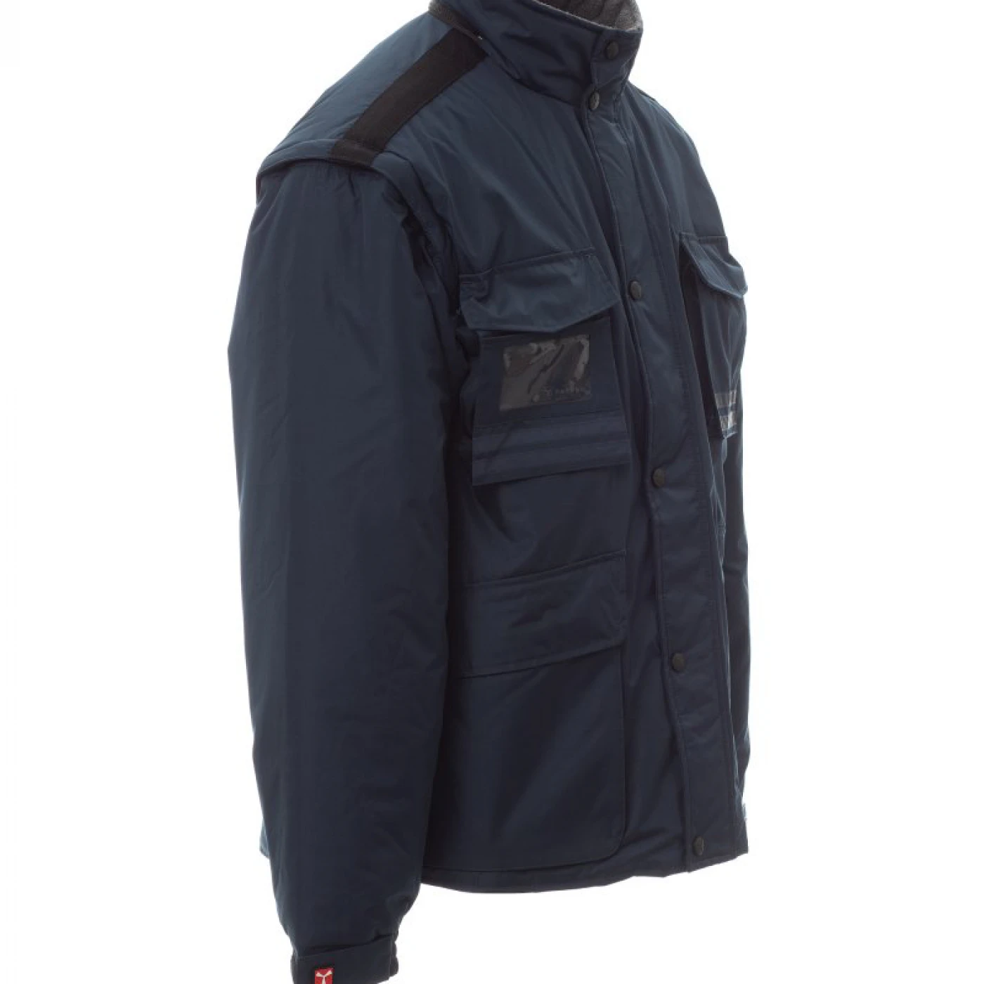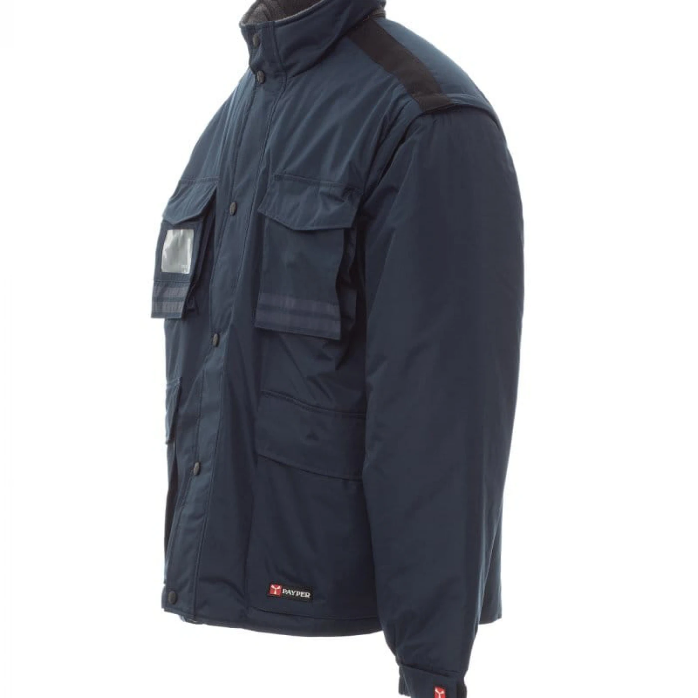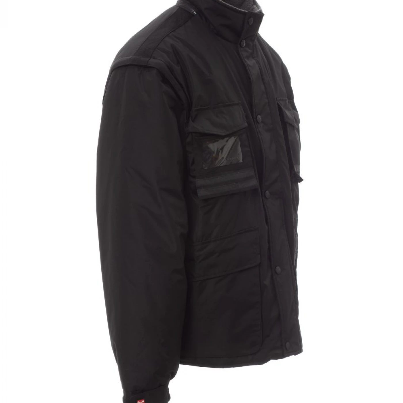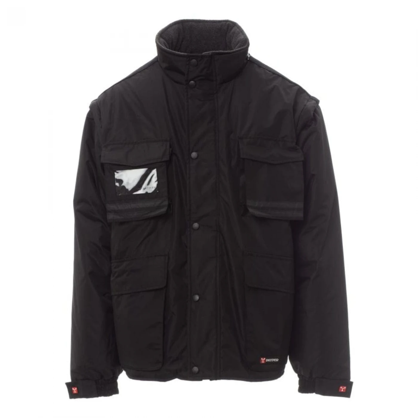 Jacheta de iarna pentru barbati, cu maneci detasabile, confectionata din poliester ripstop pongee. Materialul este impermeabil, rezistent la vânt, densitatea si textura tesaturii nu permit trecerea aerului si asigura o izolatie termica discreta. Închiderea se face cu un fermoar din plastic de 5 mm, prevazut cu un cursor metalic. Este echipata cu 5 buzunare exterioare, din care unul cu suport pentru ecuson, gluga pliabila, mansete reglabile, benzi reflectorizante pe buzunarele de la piept si pe spate, captuseala din micro-fleece la guler si spate, snur interior si fermoar care faciliteaza serviciile de imprimare si broderie. \n