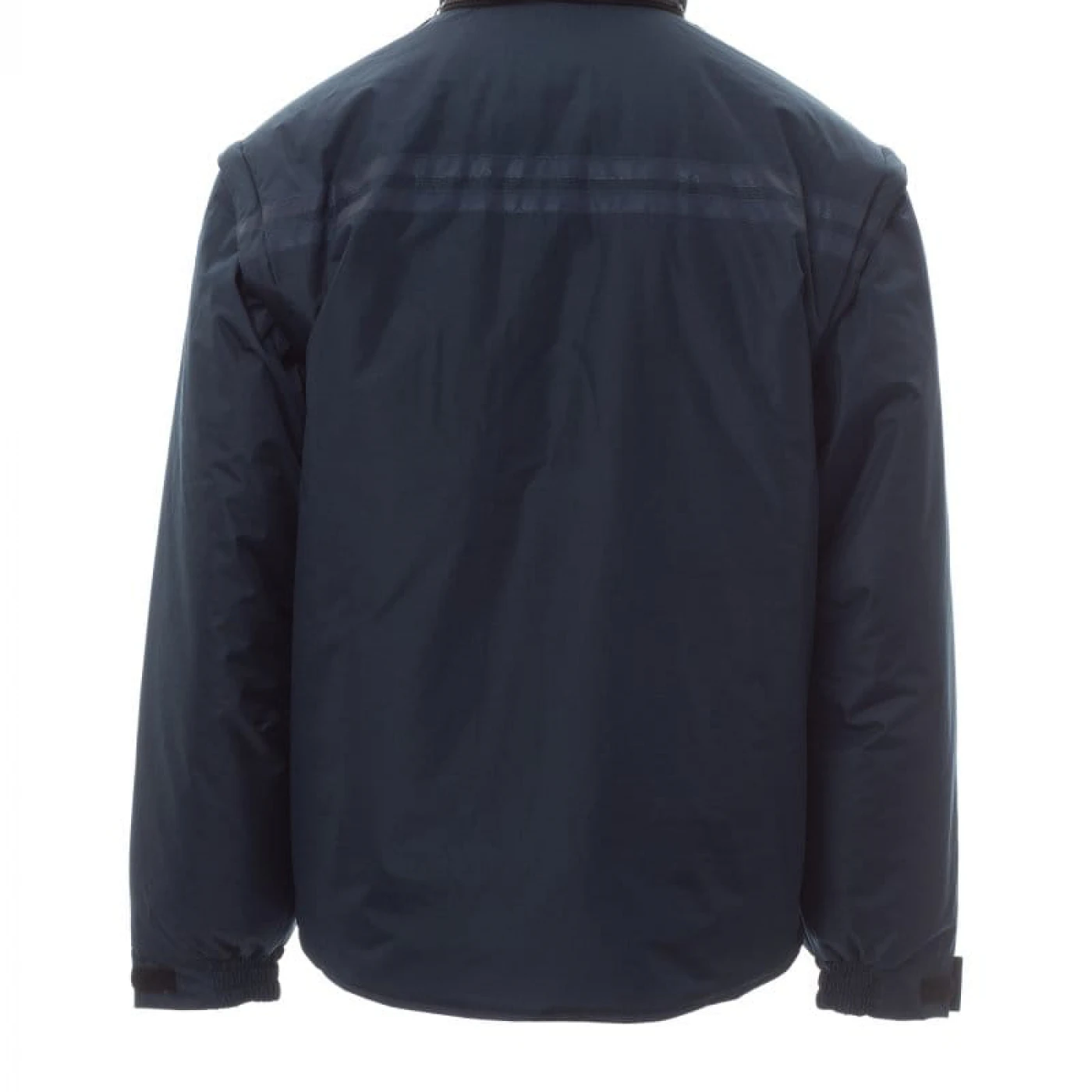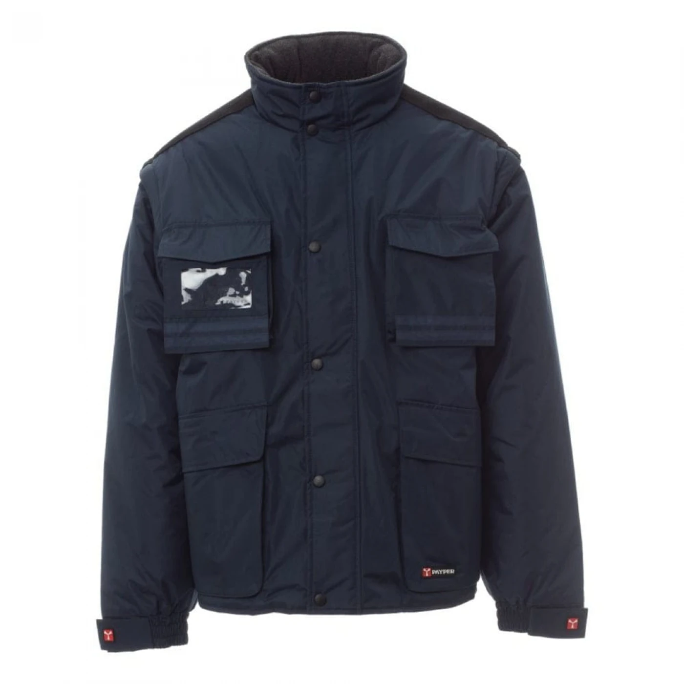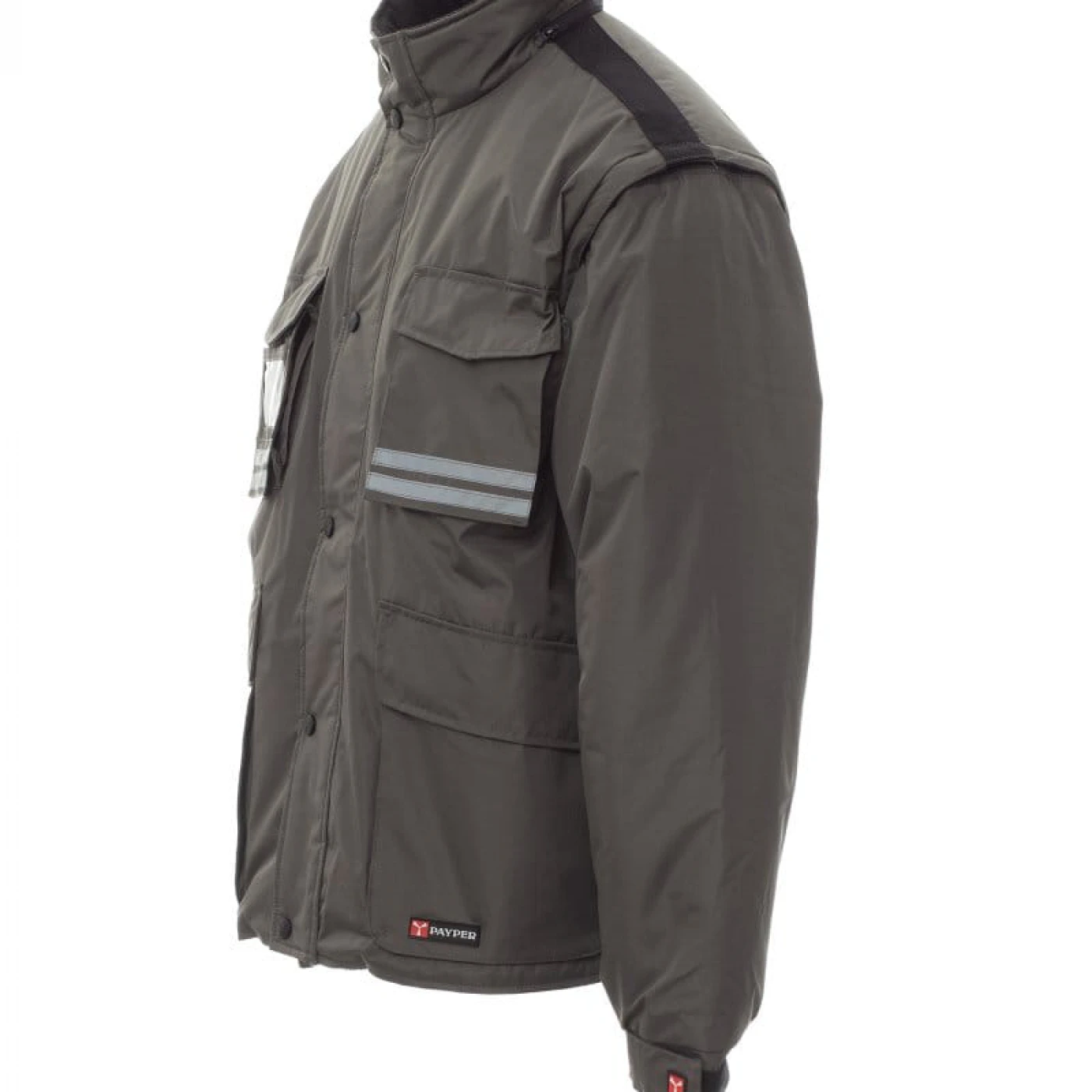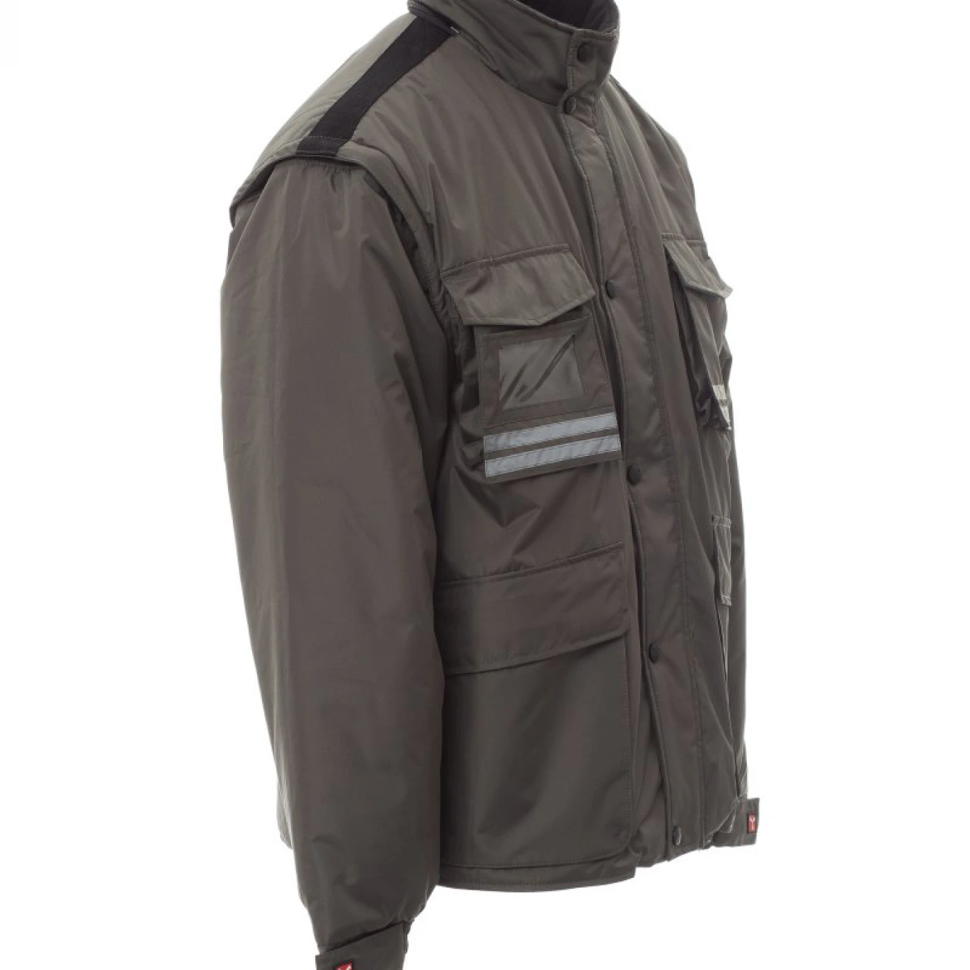 Jacheta de iarna pentru barbati, cu maneci detasabile, confectionata din poliester ripstop pongee. Materialul este impermeabil, rezistent la vânt, densitatea si textura tesaturii nu permit trecerea aerului si asigura o izolatie termica discreta. Închiderea se face cu un fermoar din plastic de 5 mm, prevazut cu un cursor metalic. Este echipata cu 5 buzunare exterioare, din care unul cu suport pentru ecuson, gluga pliabila, mansete reglabile, benzi reflectorizante pe buzunarele de la piept si pe spate, captuseala din micro-fleece la guler si spate, snur interior si fermoar care faciliteaza serviciile de imprimare si broderie. \n
