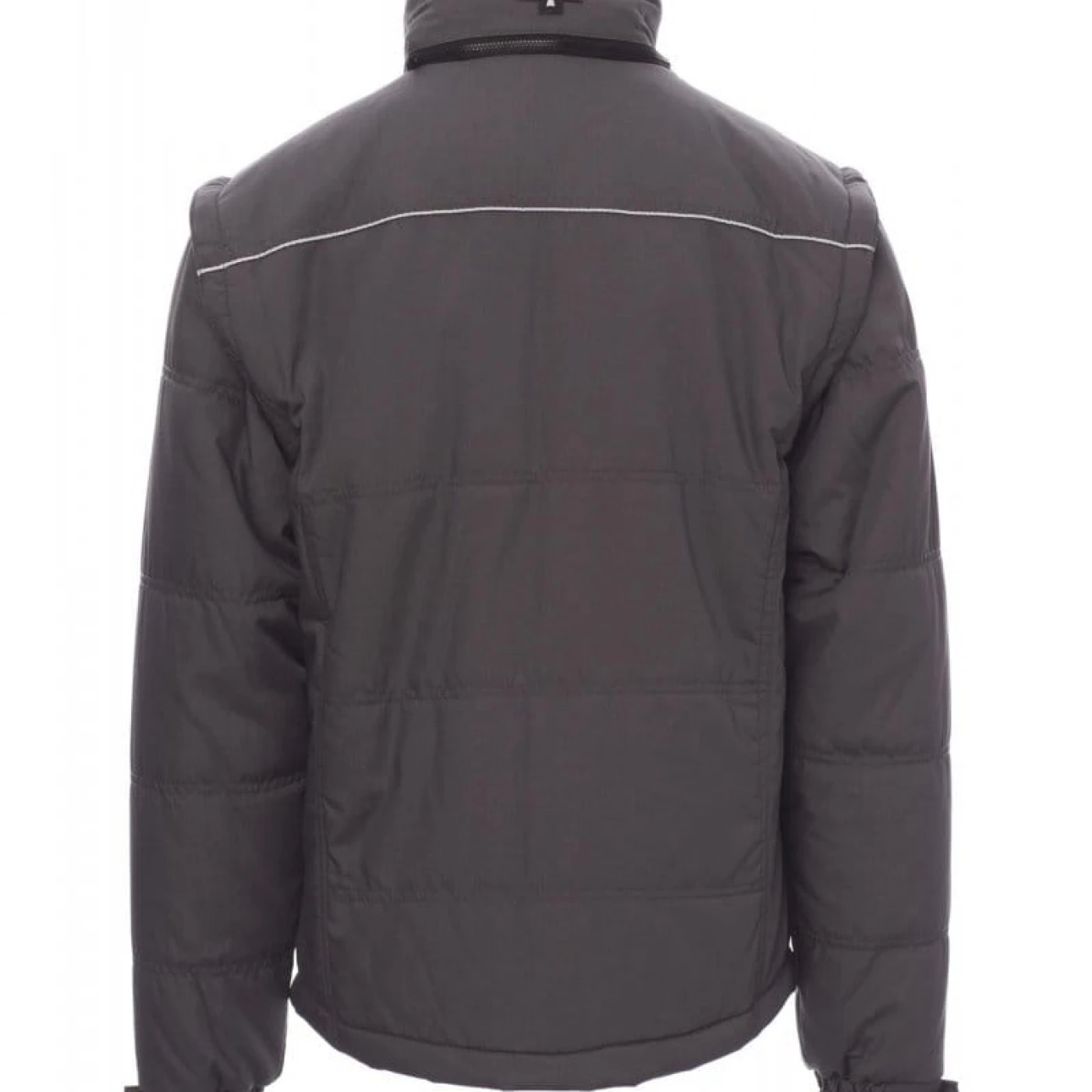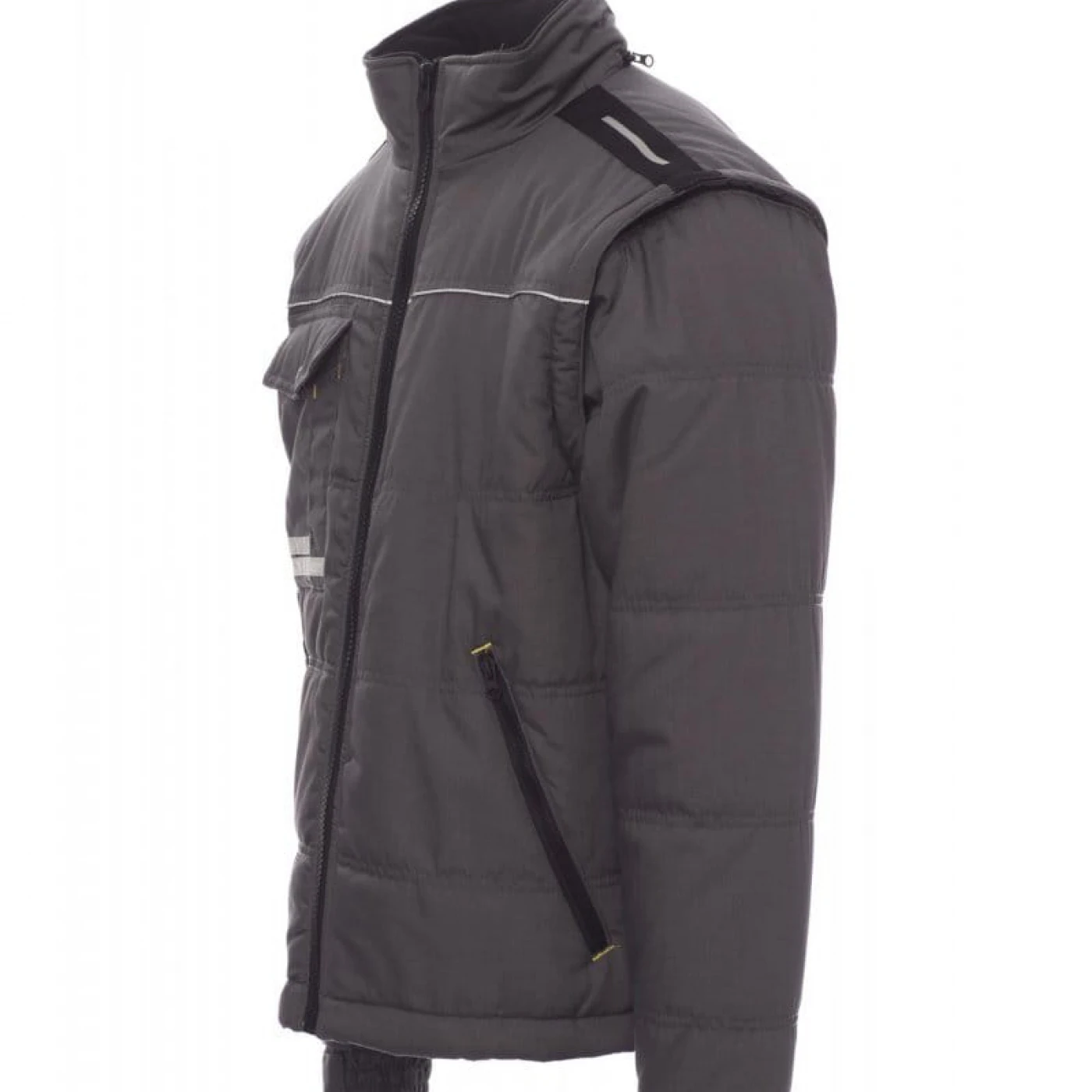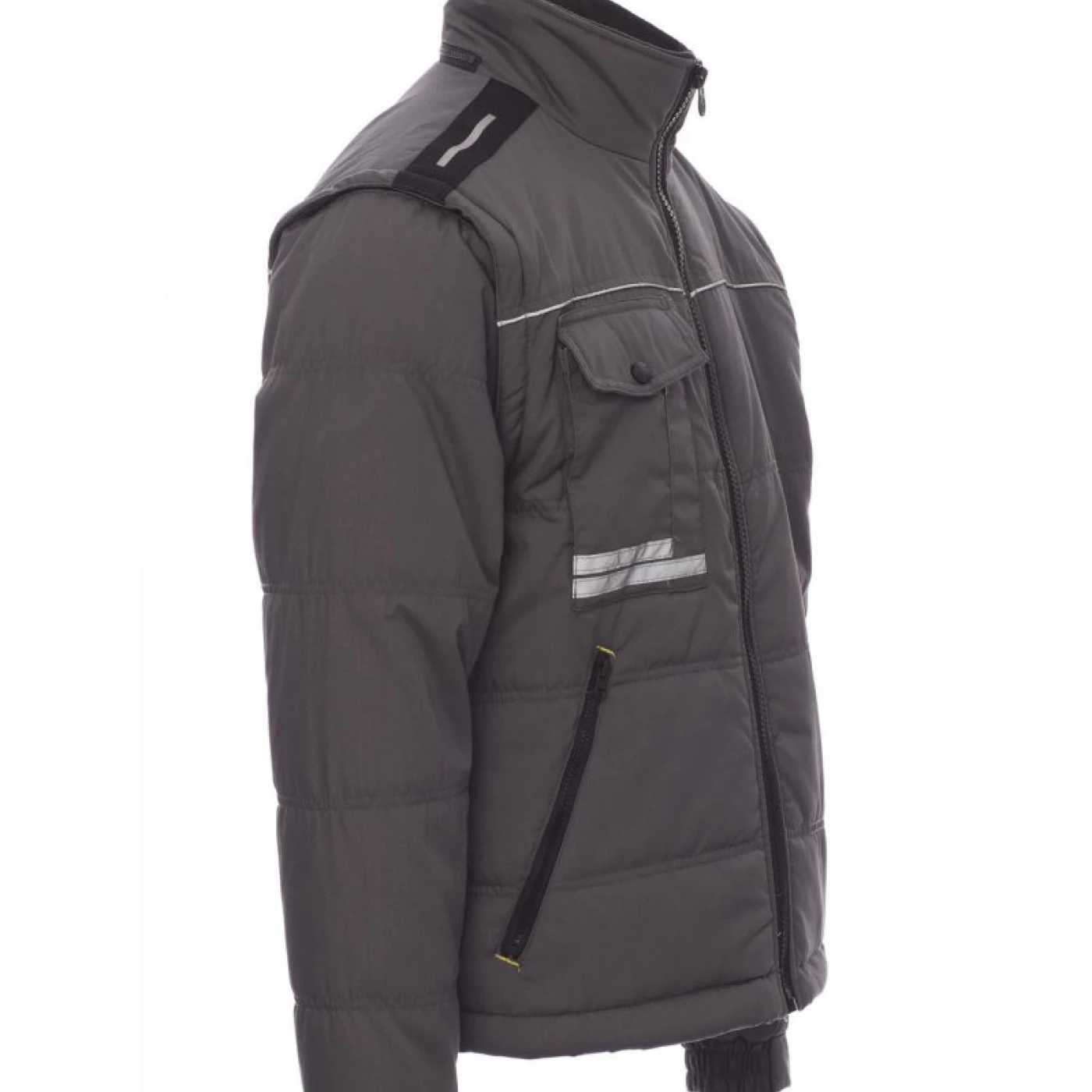 Jacheta pentru barbati cu maneci detasabile, gluga pliabila, partea interioara a gulerului din fleece, inchidere cu fermoar de 8 mm din plastic cu cursor metalic. Pe umar prezinta benzi de culoare contrastanta si paspoaluri de culoare alba pe spate si fata, doua buzunare laterale cu fermoar, un buzunar la piept multifunctional, cu dungi reflectorizante. Interiorul este matlasat si captusit cu materiale de inalta densitate oferindu-i un confort termic sporit. \n \n \n \n