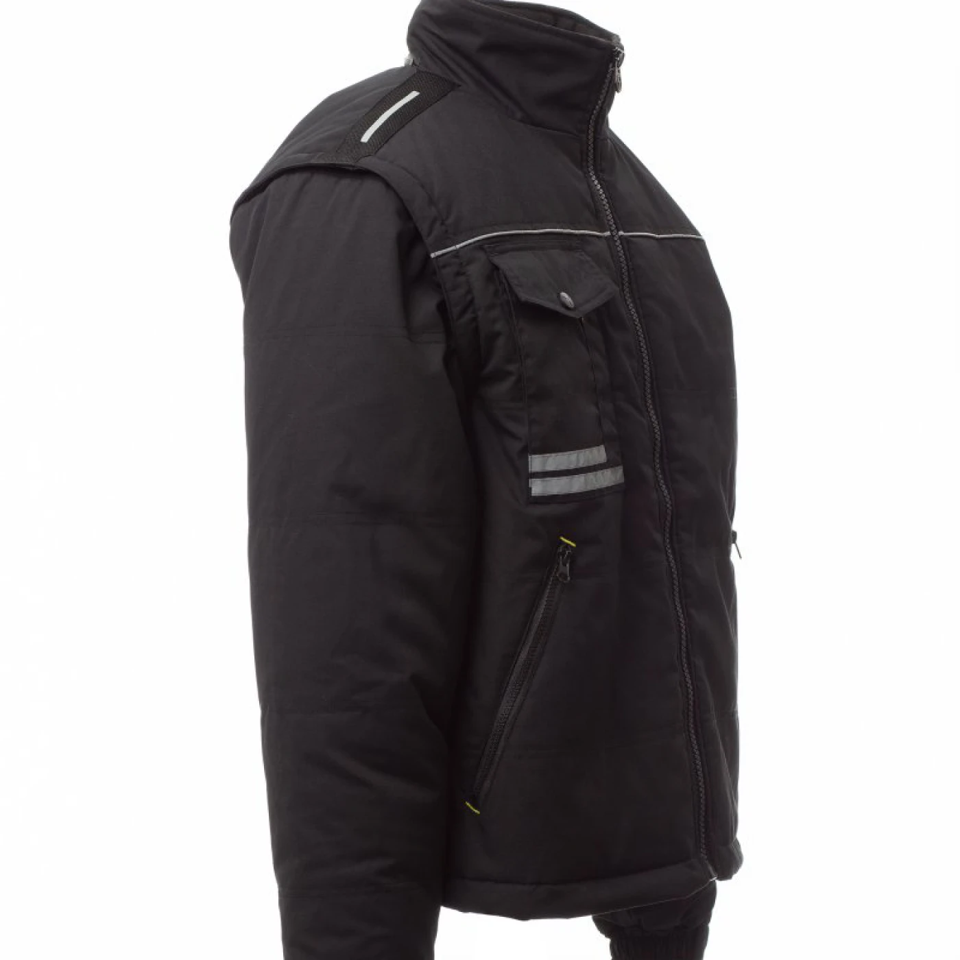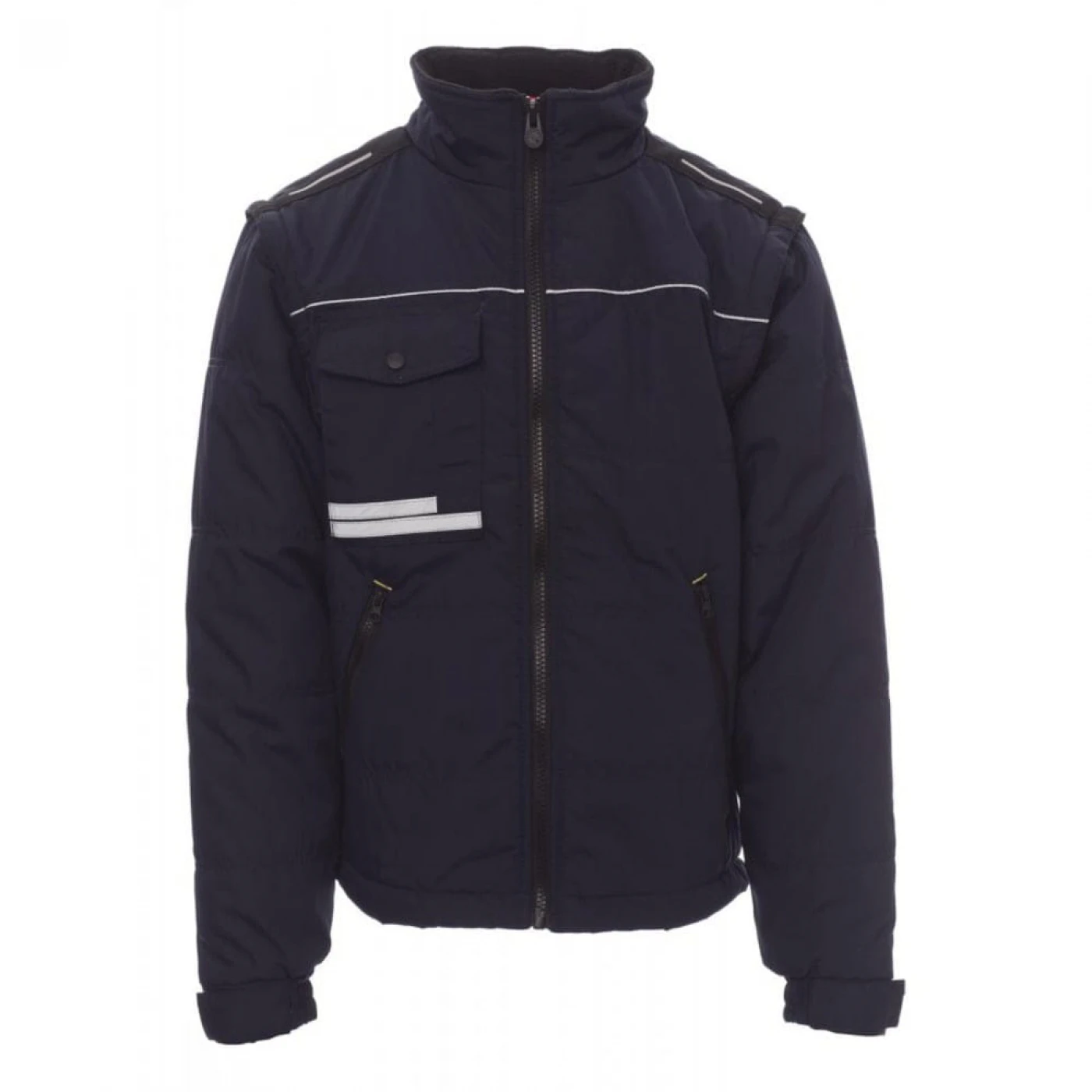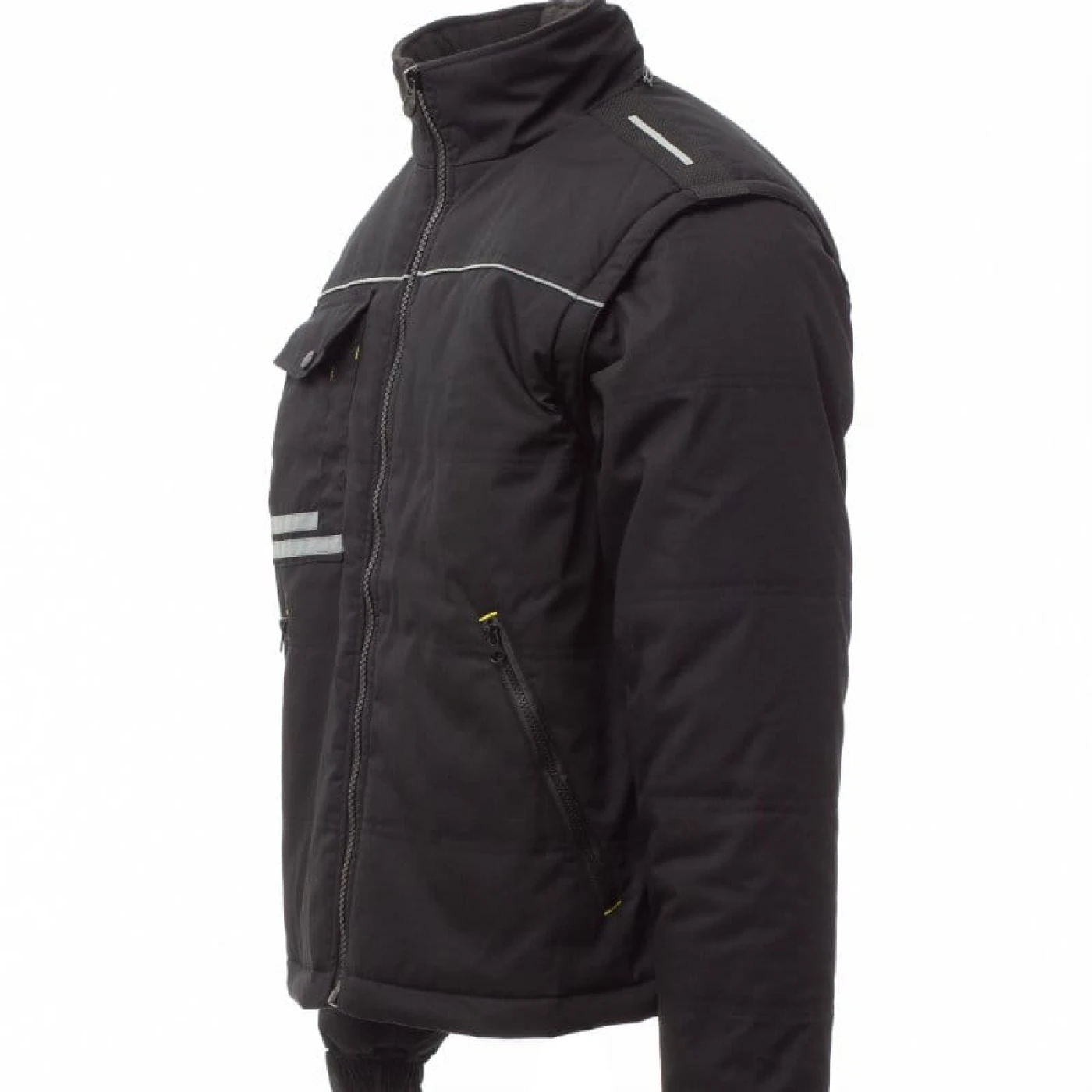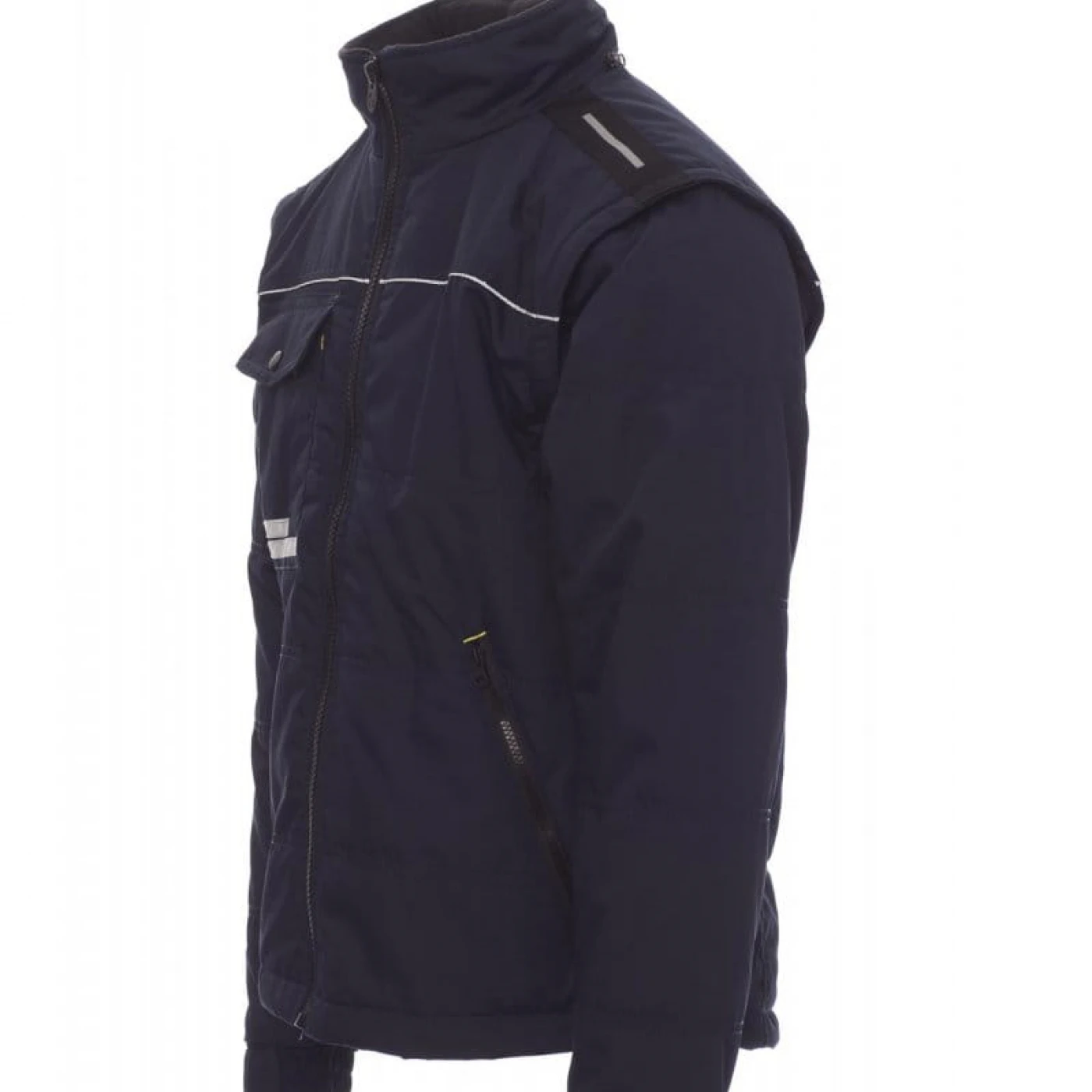 Jacheta pentru barbati cu maneci detasabile, gluga pliabila, partea interioara a gulerului din fleece, inchidere cu fermoar de 8 mm din plastic cu cursor metalic. Pe umar prezinta benzi de culoare contrastanta si paspoaluri de culoare alba pe spate si fata, doua buzunare laterale cu fermoar, un buzunar la piept multifunctional, cu dungi reflectorizante. Interiorul este matlasat si captusit cu materiale de inalta densitate oferindu-i un confort termic sporit. \n \n \n \n