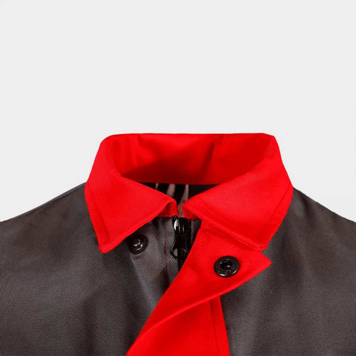 • închidere cu fermoar și plastron cu nasturi tic-tac;