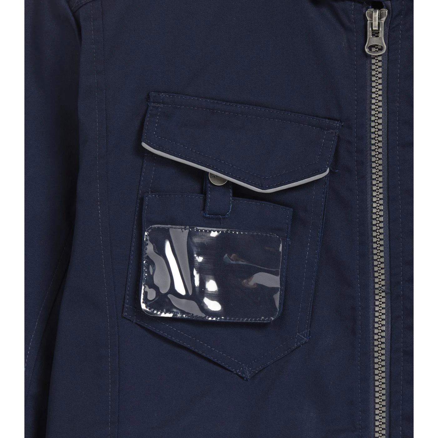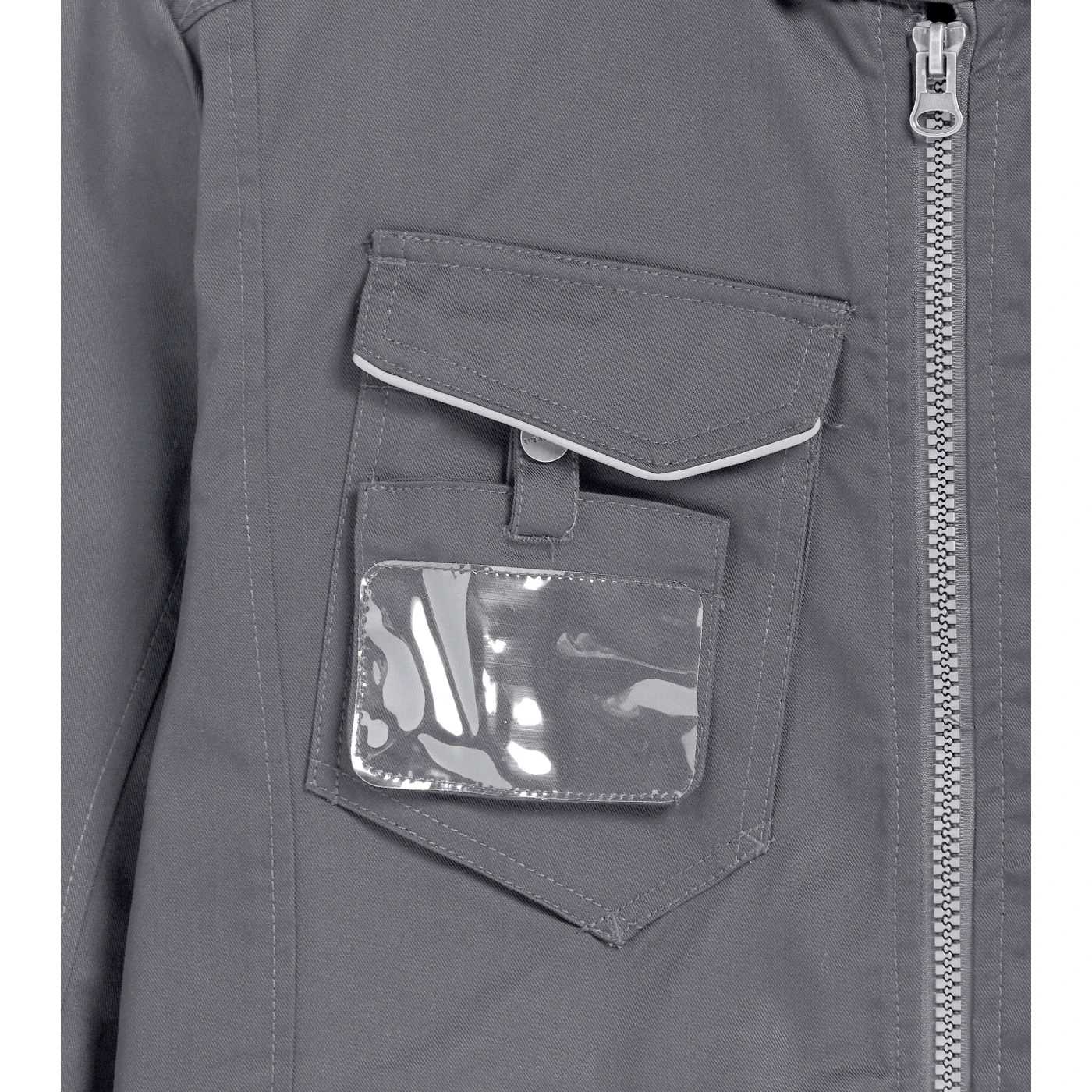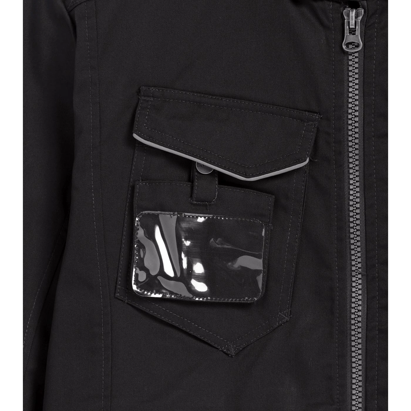 Multi-pocket jacket with Mandarin collar, adjustable waist and cuffs, badge holder, reflective details, zip hand pockets, inside pocket, triple stitching, sleeves with ergonomic cut.