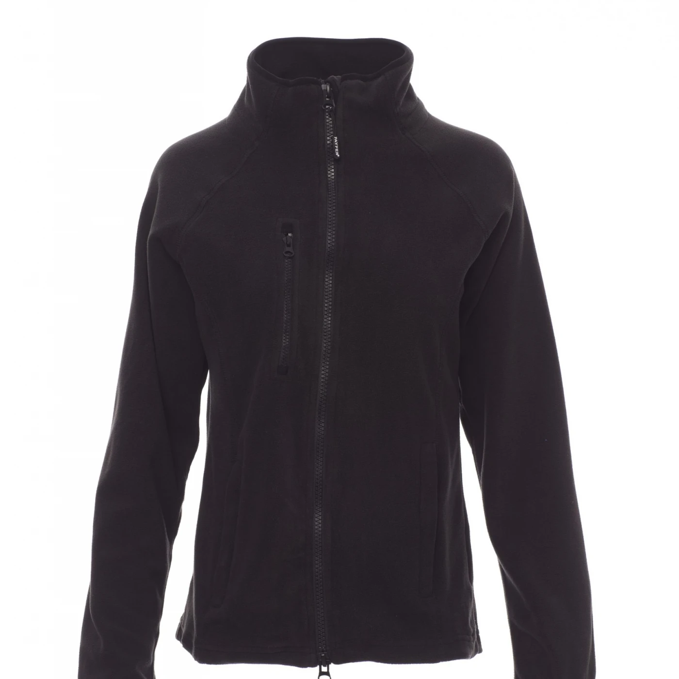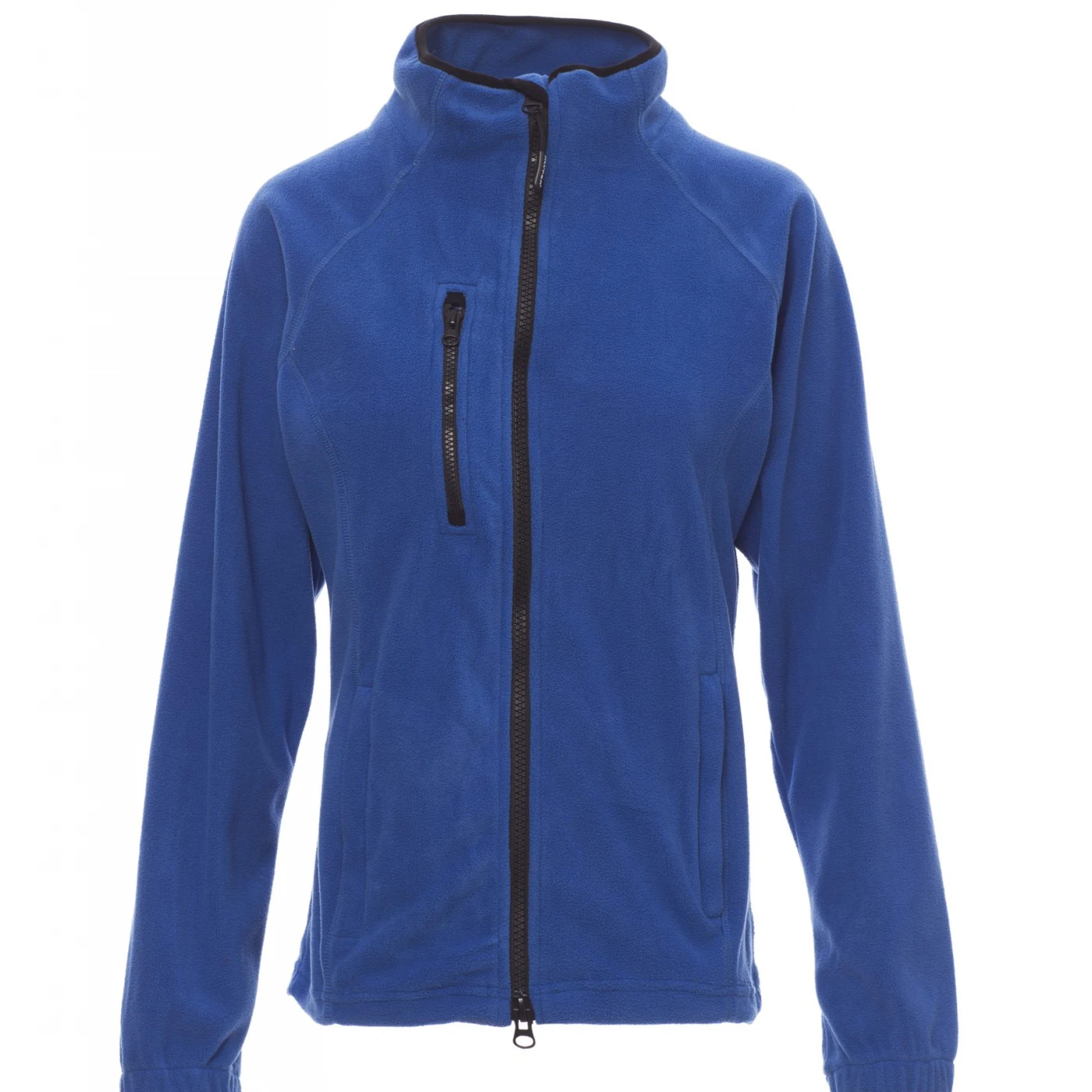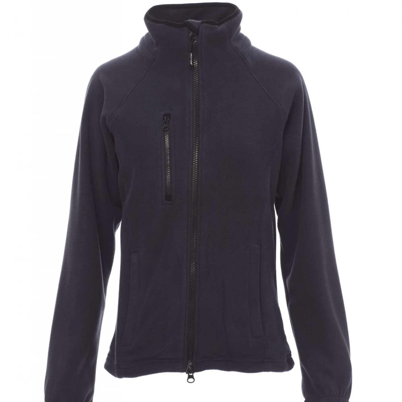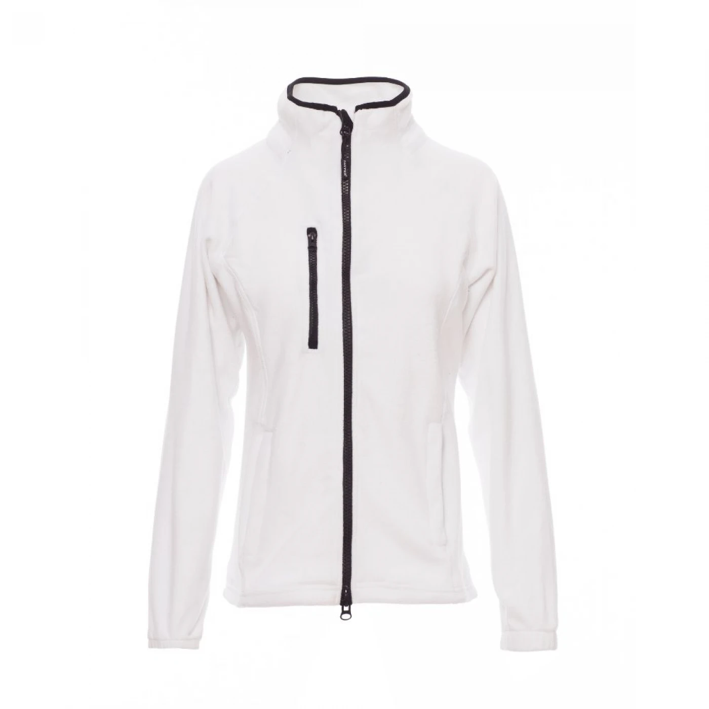Jacheta polar fleece pentru femei, calduroasa si confortabila. Inchidere frontala cu fermoar din plastic negru, mânecă raglan, șnur reglabil în talie, mansete elastice. Echipata cu două buzunare laterale si unul frontal, toate cu fermoar ascuns. Gulerul are margine întărită, în nuanță contrastantă. \n