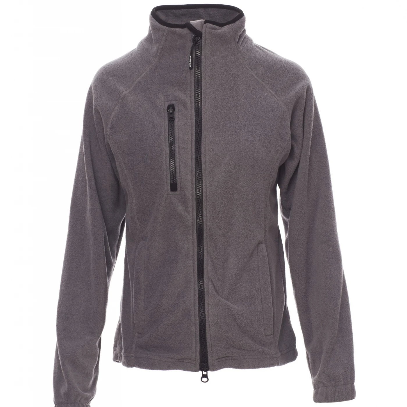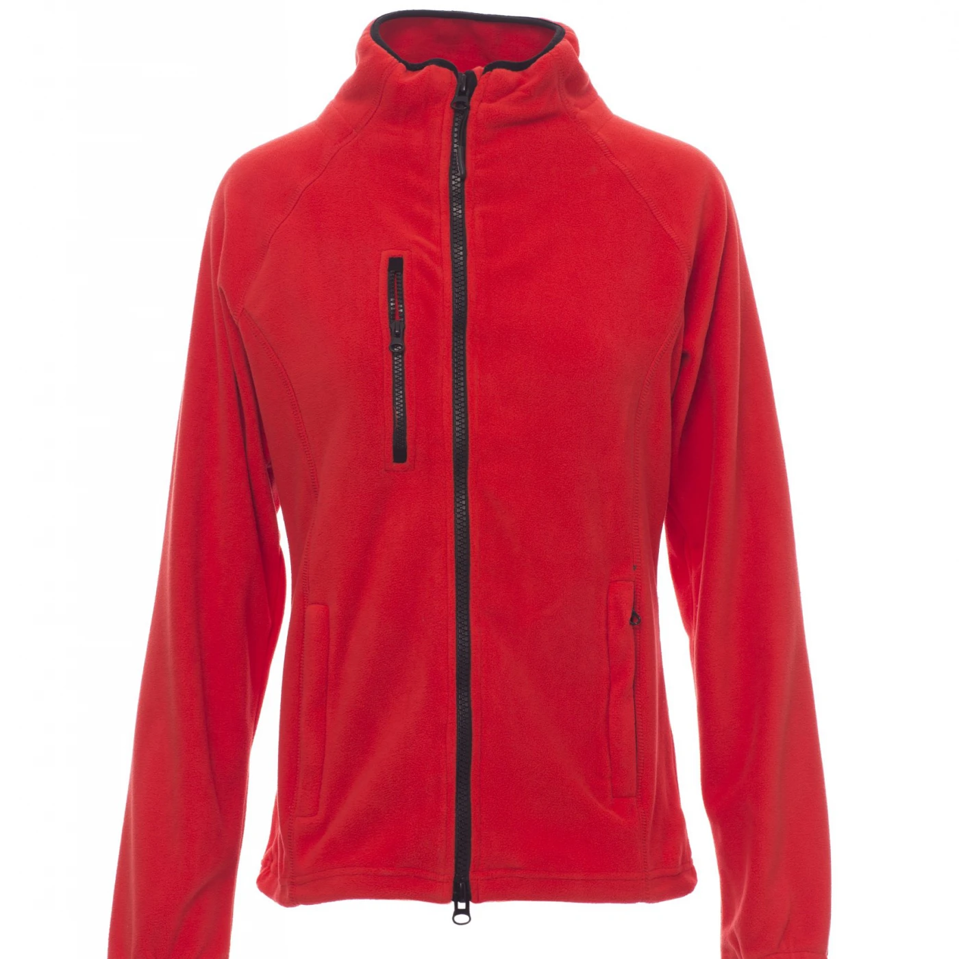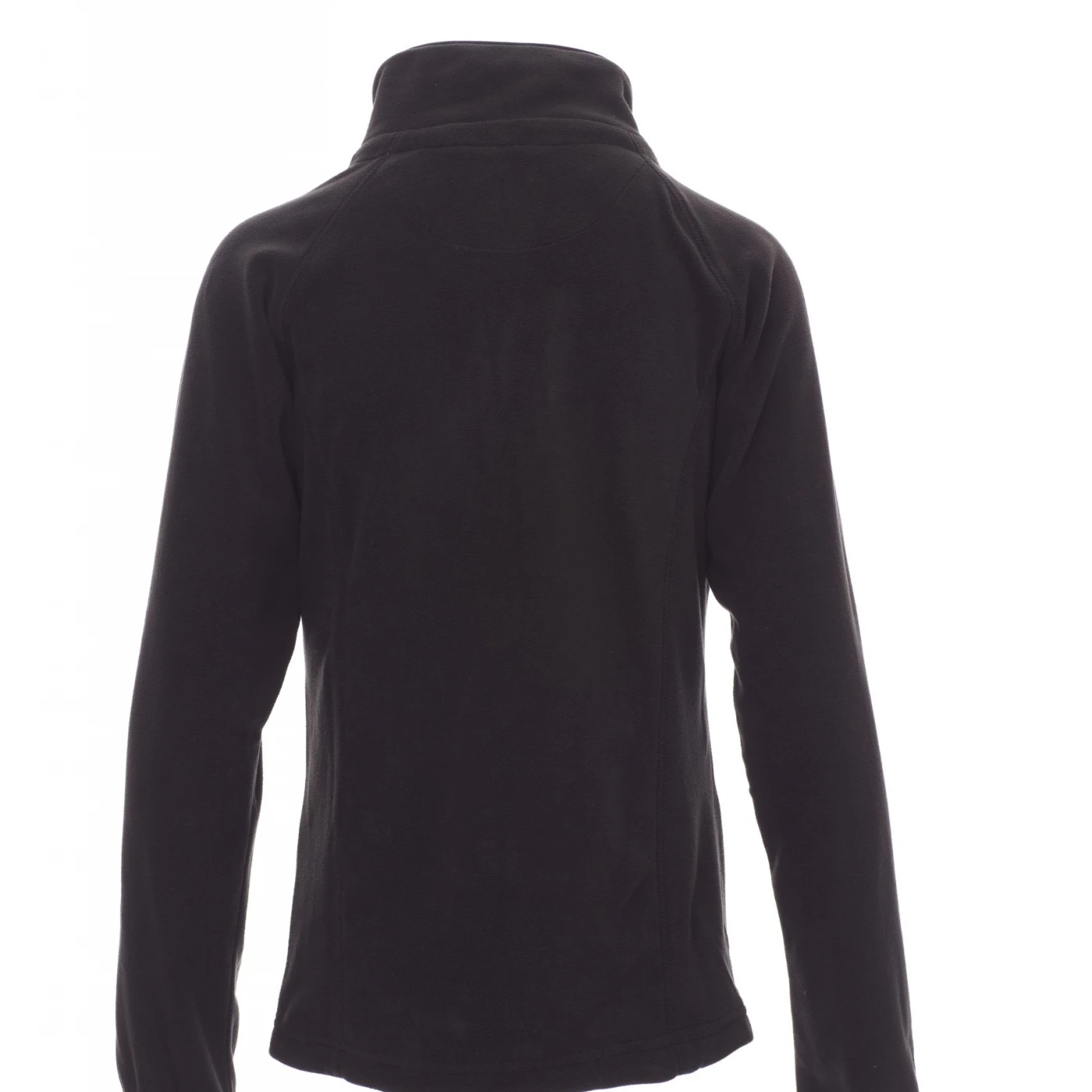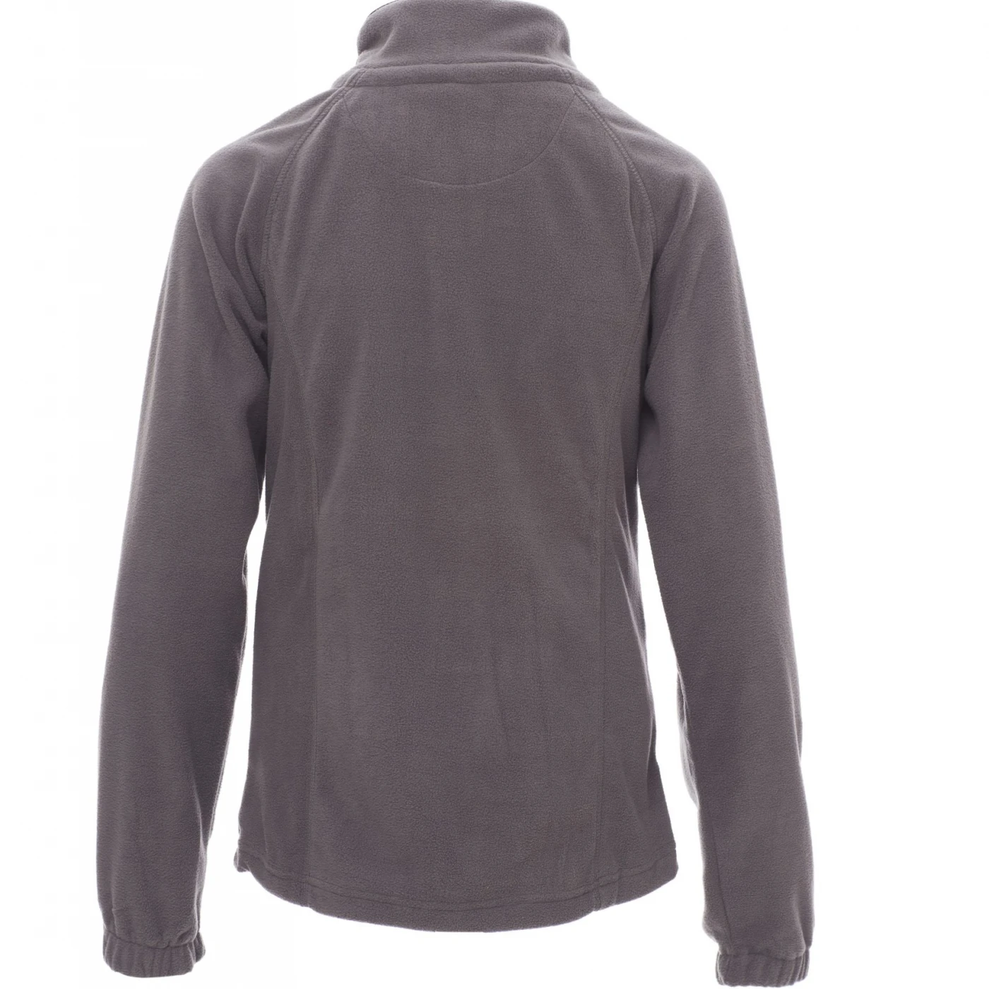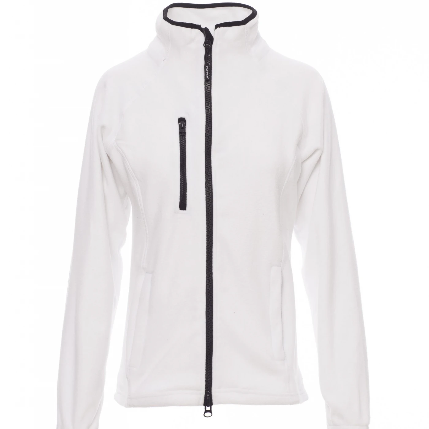 Jacheta polar fleece pentru femei, calduroasa si confortabila. Inchidere frontala cu fermoar din plastic negru, mânecă raglan, șnur reglabil în talie, mansete elastice. Echipata cu două buzunare laterale si unul frontal, toate cu fermoar ascuns. Gulerul are margine întărită, în nuanță contrastantă. \n