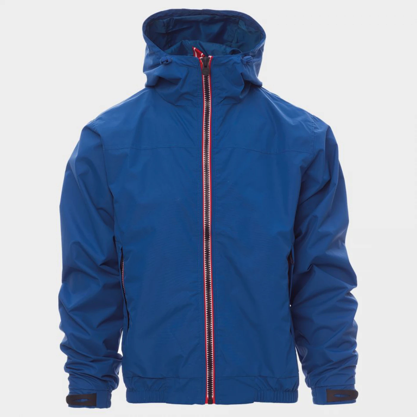 Jachetă pentru bărbați, fermoar de 8 mm în nuanță contrastantă, glugă cu două cusături și șnur, bandă elastică în talie și la manșete, bride de ajustare elastice la nivelul manșetelor, două buzunare exterioare cu fermoar acoperit. La interior: nevătuită, cu căptușeală tip plasă, un buzunar cu fermoar pentru smartphone cu spațiu necesar pentru cablu, fermoar pe piept și pe spate ce facilitează serviciile de imprimare serigrafică și broderie.