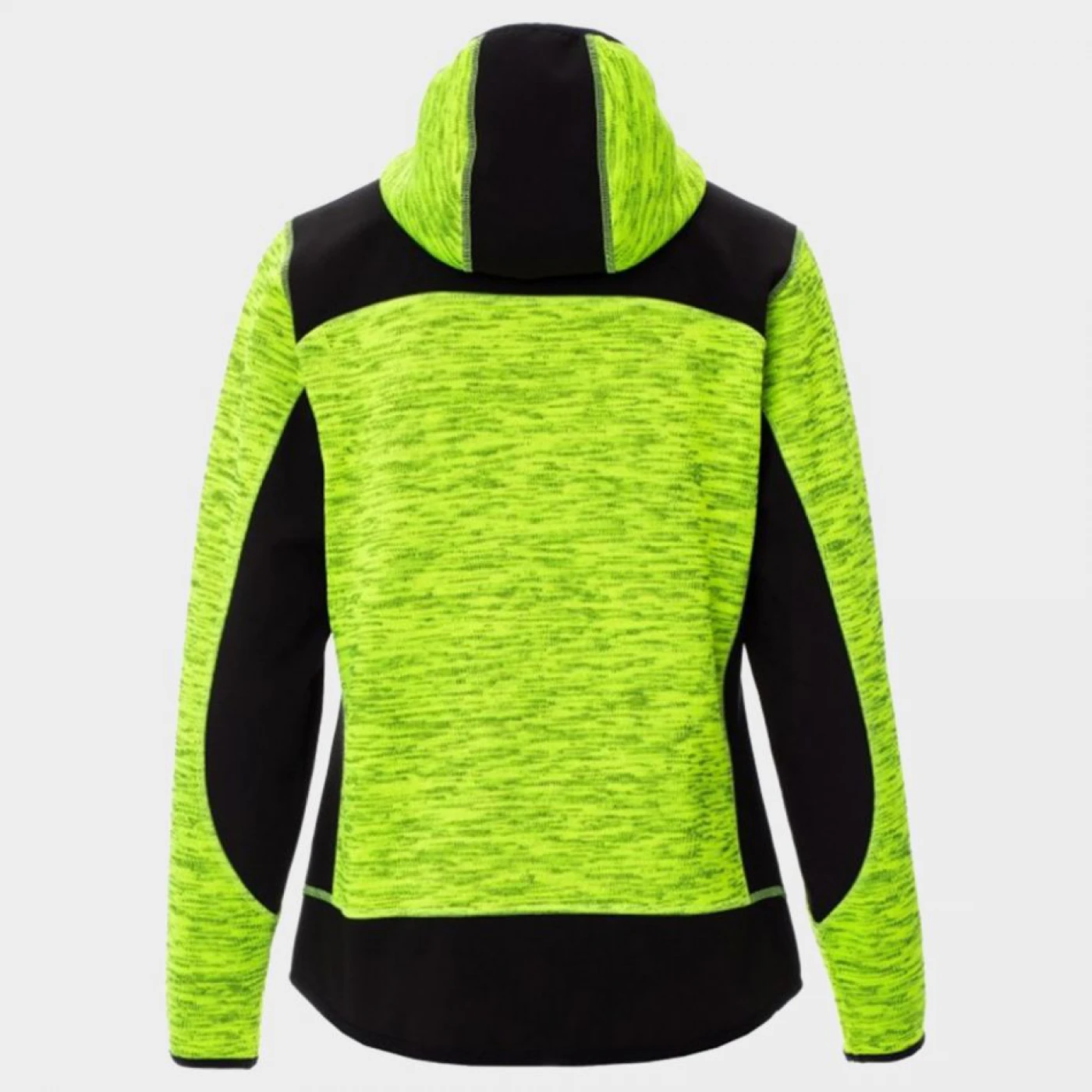 Jachetă ergonomică pentru femei, fermoar lung SBS cu bandă, glugă cu două cusături, benzi elastice în zona manșetelor și în talie, două buzunare laterale cu fermoar, un buzunar la piept. Detaliu din tricot cu inserții din softshell negru.