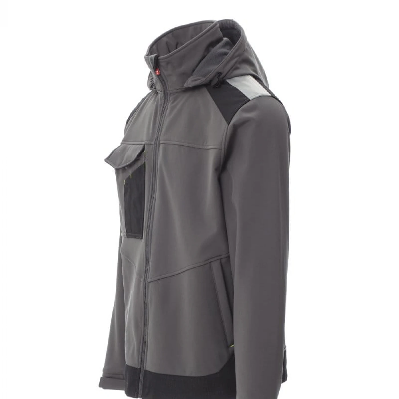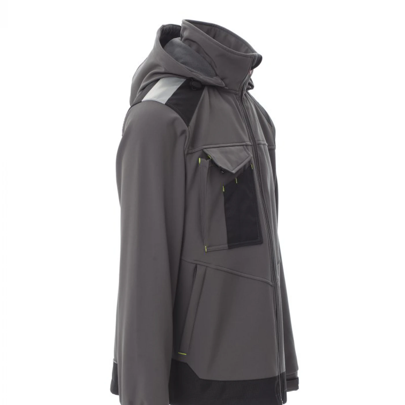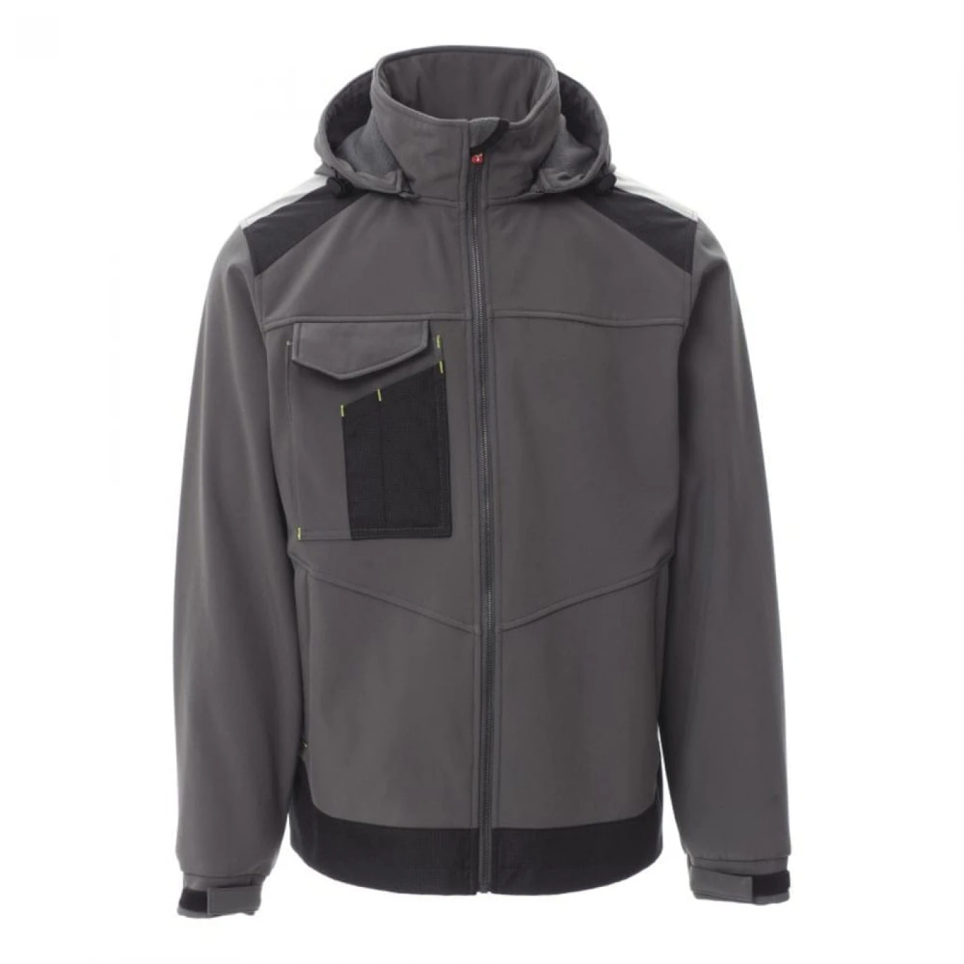 Jacheta softshell pentru barbati cu gluga detasabila, cu fermoar si strangere cu snur din material elastic, reglabil cu opritor. Inchiderea jachetei este integrala cu fermoar SBS si cu cursor metalic „semi-autolock”. In partile laterale are doua buzunare, inchise cu fermoar si un buzunar multifunctional la piept, prevazut cu suport pentru ecuson si clapeta de inchidere LOCK SYSTEM. Mansetele sunt elastice si reglabile cu velcro. La nivelul umerilor prezinta benzi reflectorizante 3M si material contrastant. Tesatura softshell este compusa din straturi ce asigură impermeabilitate, respirabilitate, rezistență la vânt și elasticitate cu o rezistență mecanică excelentă. Datorita acestei tehnologii softshell, aceasta jacheta ofera un confort sporit, asigurand de 3 ori mai mult circulatia aerului, oferind o eficienta reglare a temperaturii corpului in timpul activitatilor efectuate.