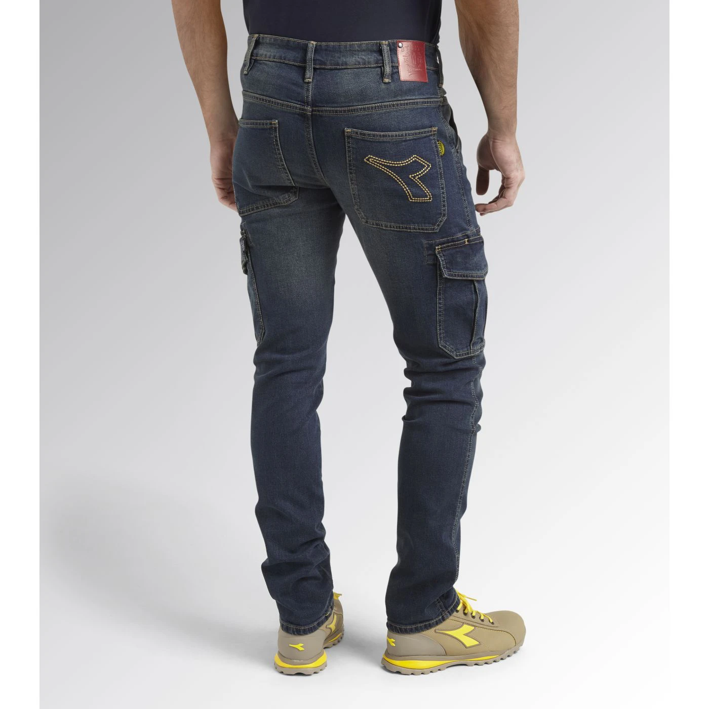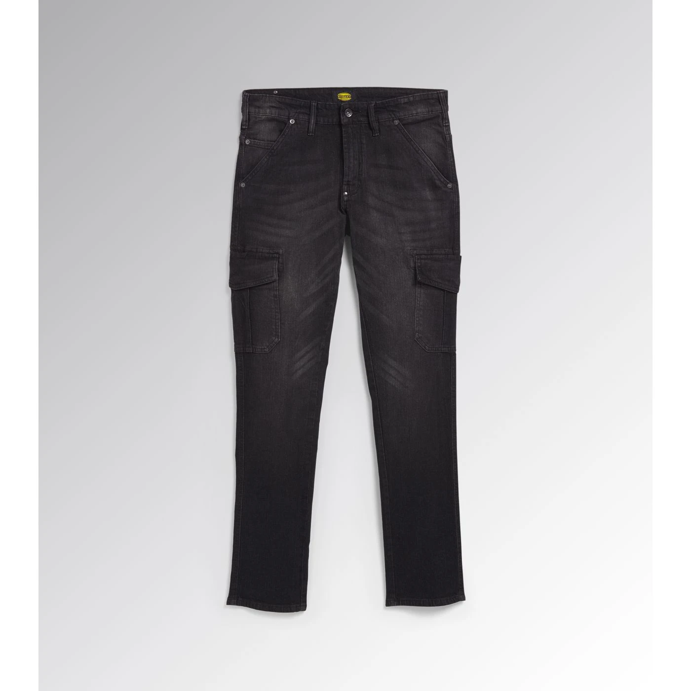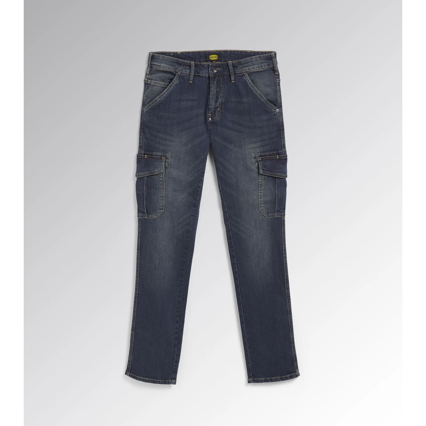 Stonewashed stretch denim trousers. Fabric treatments and attention to detail typical of Italian jeans design. Large, spacious side pockets with pen holder.