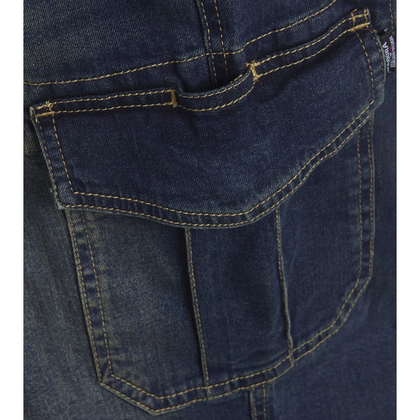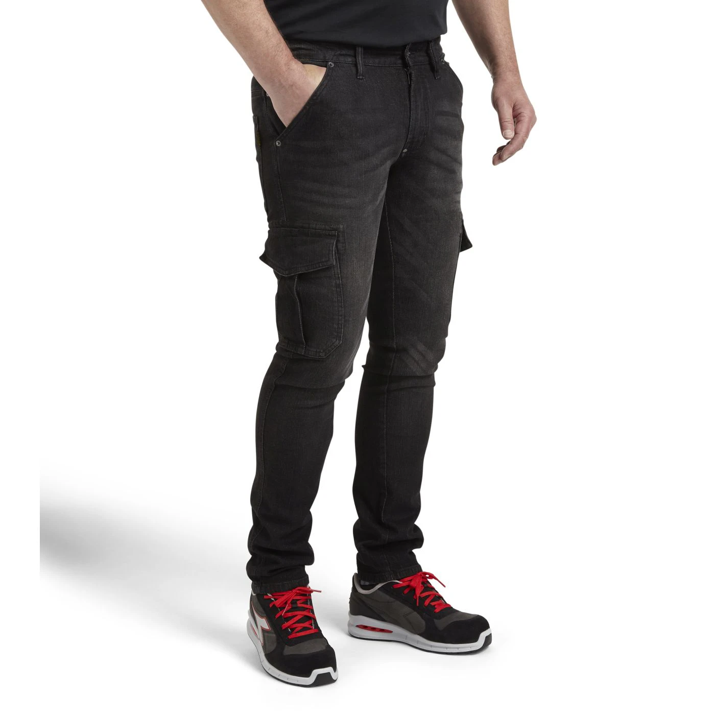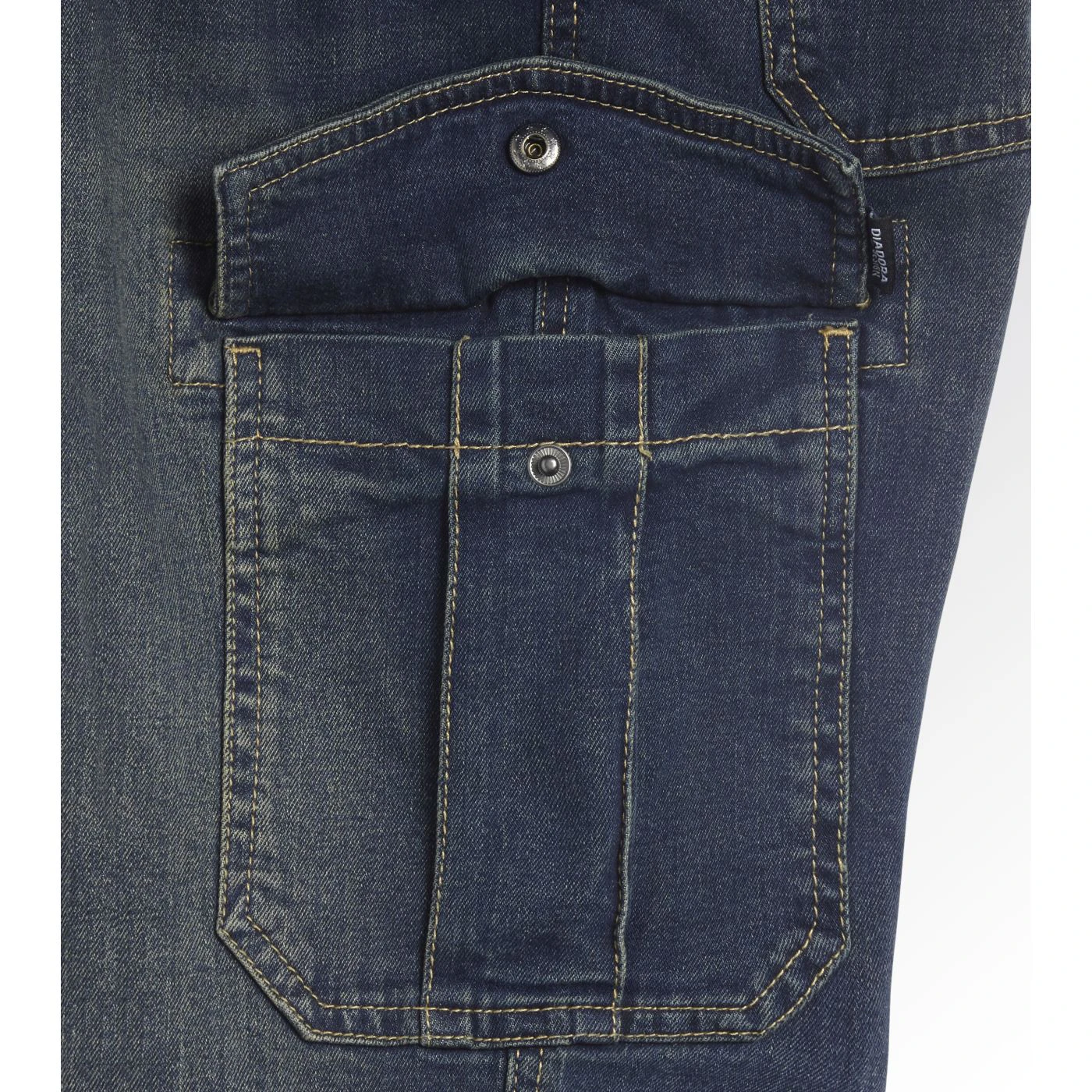 Stonewashed stretch denim trousers. Fabric treatments and attention to detail typical of Italian jeans design. Large, spacious side pockets with pen holder.