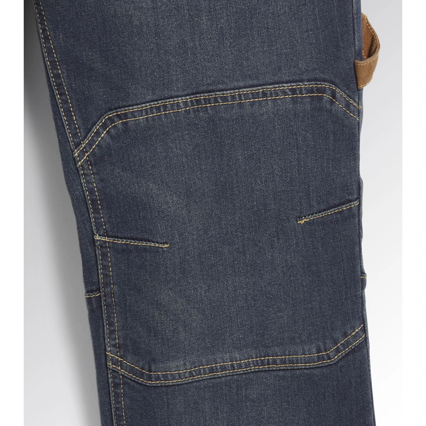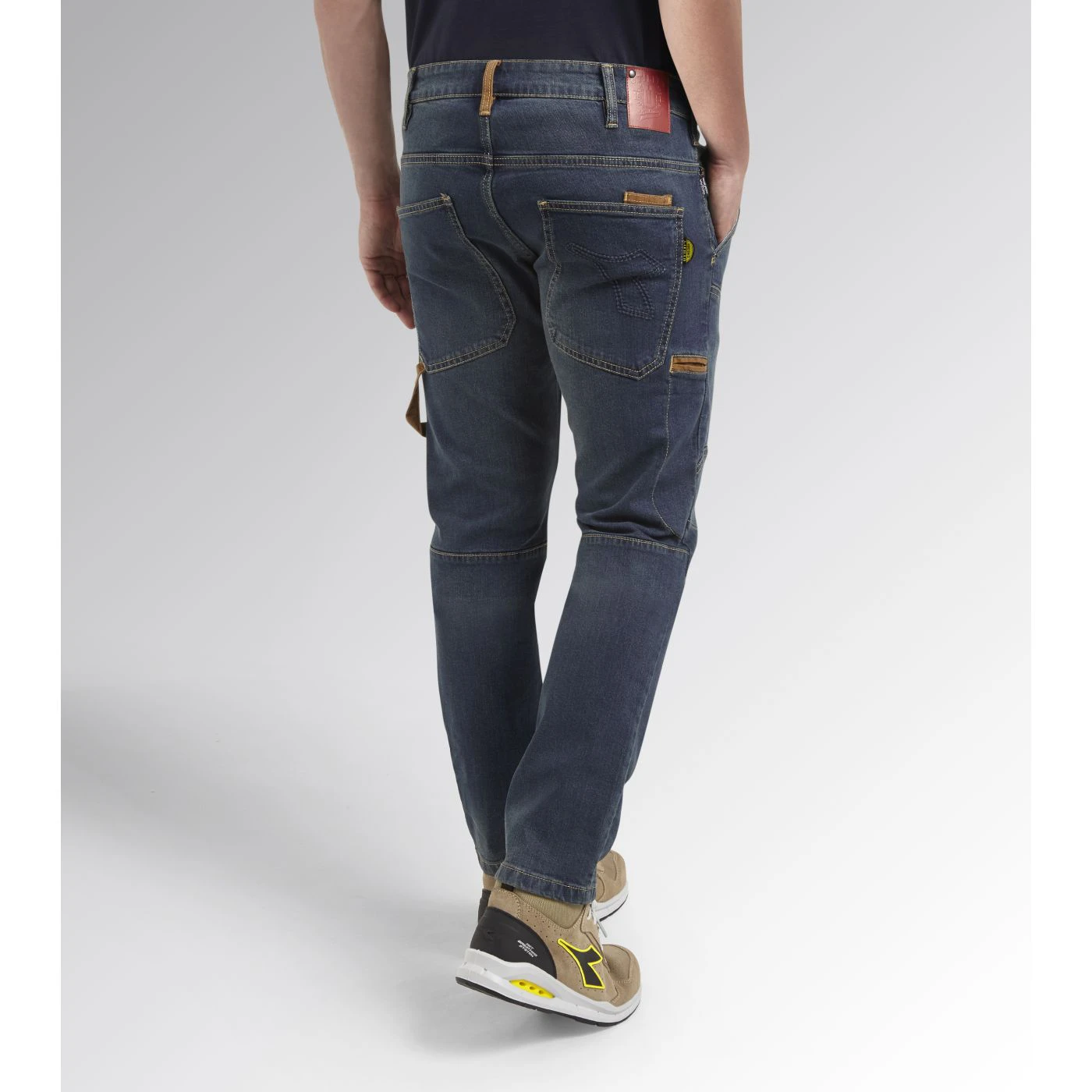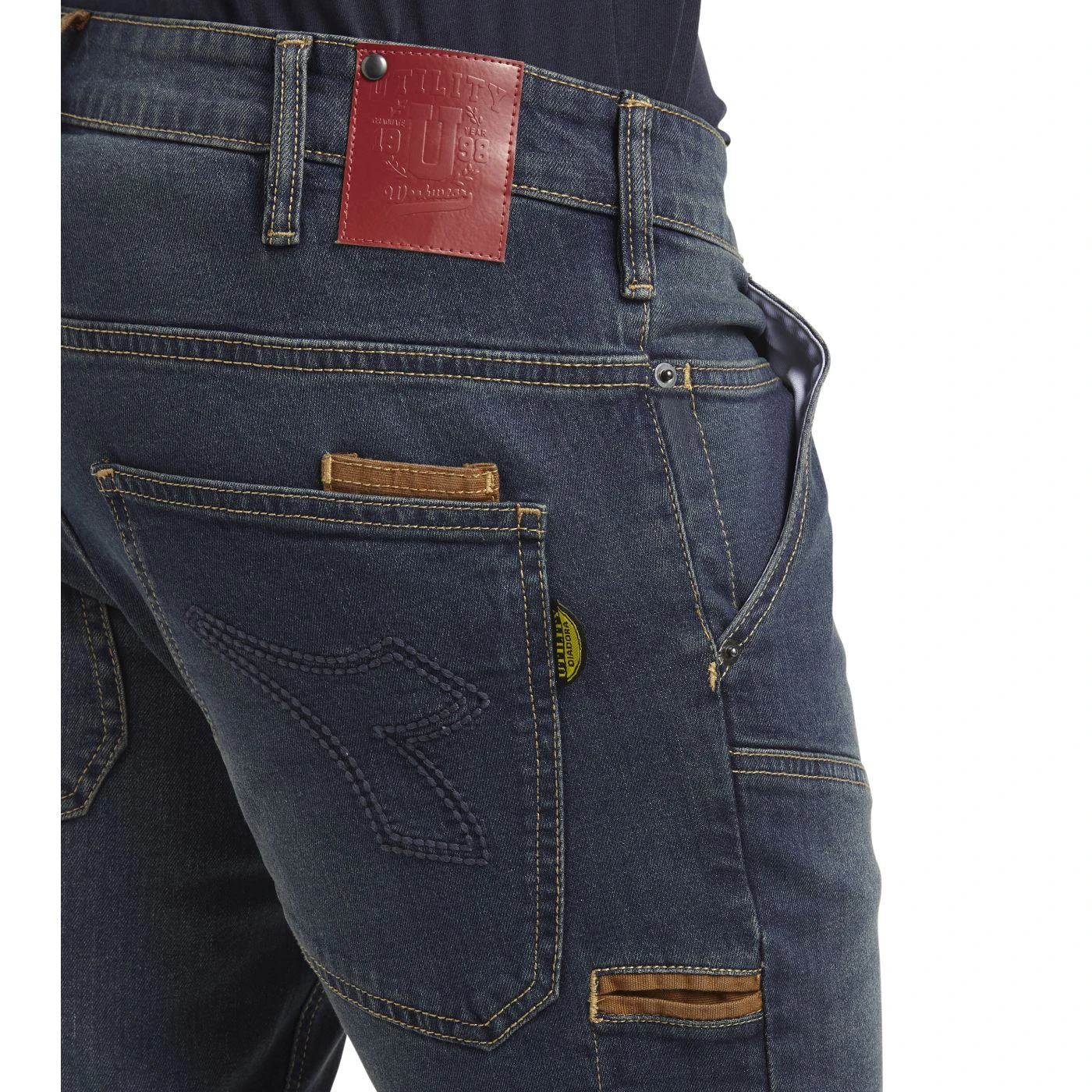 Stonewashed stretch denim trousers. Fabric treatments and attention to detail typical of Italian jeans design. Ergonomic knee pads and cuts, ruler and hammer holder, contrast canvas details.