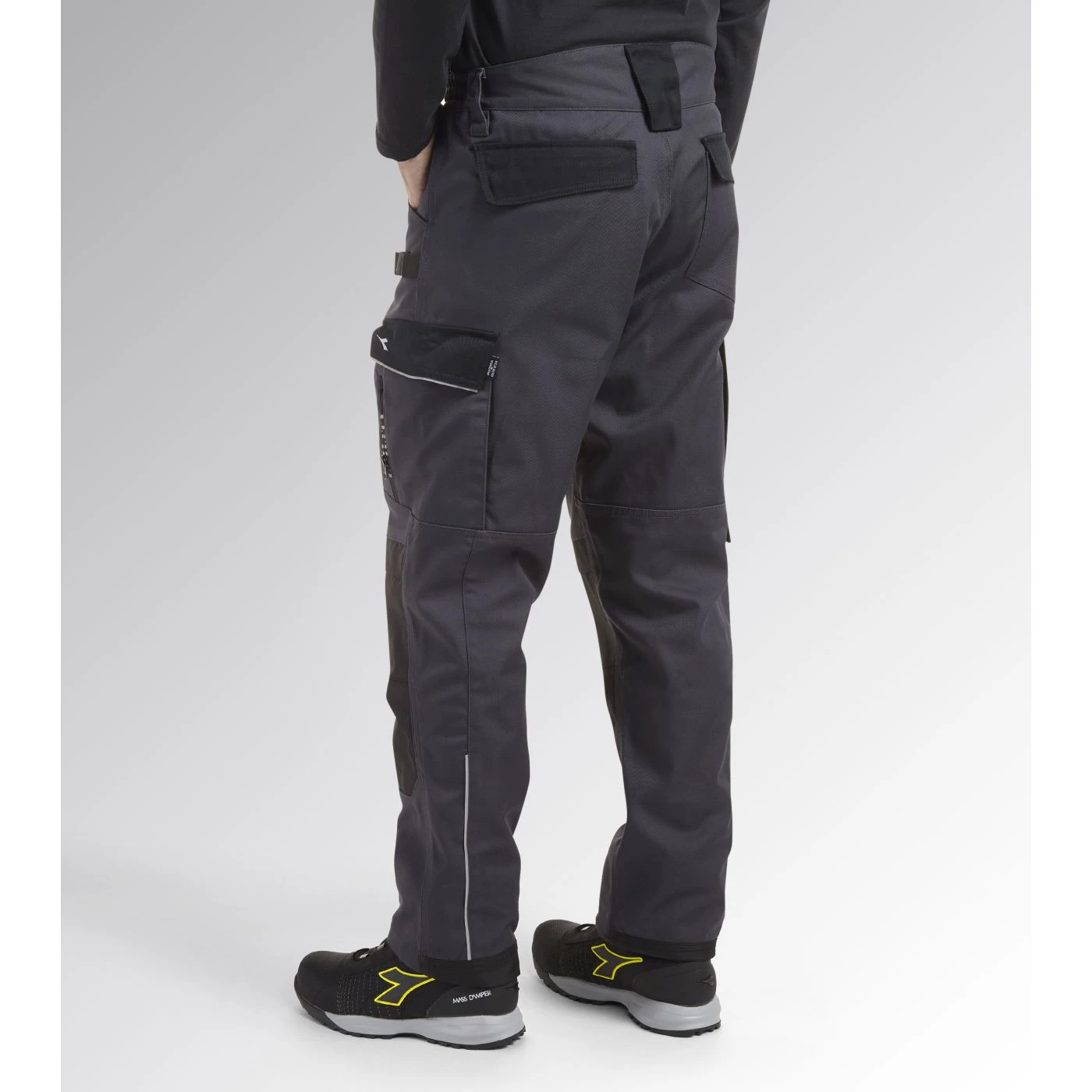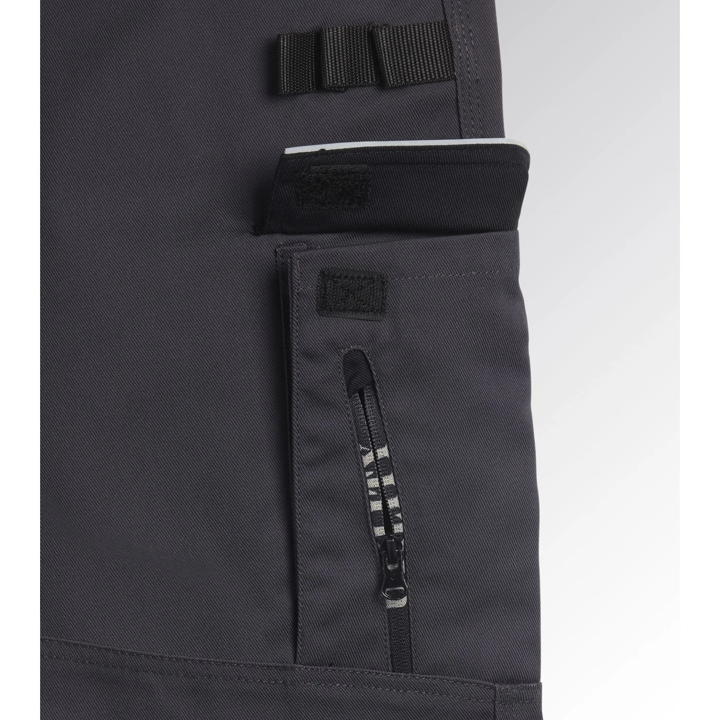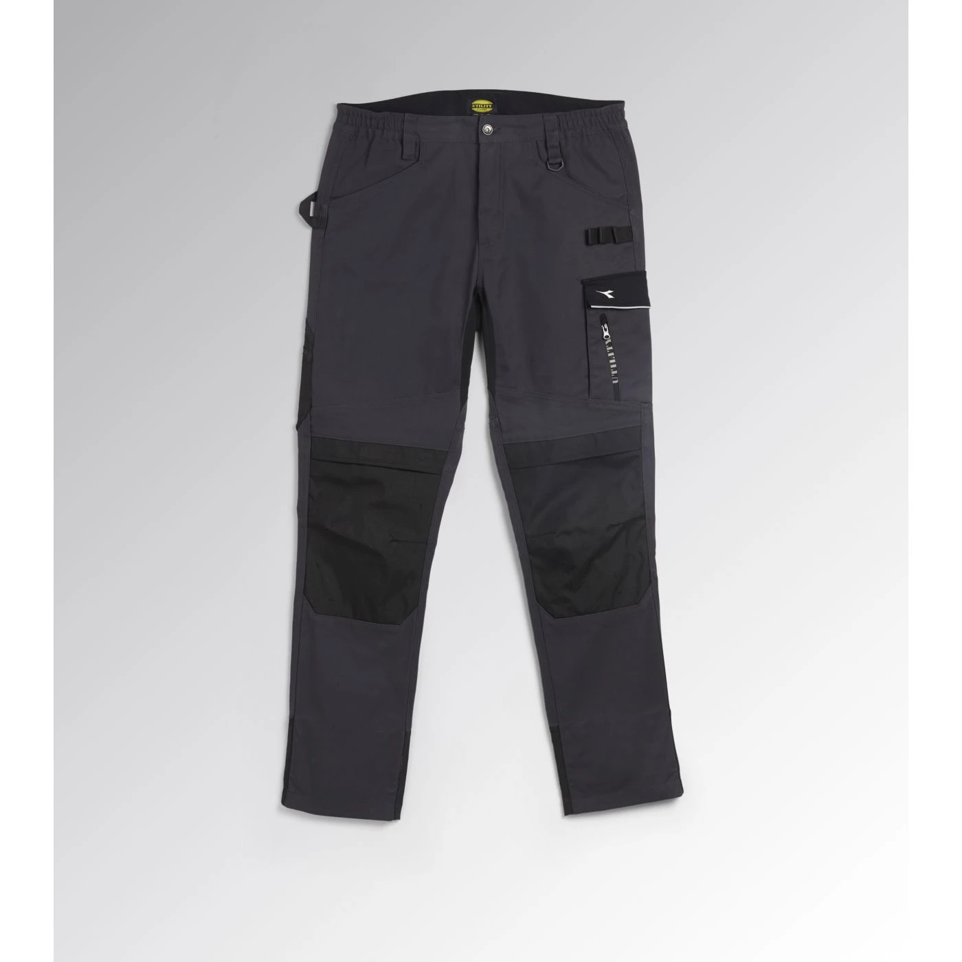 Cotton polyester trousers with water-resistant knee pad with opening on the upper side, side tool pocket, hammer and ruler holder in abrasionresistant material. Contoured belt and elasticated crotch insert for greater mobility. Triple stitching, reflective details. Ergonomic leg and adjustable length with press studs.