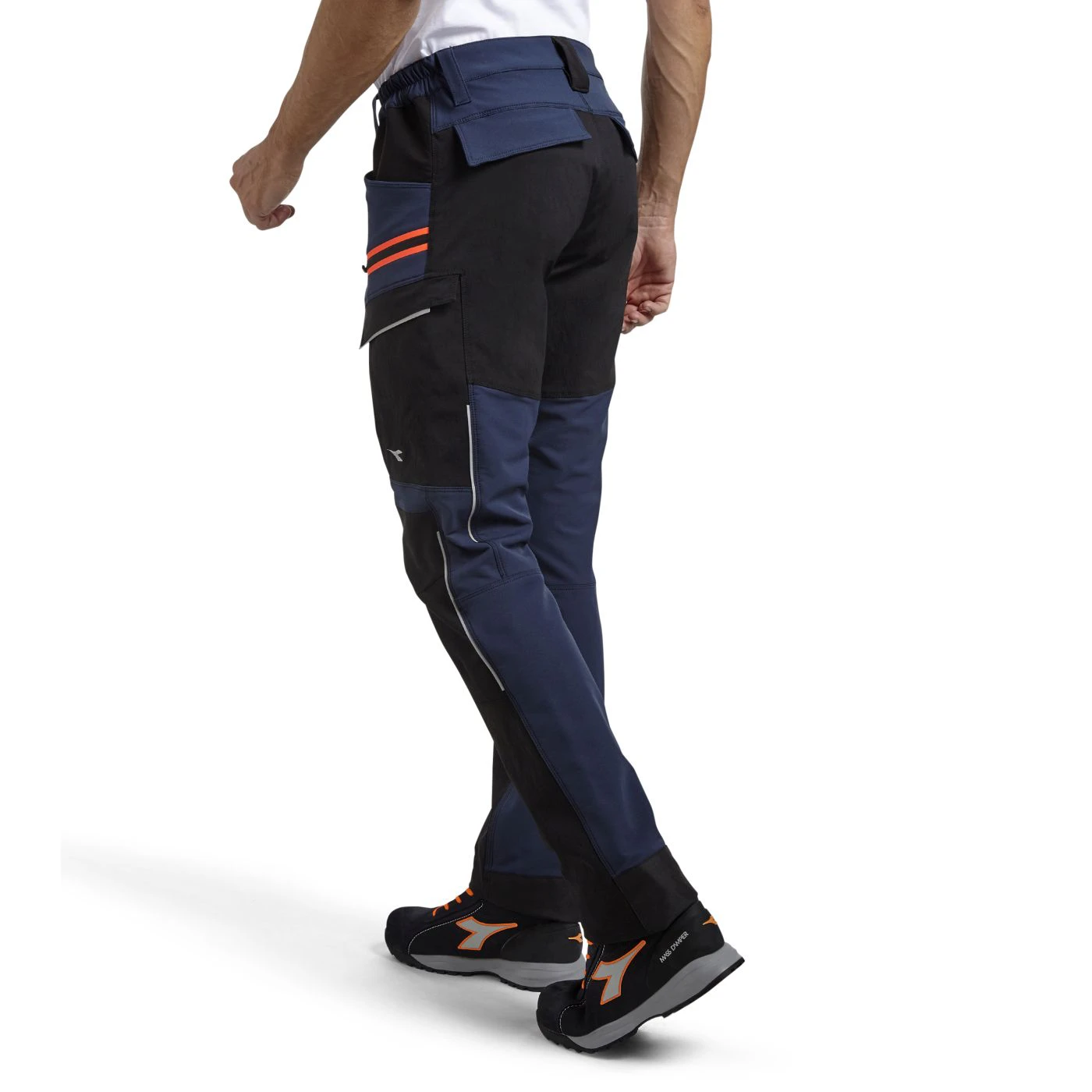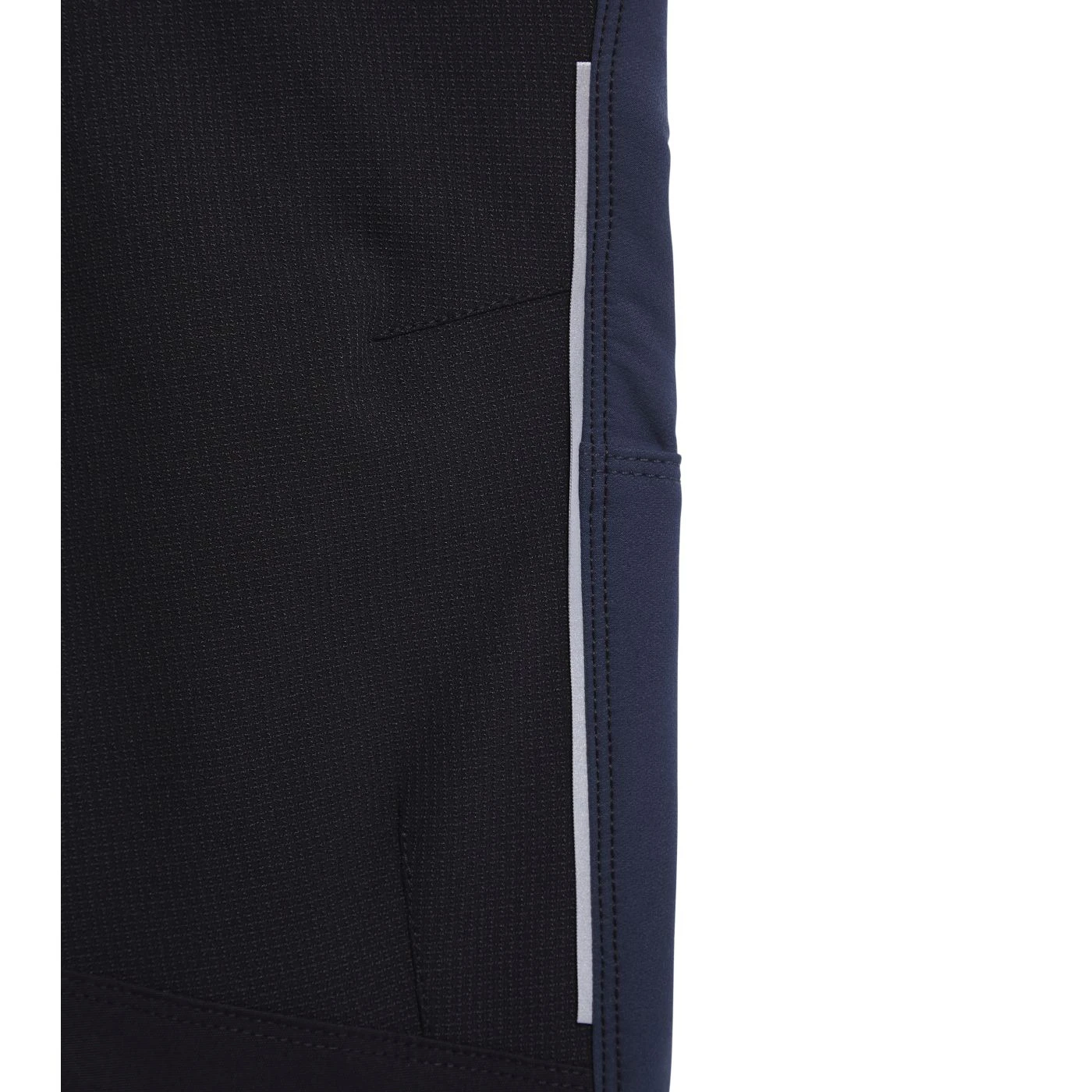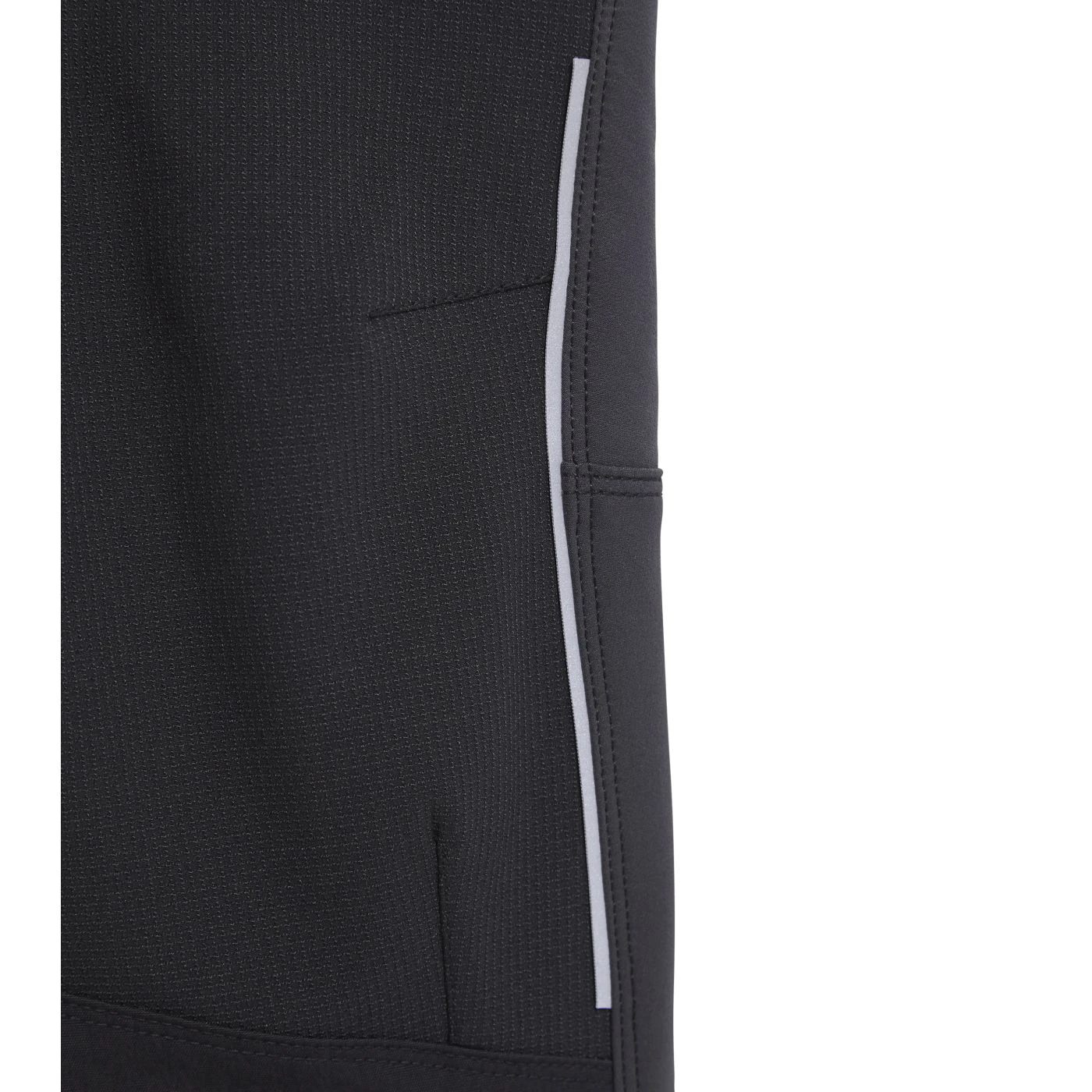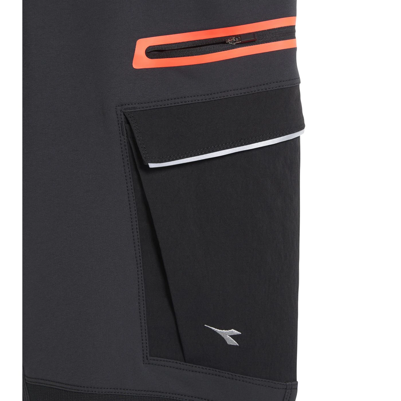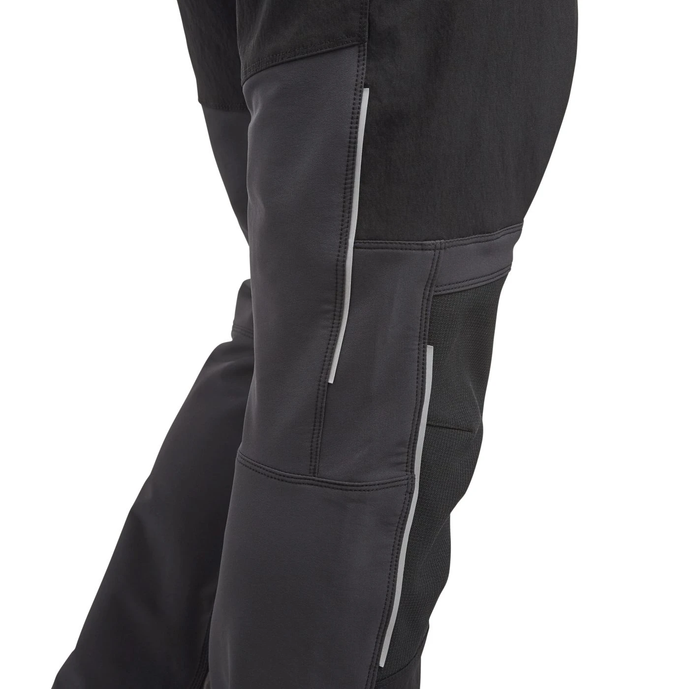 Stretchy mixed-material cargo trousers. Contoured waistband with stretch details on the sides for increased comfort. Two spacious cargo pockets with zip and velcro. Side zip with contrasting heat-sealed neon tape. Abrasion-resistant fabric inserts. Reflective details. Press stud-adjustable length.
