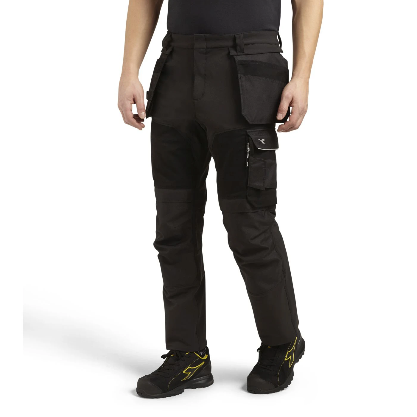 Stretch nylon-polyester performance trousers. Contoured waistband with stretch details on the sides for increased comfort. Crotch insert for greater range of movement. Open front pockets. Three cargo pockets on the side. Ruler pocket on the side with hammer loop. Detachable multi-functional outer pockets with press-stud button and zip. Two back pockets. Abrasion-resistant fabric knee pad that opens from the top. Rear zips with mesh netting for increased breathability. Concealed button. Ergonomic leg and adjustable length with press-stud buttons; reinforced heel area with abrasion-resistant fabric. Reflective details for better visibility.