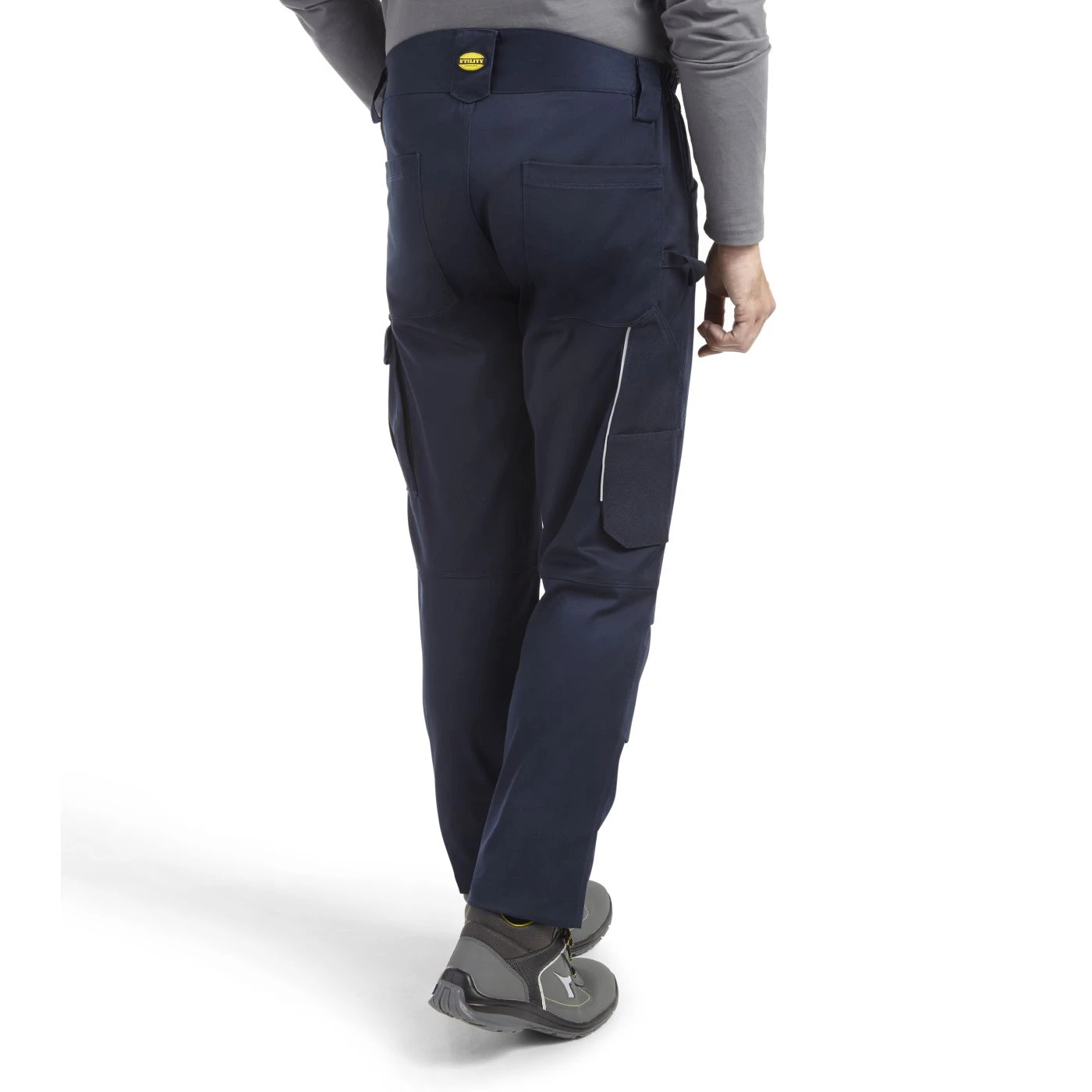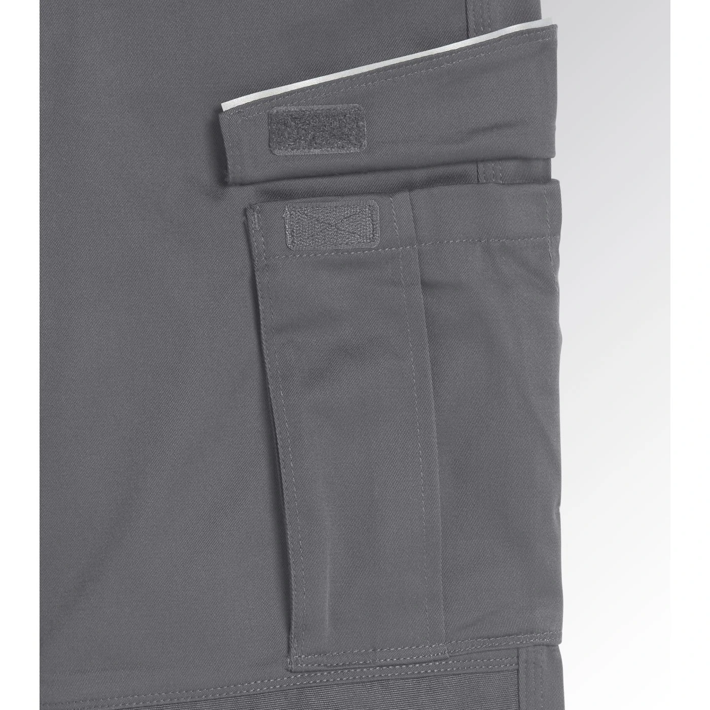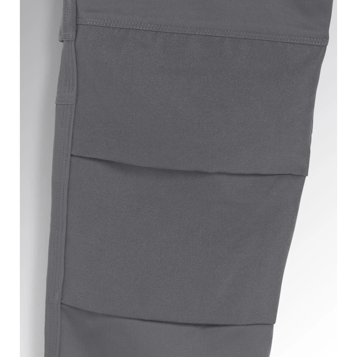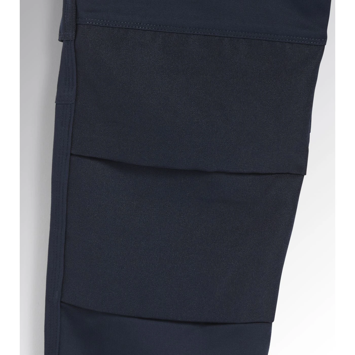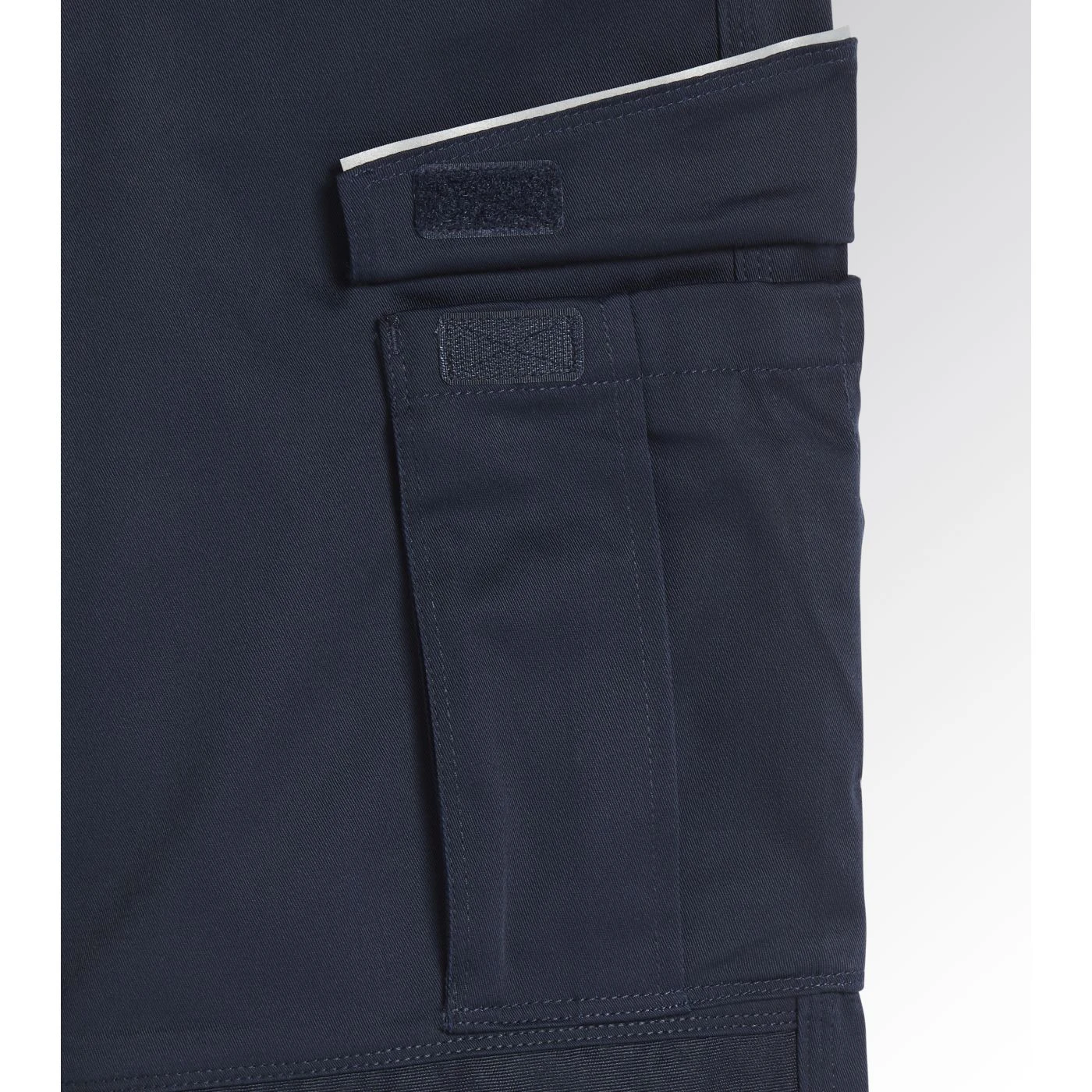 Trousers in stretch polyester, cotton and elastane twill with knee pad pockets, side pocket, reflective details, tape measure pocket, hammer holder, elasticated waistband, triple stitching. Contrasts in abrasion-resistant canvas.