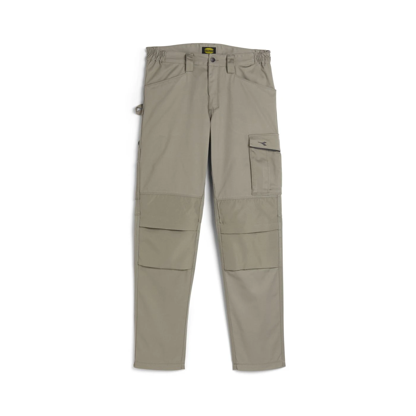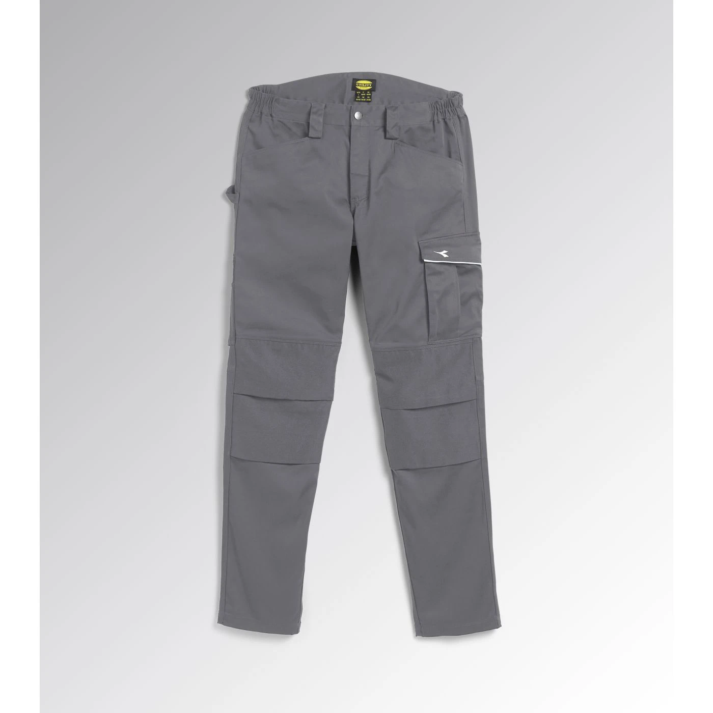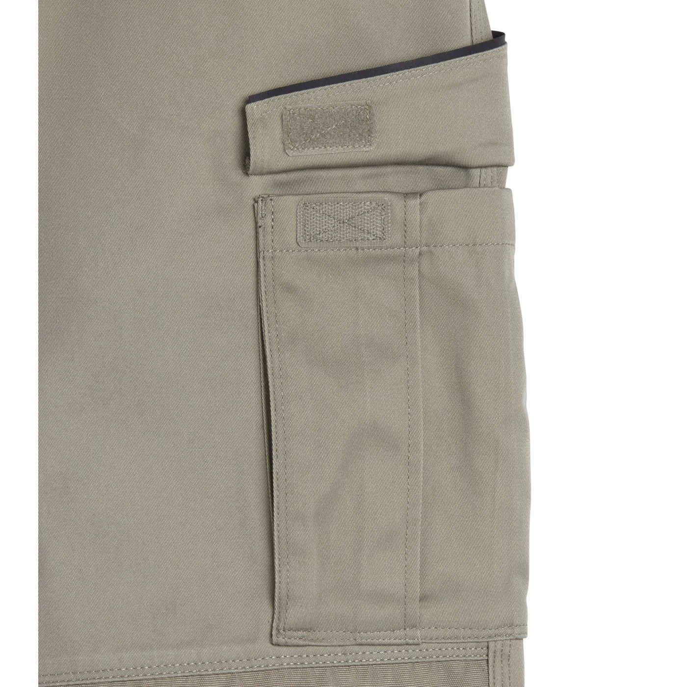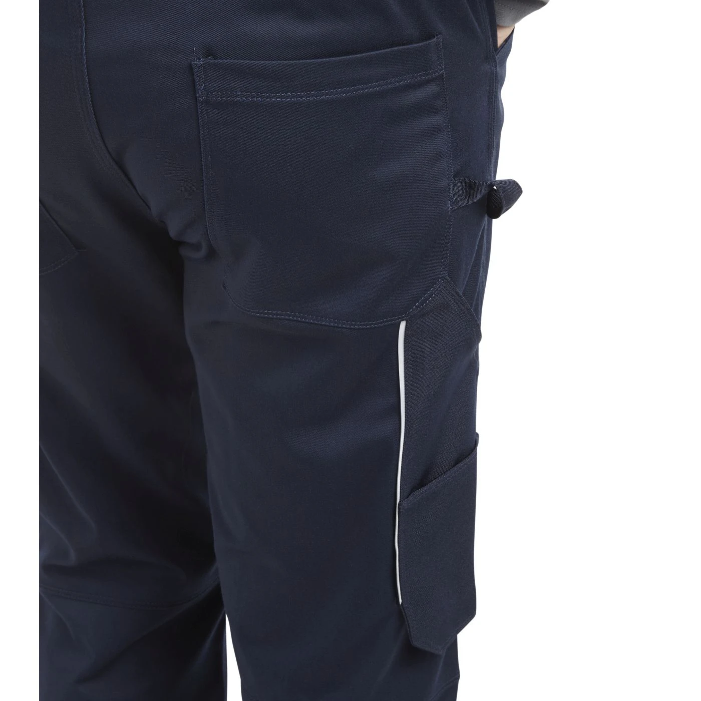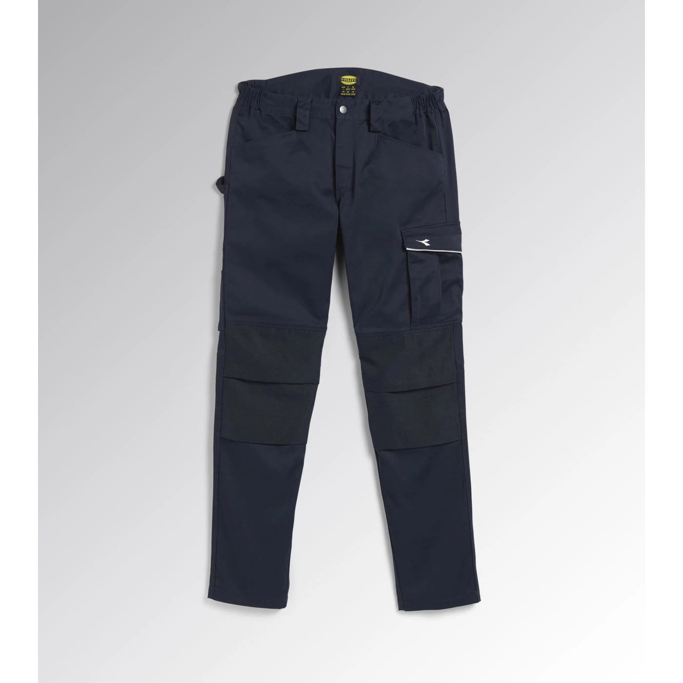 Trousers in stretch polyester, cotton and elastane twill with knee pad pockets, side pocket, reflective details, tape measure pocket, hammer holder, elasticated waistband, triple stitching. Contrasts in abrasion-resistant canvas.
