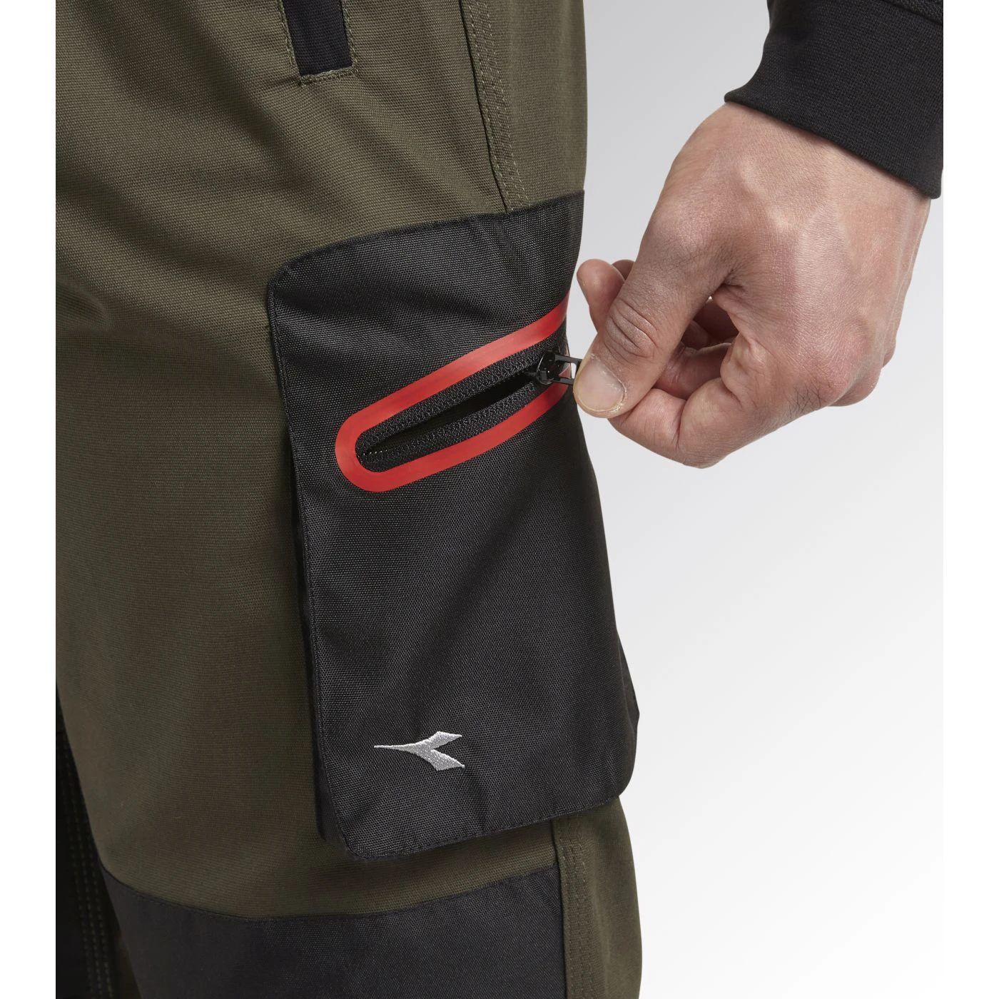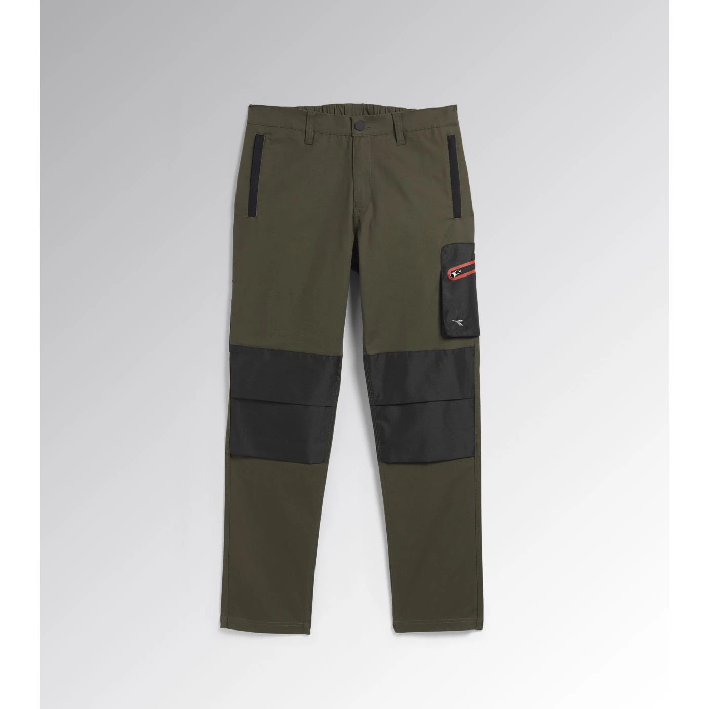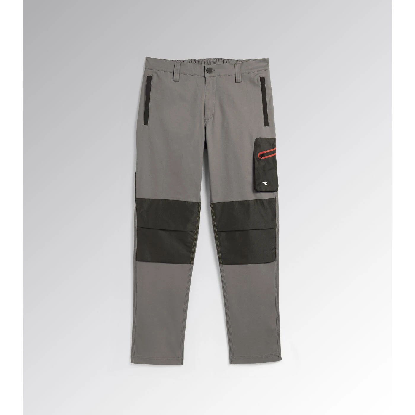 Trousers with knee pads in stretch cotton canvas and contrasting abrasion-resistant polyester Oxford fabric, zip pocket on side with red heat-taped detailing and zip hand pockets. Elastic waist, ruler and hammer holder, triple stitching.