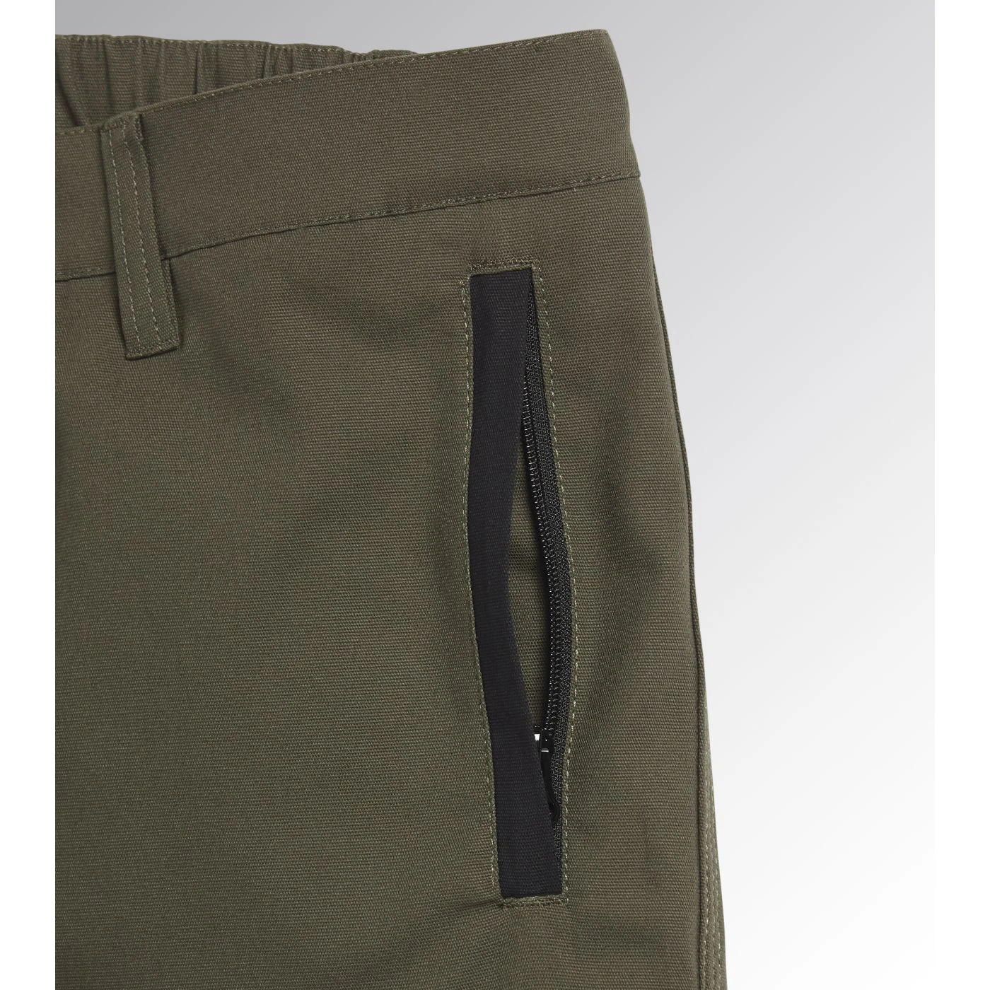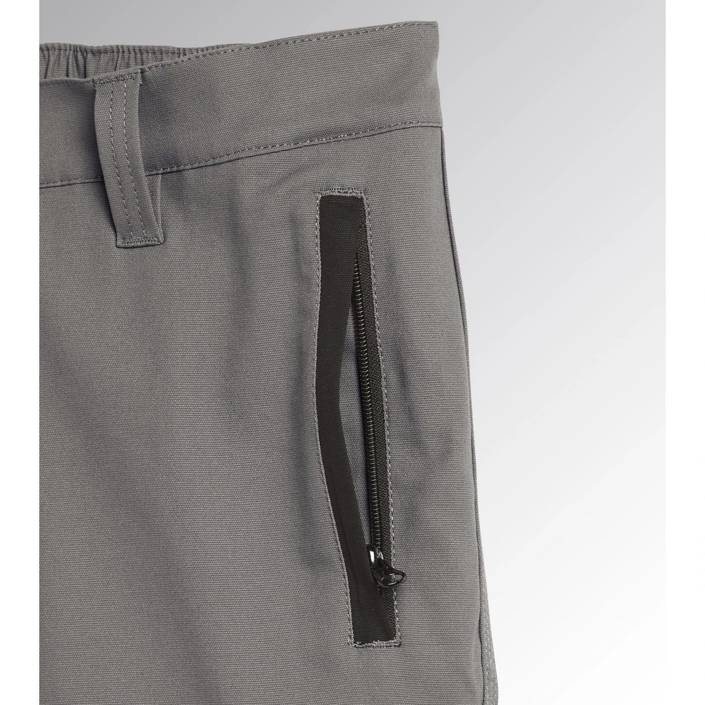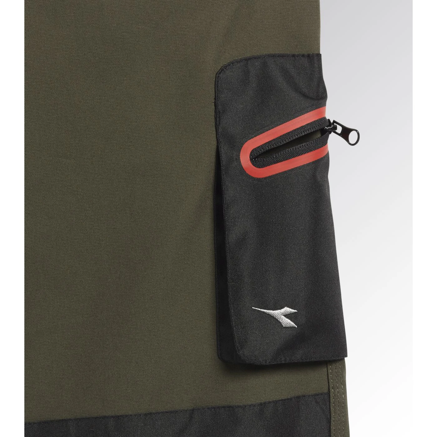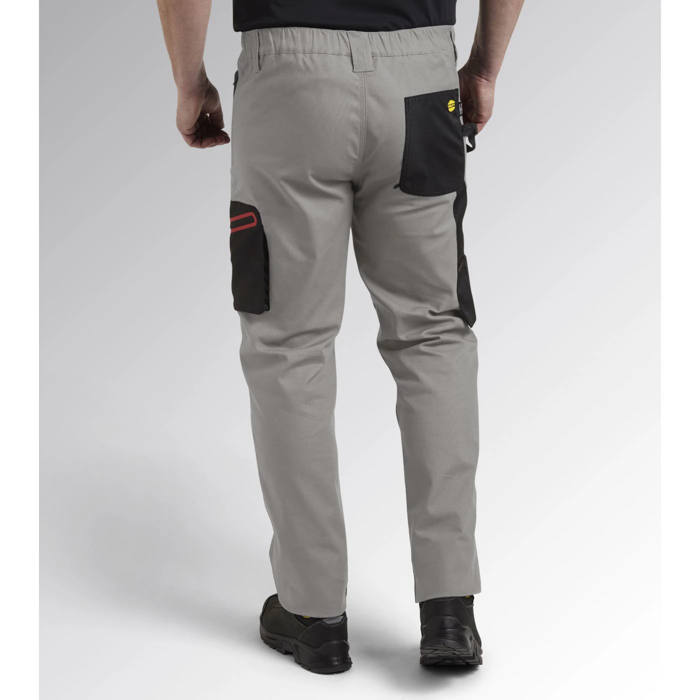 Trousers with knee pads in stretch cotton canvas and contrasting abrasion-resistant polyester Oxford fabric, zip pocket on side with red heat-taped detailing and zip hand pockets. Elastic waist, ruler and hammer holder, triple stitching.