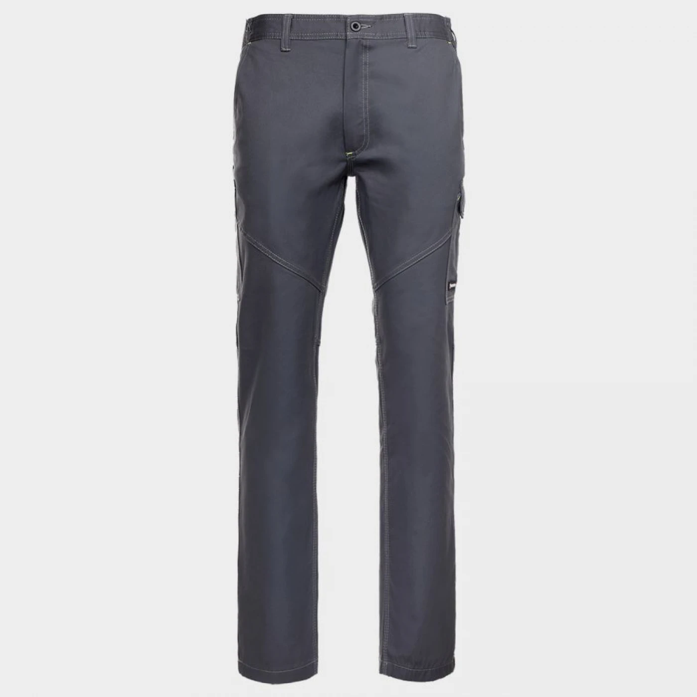 Pantaloni unisex ce pot fi purtați în diferite anotimpuri, cu părți elastice pe lateral și găici pentru centură în talie, închidere cu fermoar și nasture din plastic, două buzunare față cu croială clasică, un buzunar lateral LOCK SYSTEM, un buzunar dedicat ruletei de măsurat, două buzunare spate, unul deschis și unul cu clapă și închidere tip velcro, inserții și cusături contrastante, benzi reflectorizante pe buzunarul spate, cusături triple. Nasture cui de culoare albă. Cusătură în ton, cu întărituri contrastante de culoare galben fluorescent, pentru culoarea bleumarin identică.