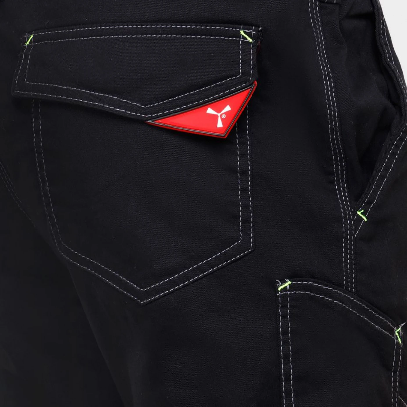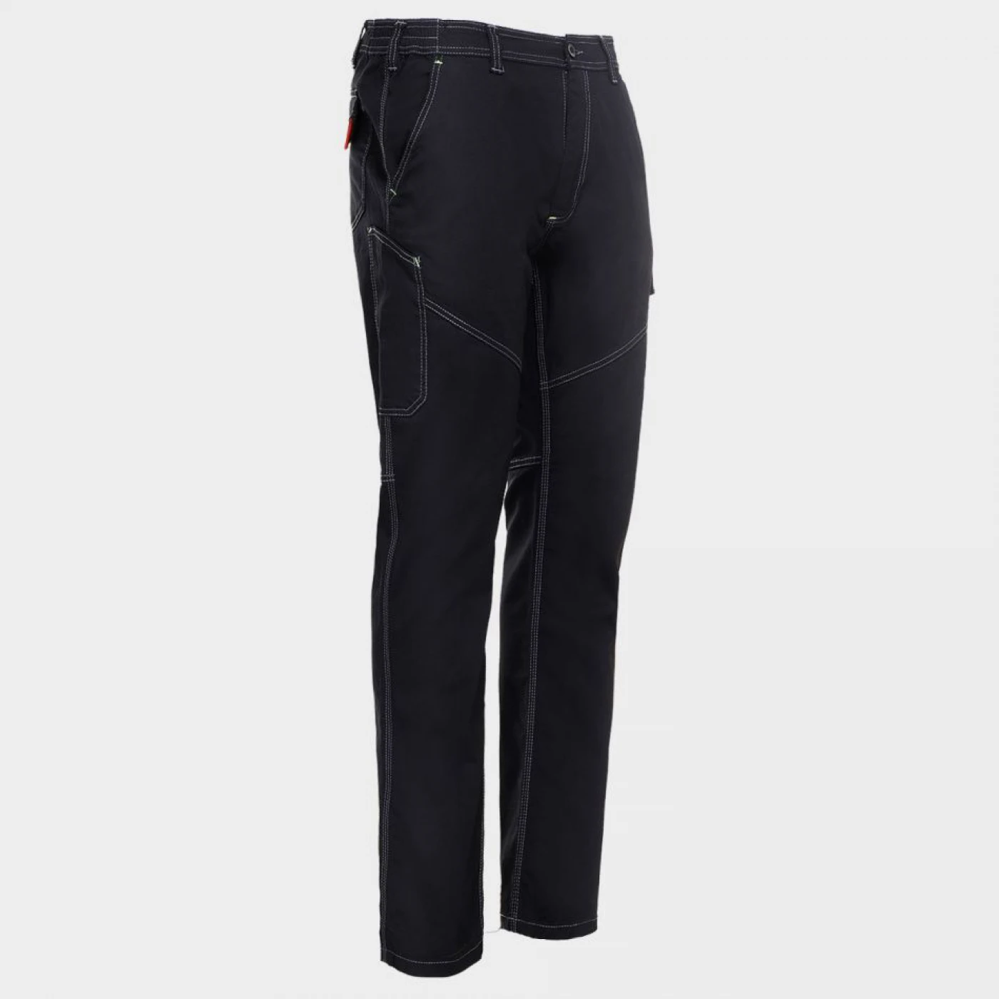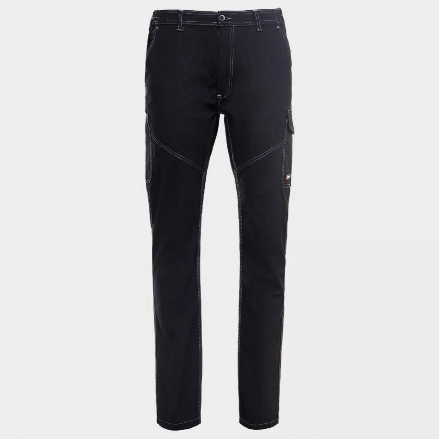 Pantaloni unisex ce pot fi purtați în diferite anotimpuri, cu părți elastice pe lateral și găici pentru centură în talie, închidere cu fermoar și nasture din plastic, două buzunare față cu croială clasică, un buzunar lateral LOCK SYSTEM, un buzunar dedicat ruletei de măsurat, două buzunare spate, unul deschis și unul cu clapă și închidere tip velcro, inserții și cusături contrastante, benzi reflectorizante pe buzunarul spate, cusături triple. Nasture cui de culoare albă. Cusătură în ton, cu întărituri contrastante de culoare galben fluorescent, pentru culoarea bleumarin identică.