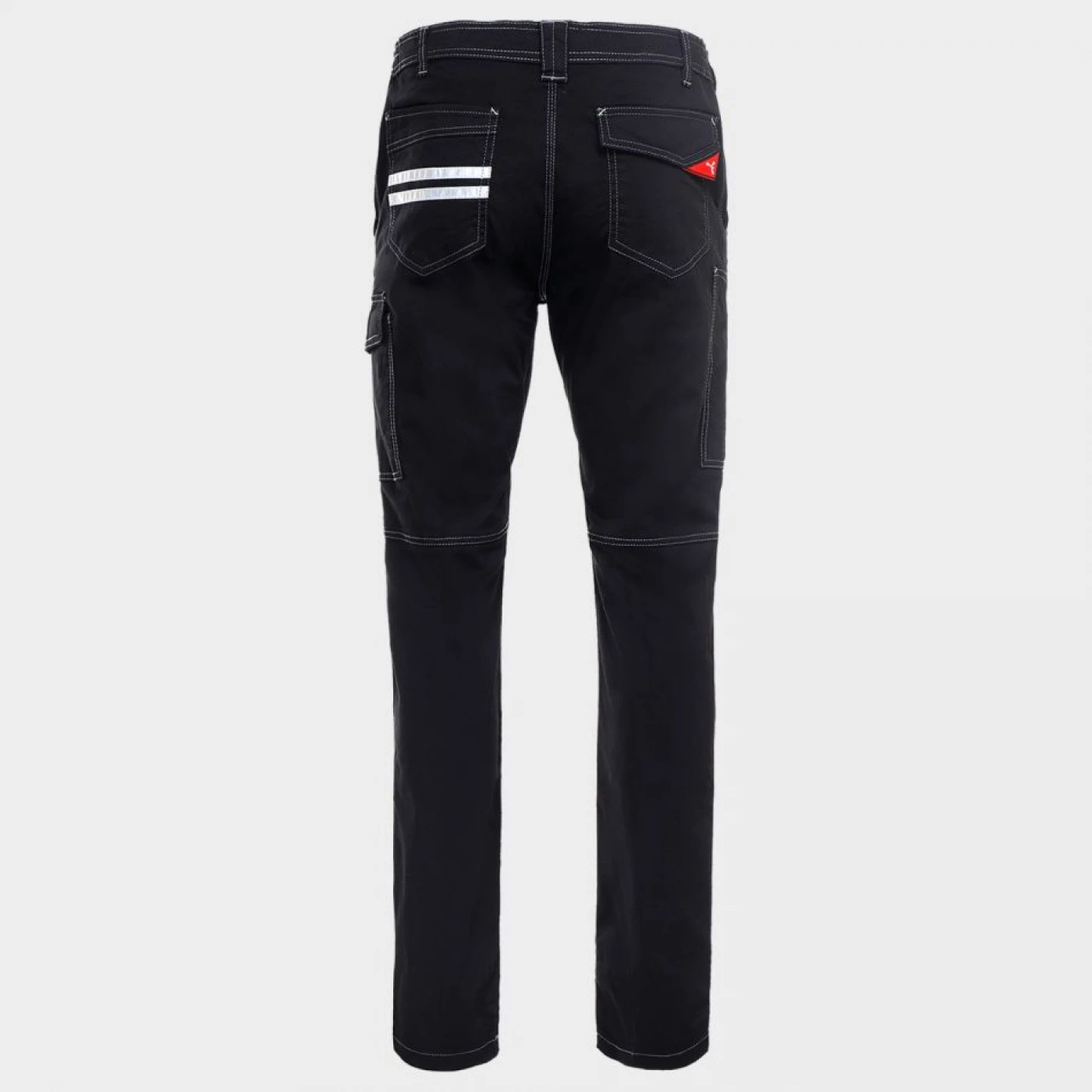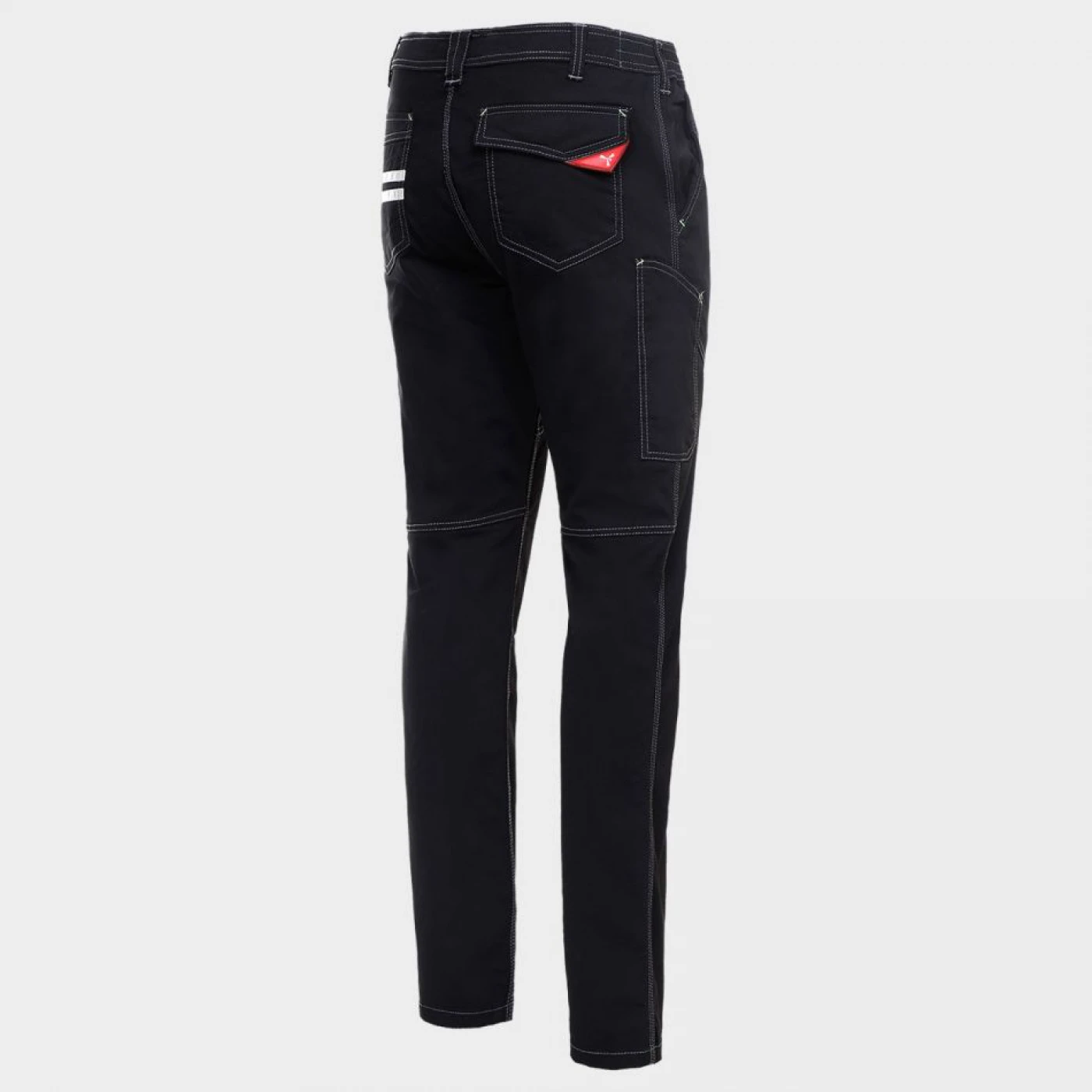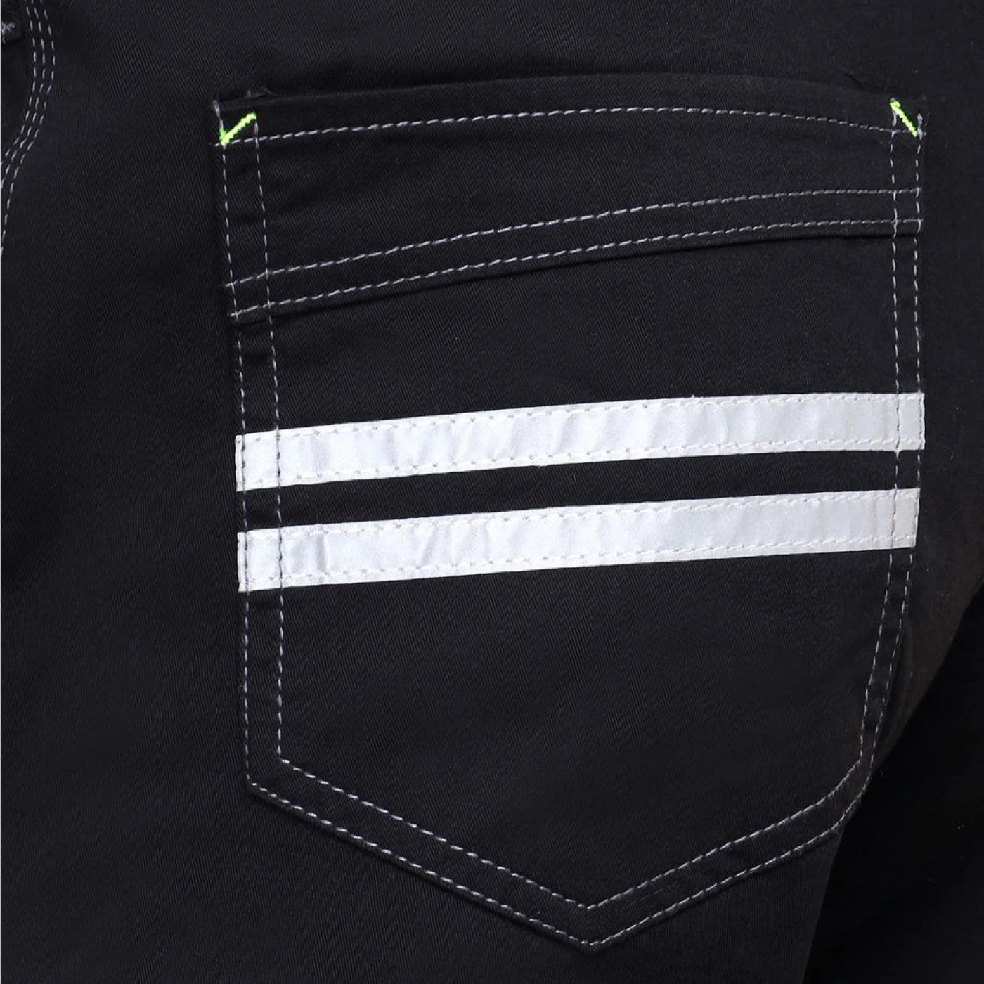 Pantaloni unisex ce pot fi purtați în diferite anotimpuri, cu părți elastice pe lateral și găici pentru centură în talie, închidere cu fermoar și nasture din plastic, două buzunare față cu croială clasică, un buzunar lateral LOCK SYSTEM, un buzunar dedicat ruletei de măsurat, două buzunare spate, unul deschis și unul cu clapă și închidere tip velcro, inserții și cusături contrastante, benzi reflectorizante pe buzunarul spate, cusături triple. Nasture cui de culoare albă. Cusătură în ton, cu întărituri contrastante de culoare galben fluorescent, pentru culoarea bleumarin identică.