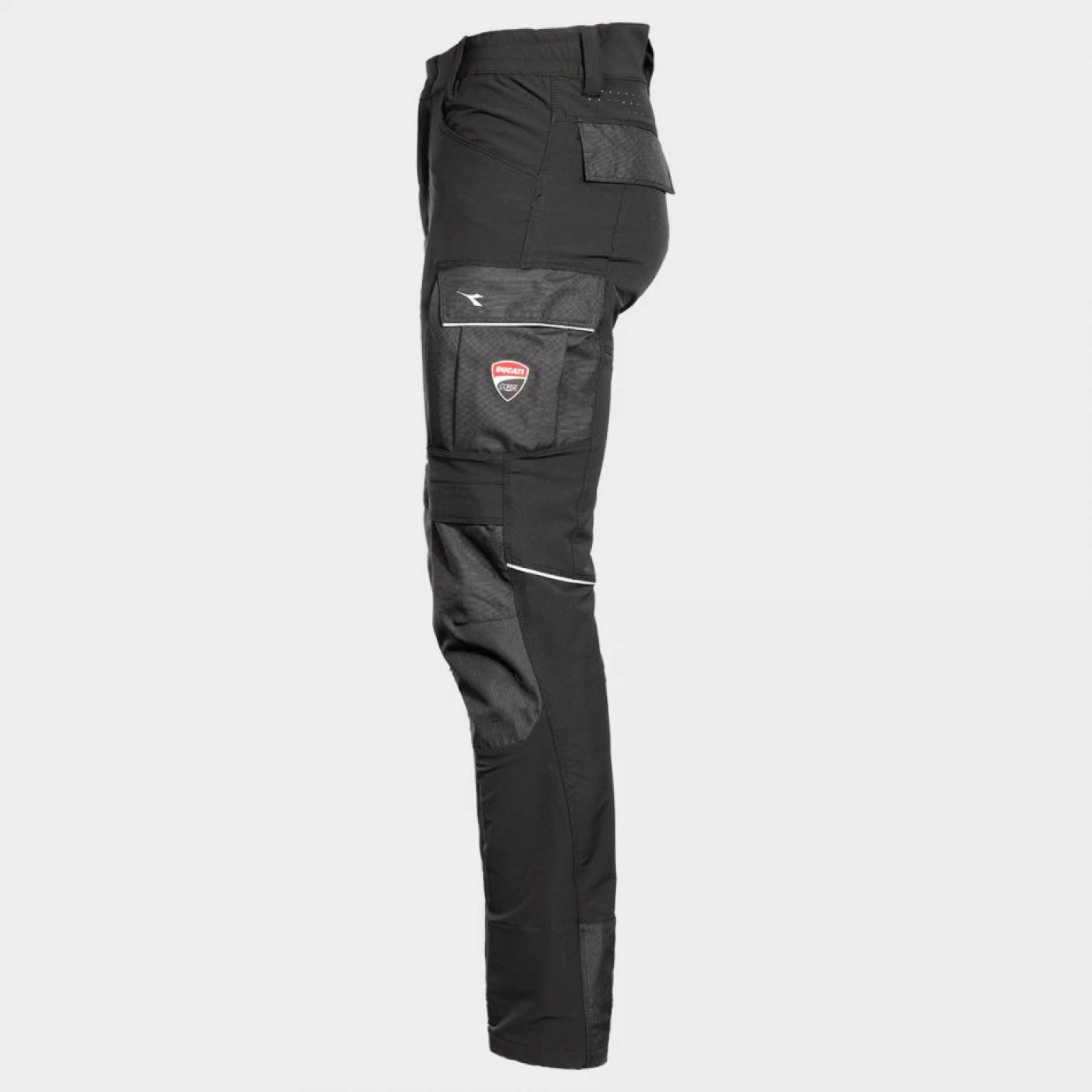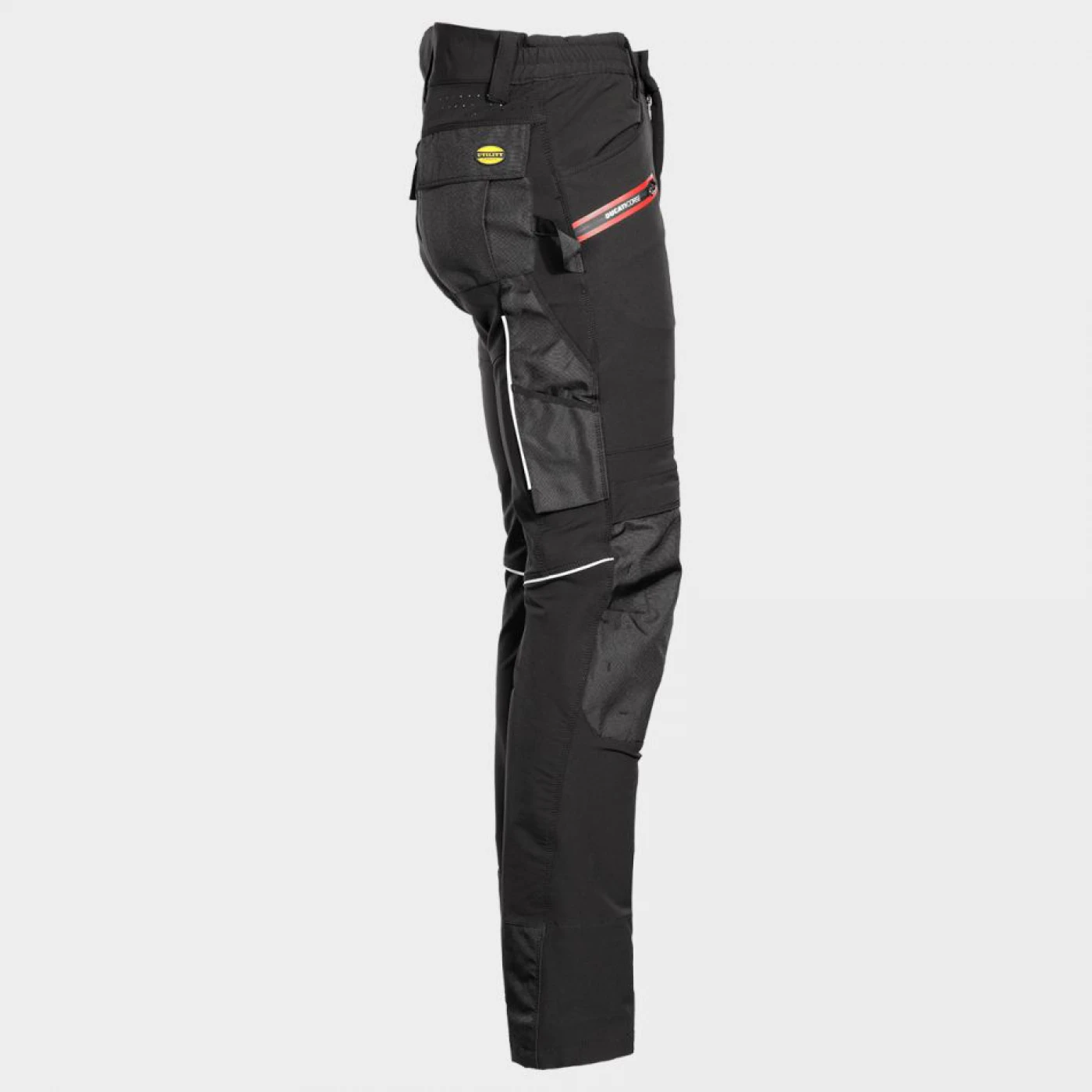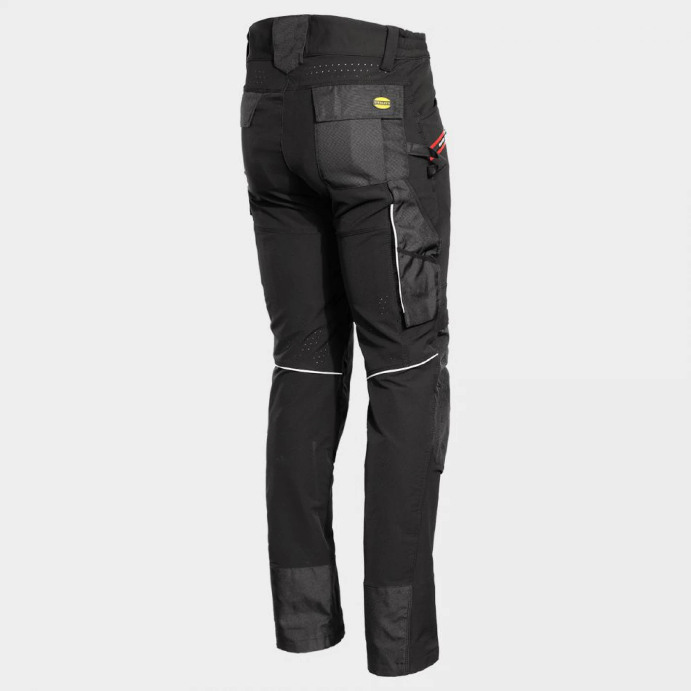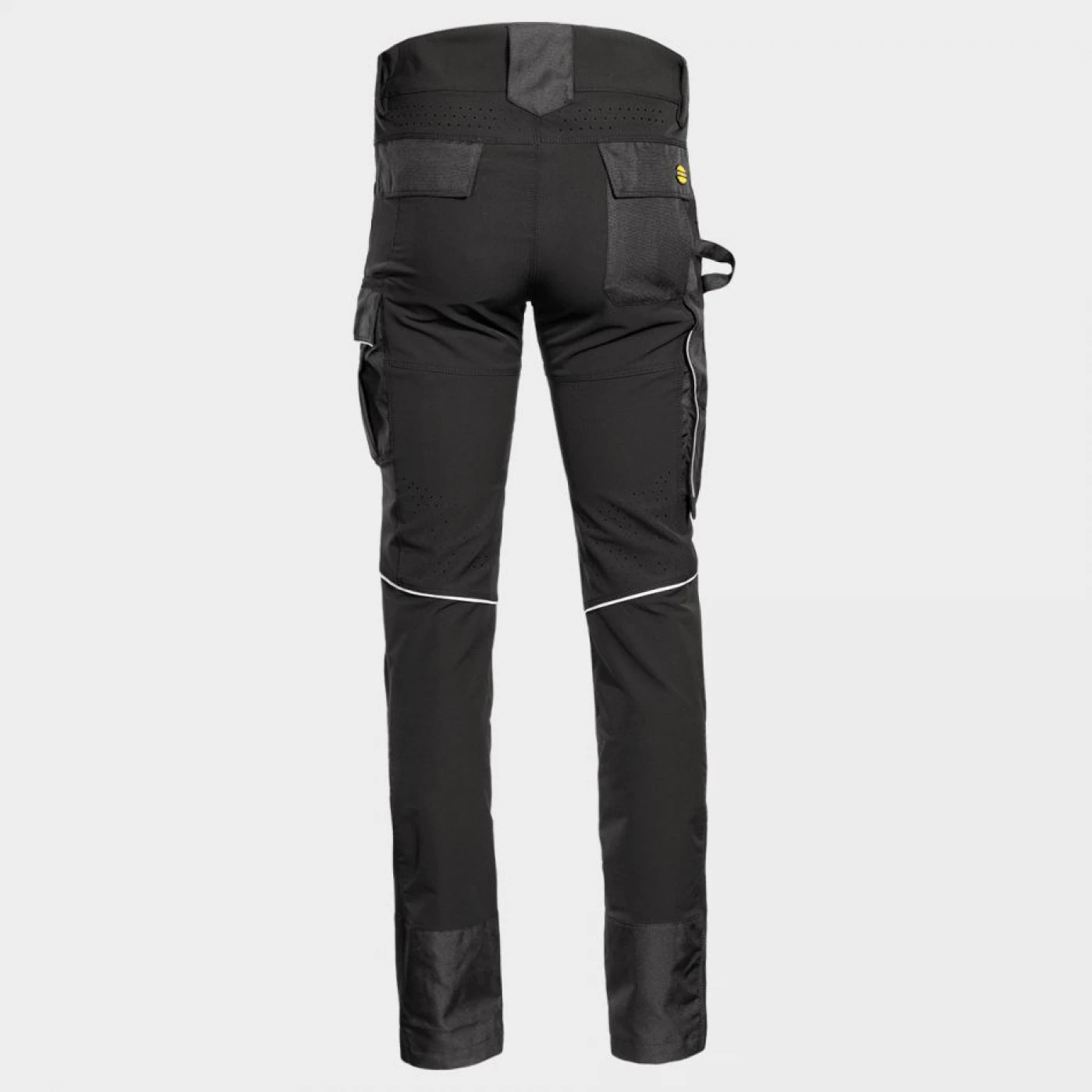 Pantaloni elastici impermeabili, curea cu detalii elastice din partea laterală pentru confort sporit și inserție în zona spatelui pentru o mai mare libertate de mișcare. Dispune de buzunare frontale deschise, un buzunar lateral dublu pentru instrumente și un buzunar pentru genunchi din material rezistent la abraziune, care se deschide din partea de sus. Caracteristicile suplimentare includ detalii reflectorizante, un nasture ascuns și un design ergonomic al picioarelor cu lungime reglabilă. MATERIAL: 54% nailon, 39% poliester, 7% elastan, 230 g/m²; genunchiere și inel pentru ciocan - 100% poliester hidrofug