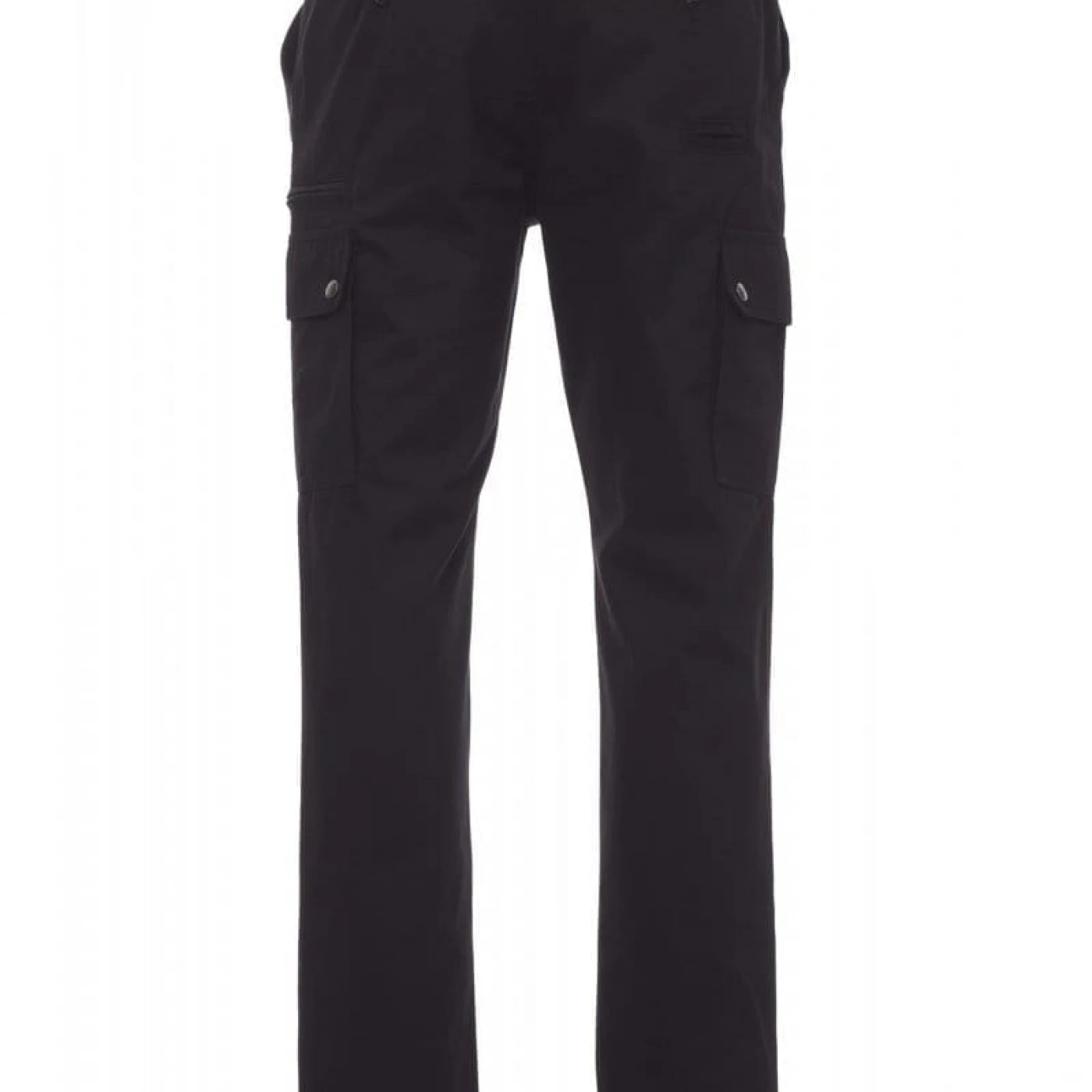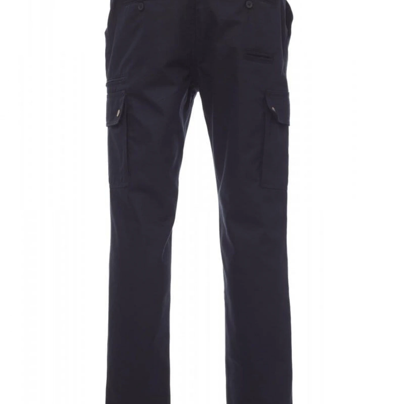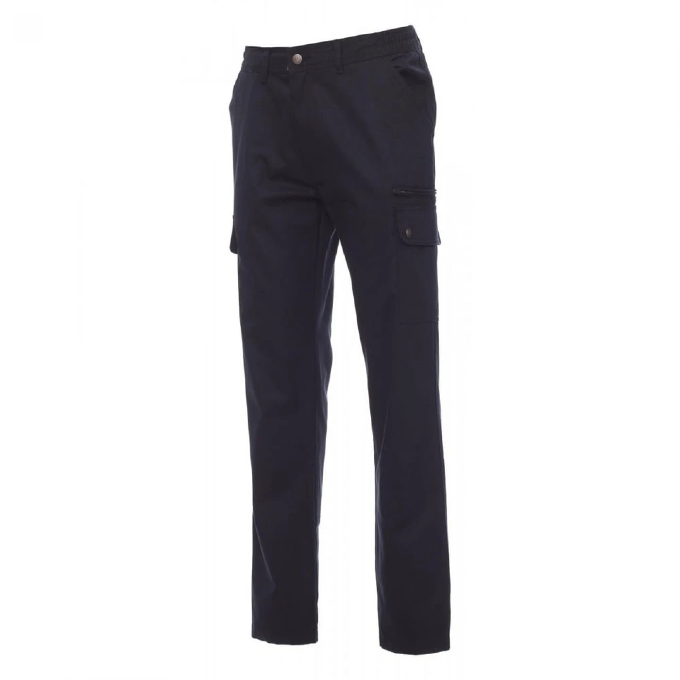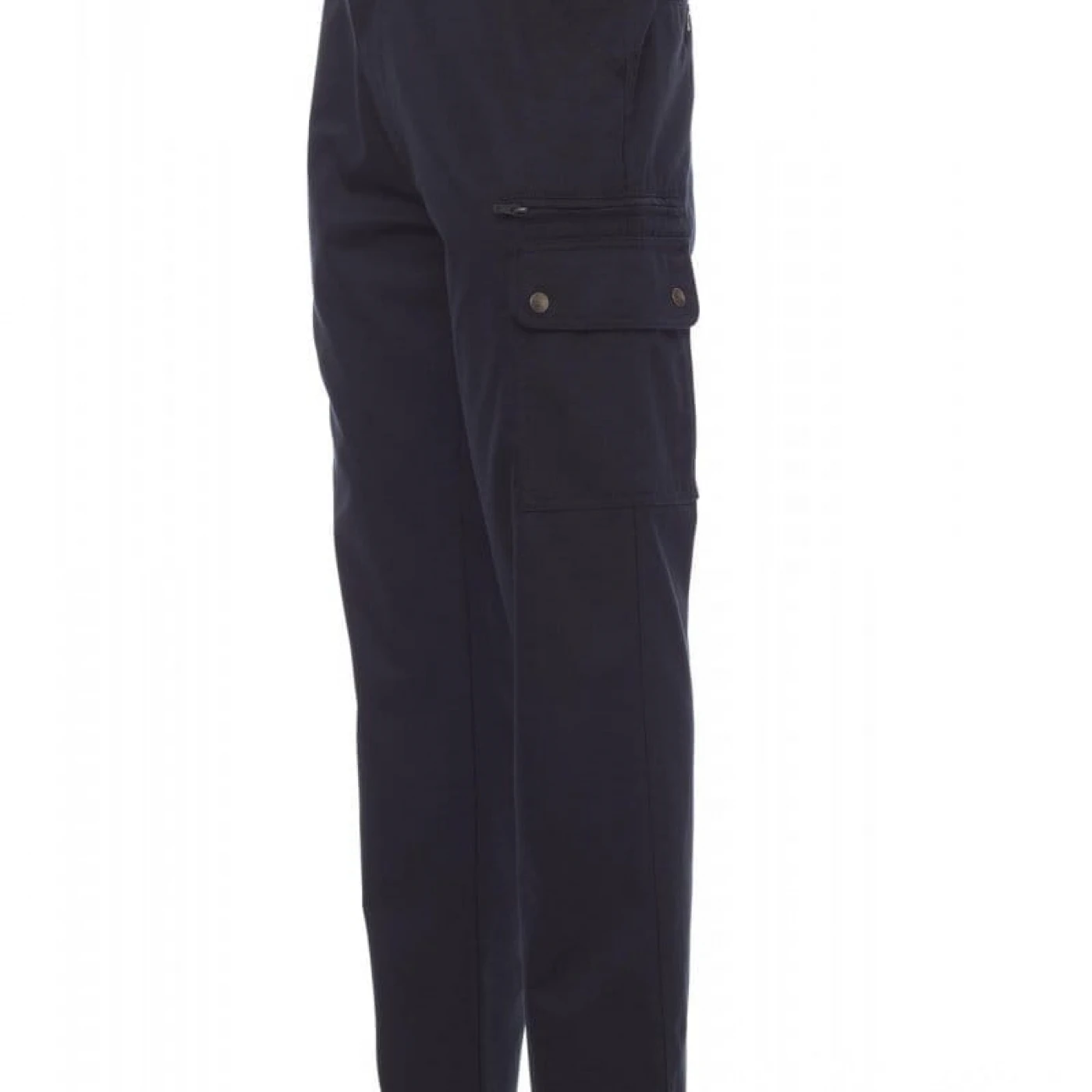 Pantaloni talie pentru barbati, confectionati din bumbac 100%, cu elastic pe lateral și găici pentru curea. Închiderea se face cu fermoar si nasture metalic. Sunt echipati cu doua buzunare frontale cu croiala clasica, doua buzunare laterale cu clapete si capse metalice, un buzunar cu fermoar pe piciorul stang, un buzunar cu banda de masurat pe piciorul drept, doua buzunare cu fante la spate, prevazute cu nasturi si butoniere.