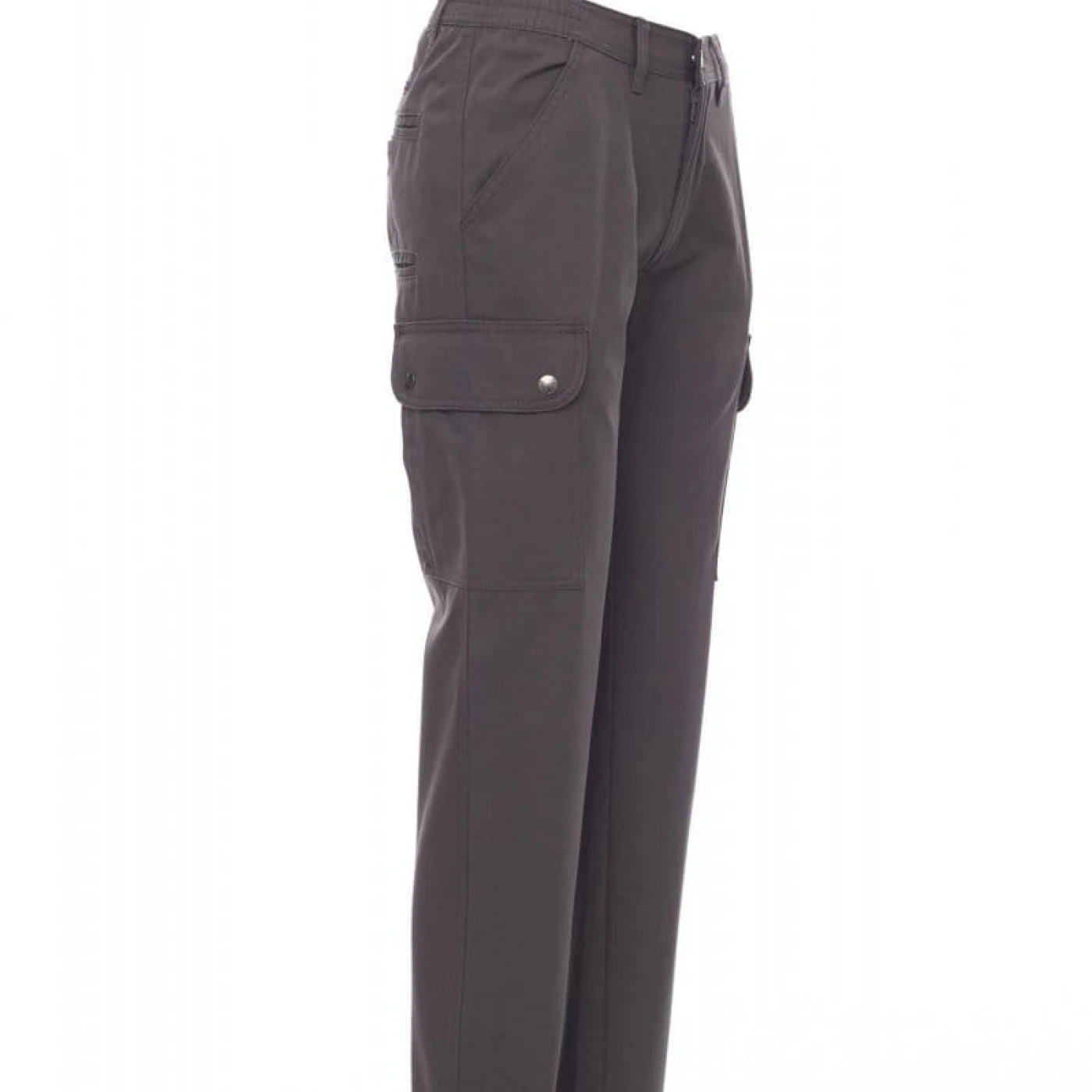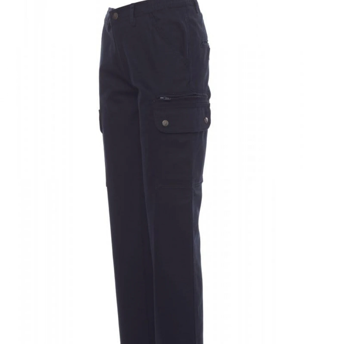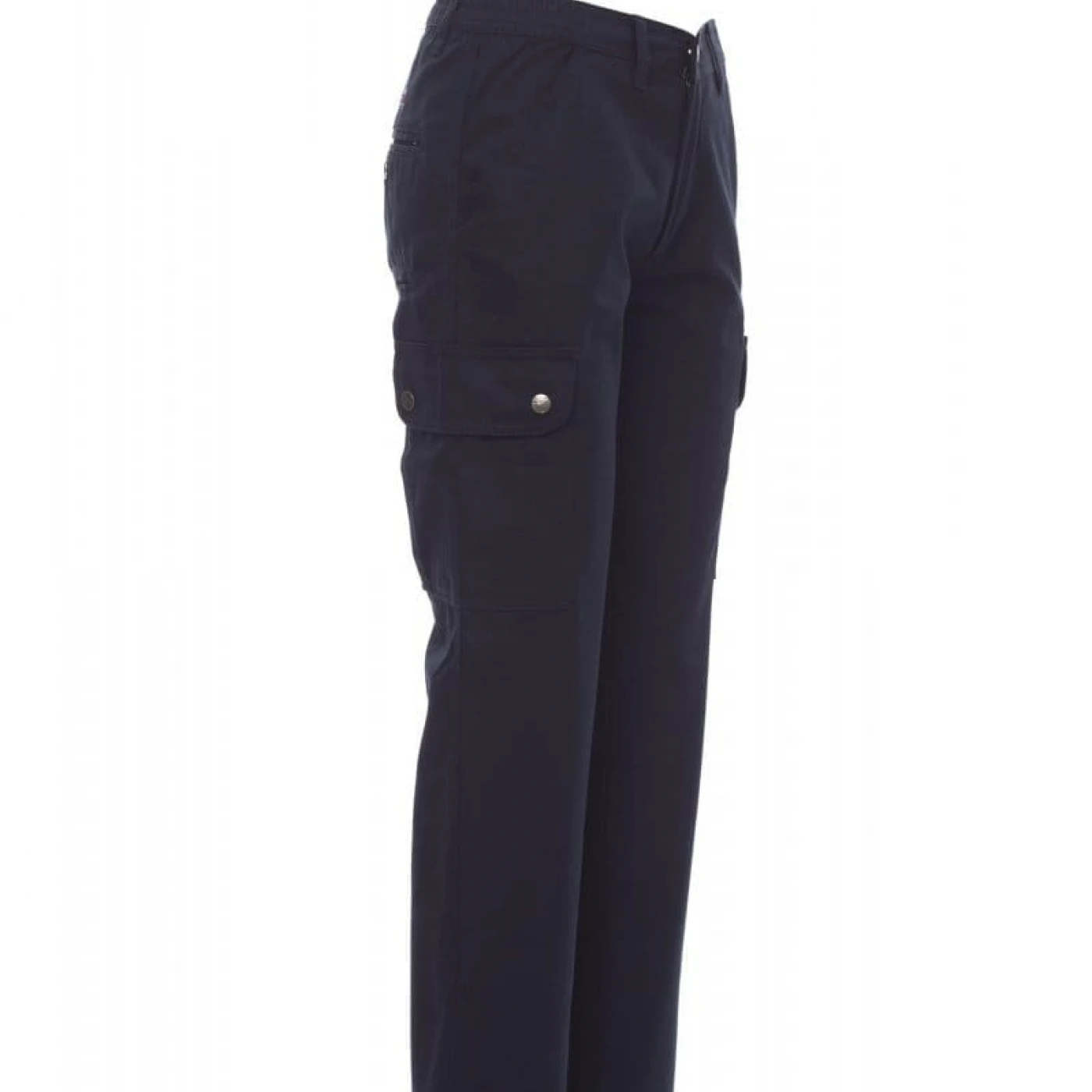 Pantaloni talie pentru femei, confectionati din bumbac 100%, cu elastic pe lateral și găici pentru curea. Închiderea se face cu fermoar si nasture metalic. Sunt echipati cu doua buzunare frontale cu croiala clasica, doua buzunare laterale cu clapete si capse metalice, un buzunar cu fermoar pe piciorul stang, un buzunar cu banda de masurat pe piciorul drept, doua buzunare cu fante la spate, prevazute cu nasturi si butoniere.